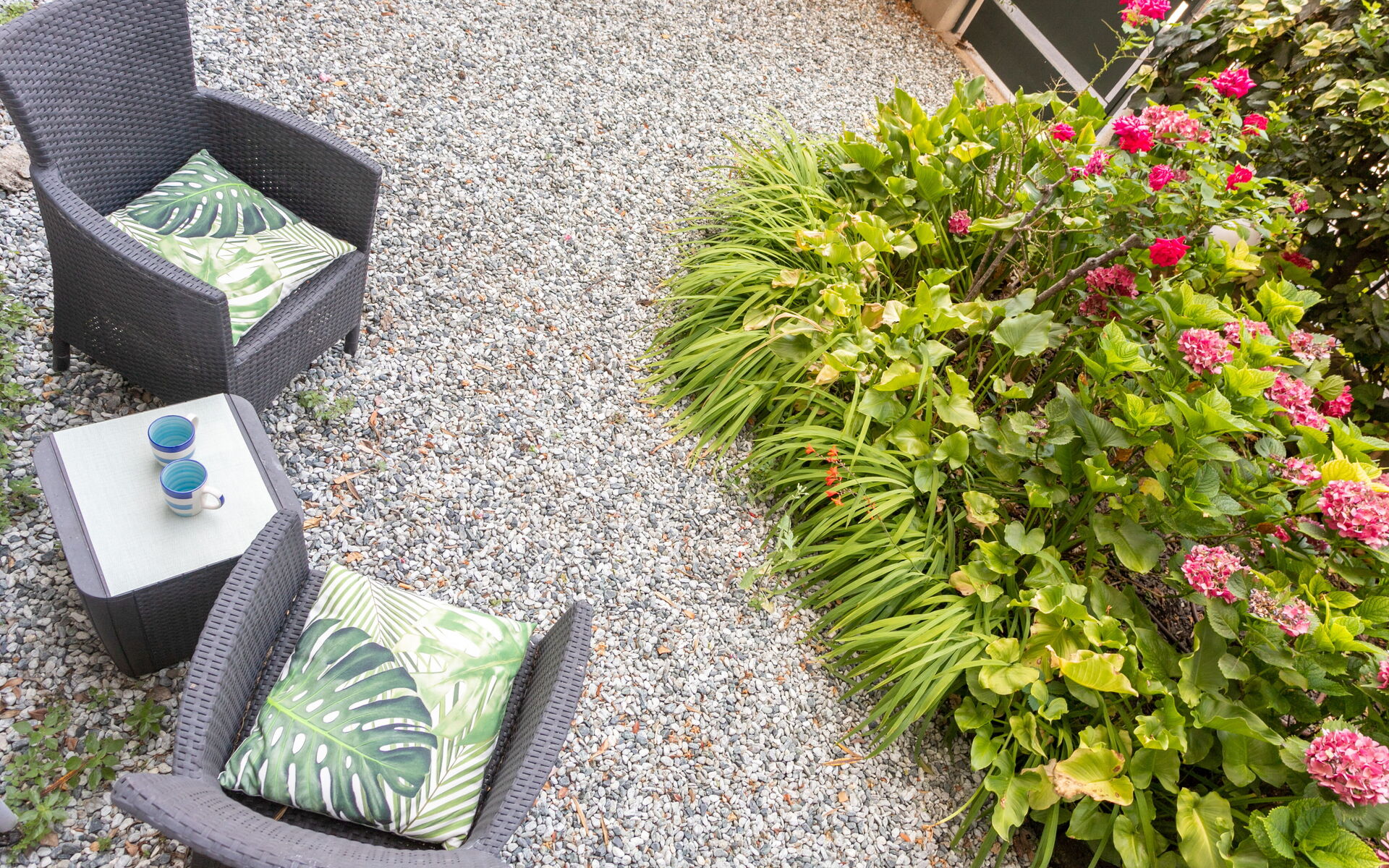 The private garden is a peaceful extension of the apartment and is furnished with an outdoor table and chairs, perfect for enjoying breakfast, a coffee, or a quiet moment outdoors.