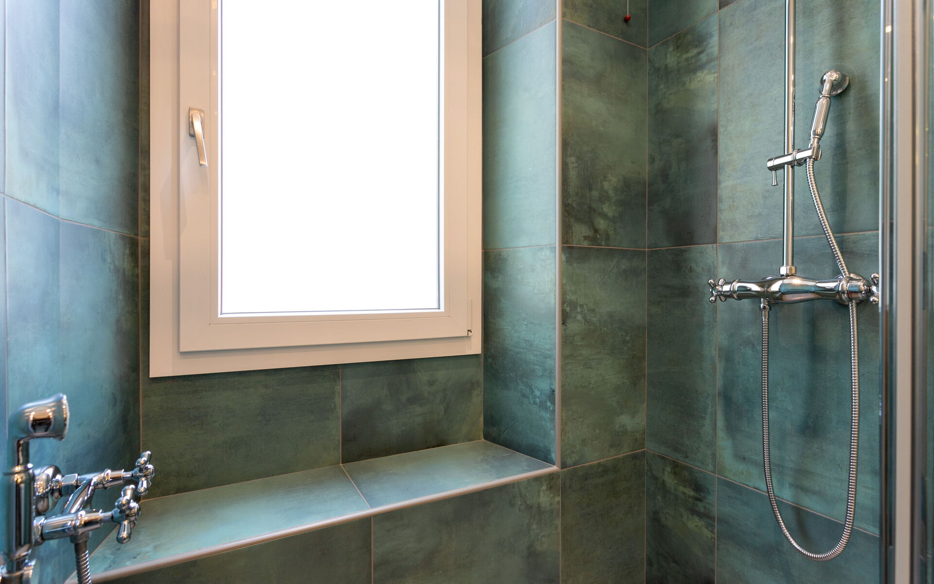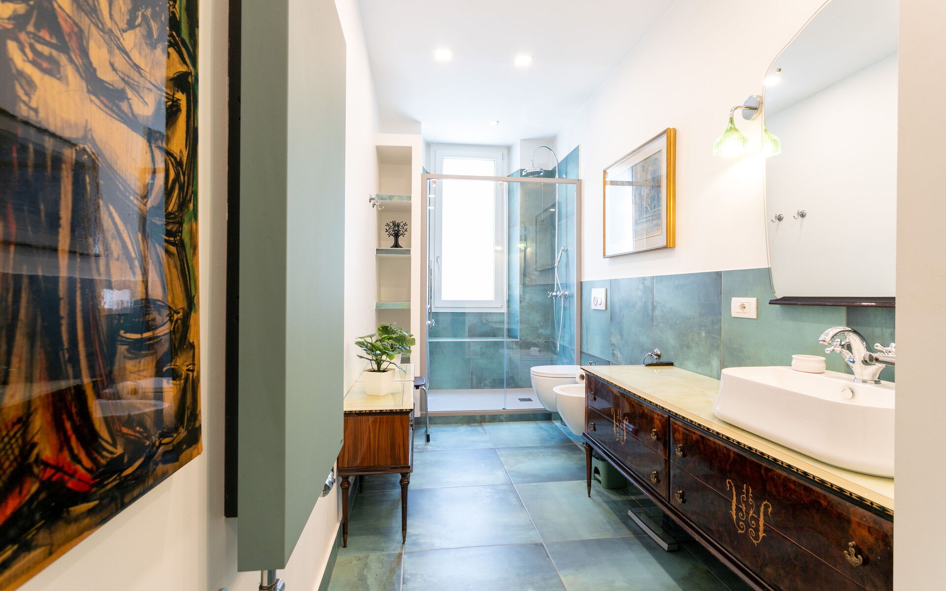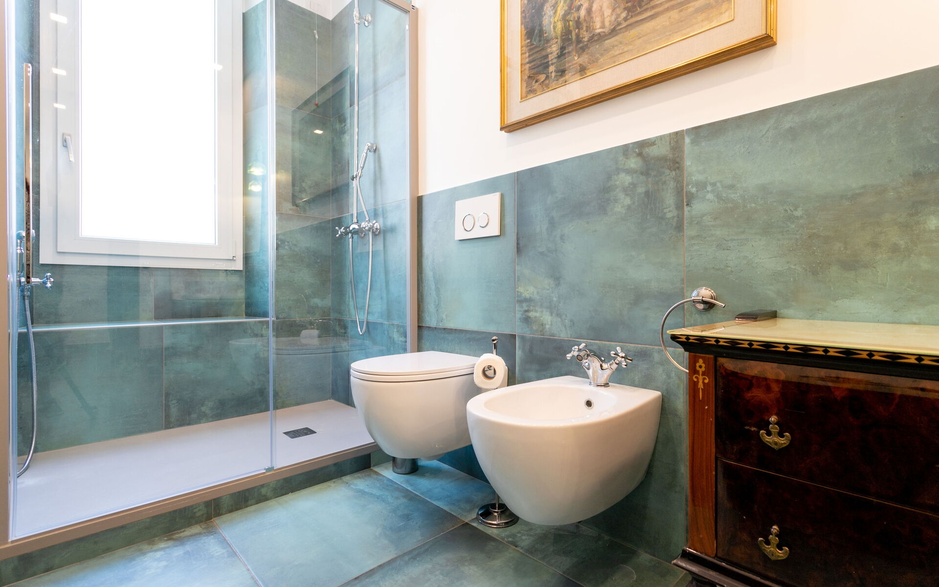The bathroom is particularly large and benefits from natural light thanks to a window. It features a generous shower, sink, bidet, and toilet.