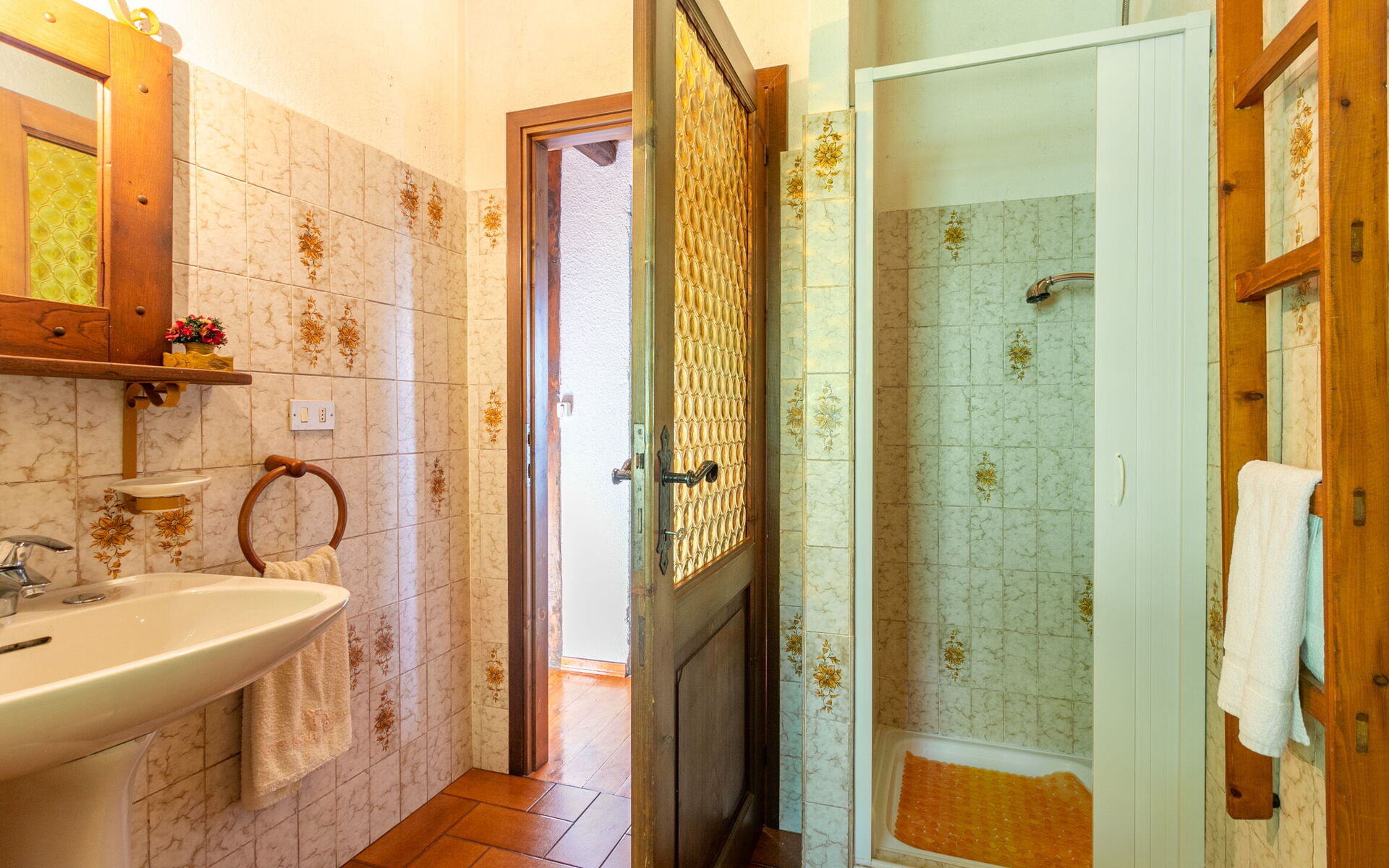 The sleeping area includes two bedrooms: one double and one with two single beds, offering comfortable accommodation for families or small groups. The bathroom is equipped with a shower, ensuring all the necessary comforts.
