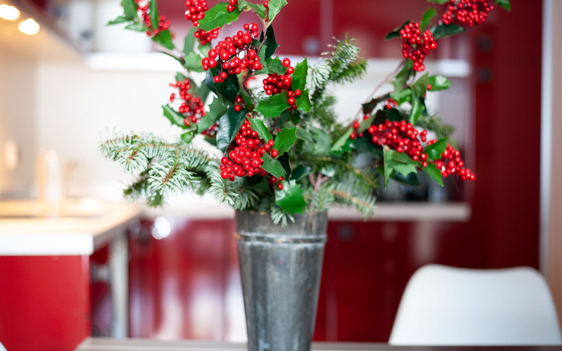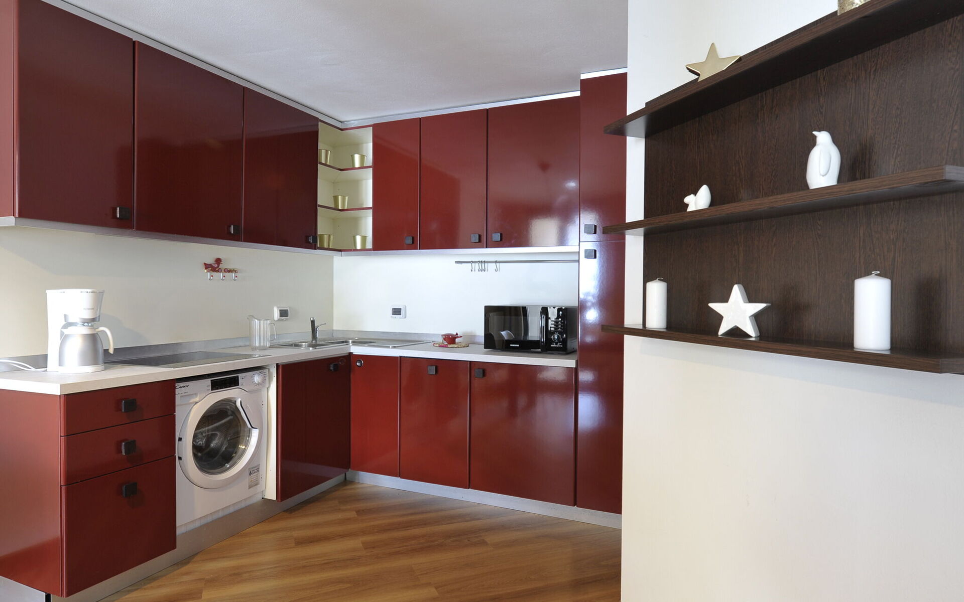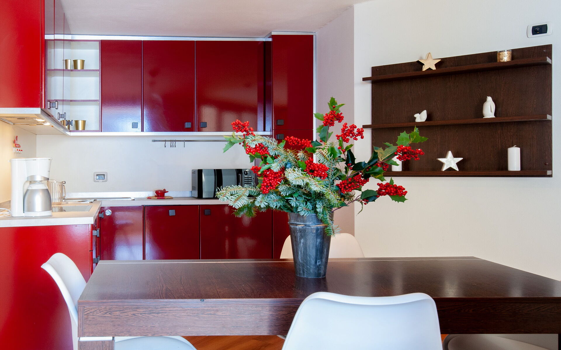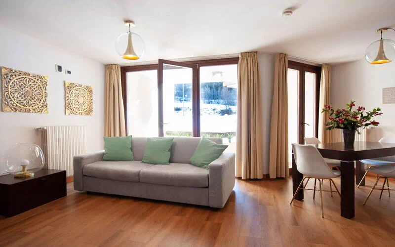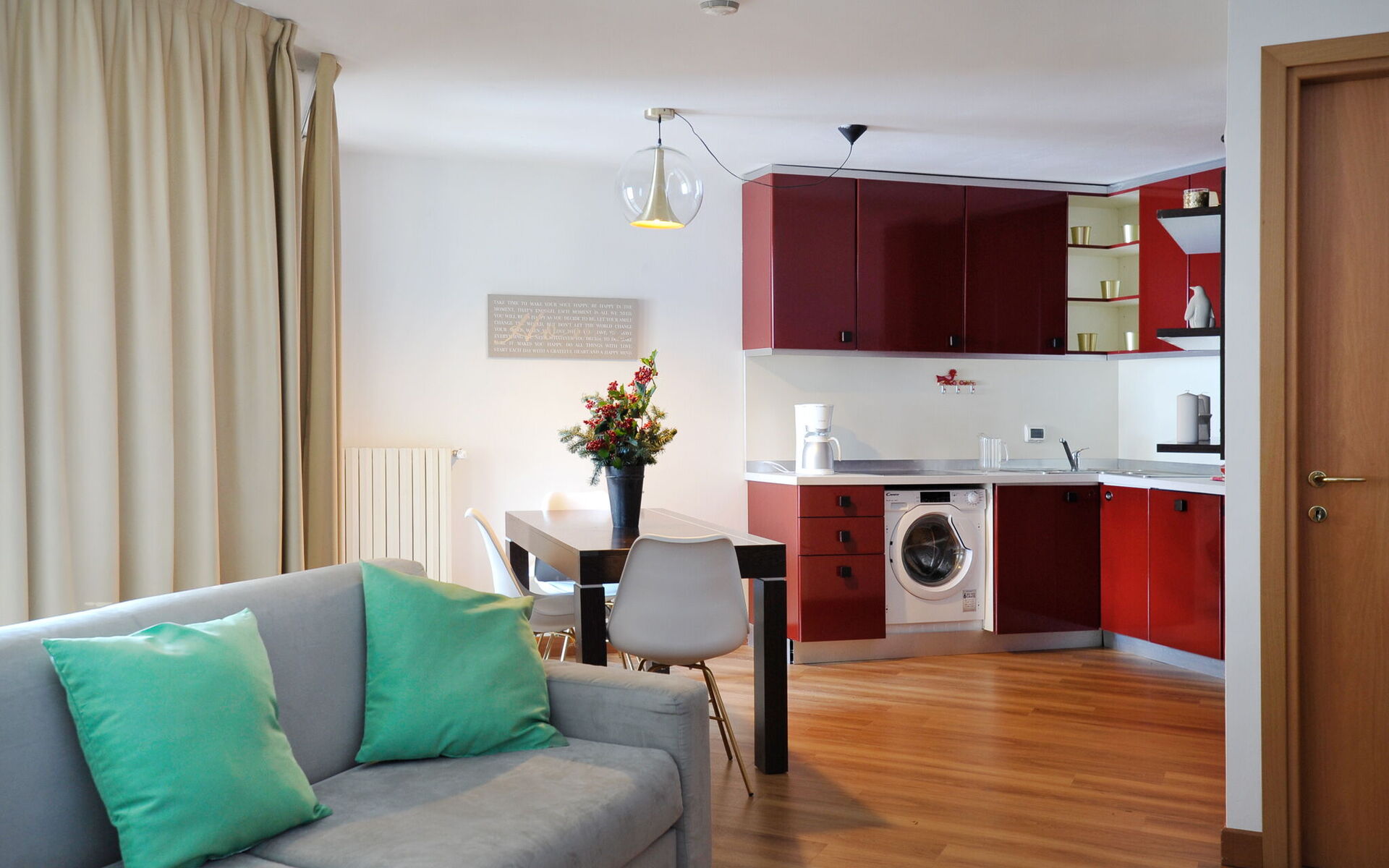 The apartment opens onto a bright day area, offering ample views of the garden and comprises a fully-equipped corner kitchen (with induction cooktop, fridge, microwave *, washing machine and dishwasher), a dining area with a wooden table with 5 chairs, and a relaxation corner featuring a comfortable double sofa bed, a pouf, a coffee table, a TV set and some shelves.