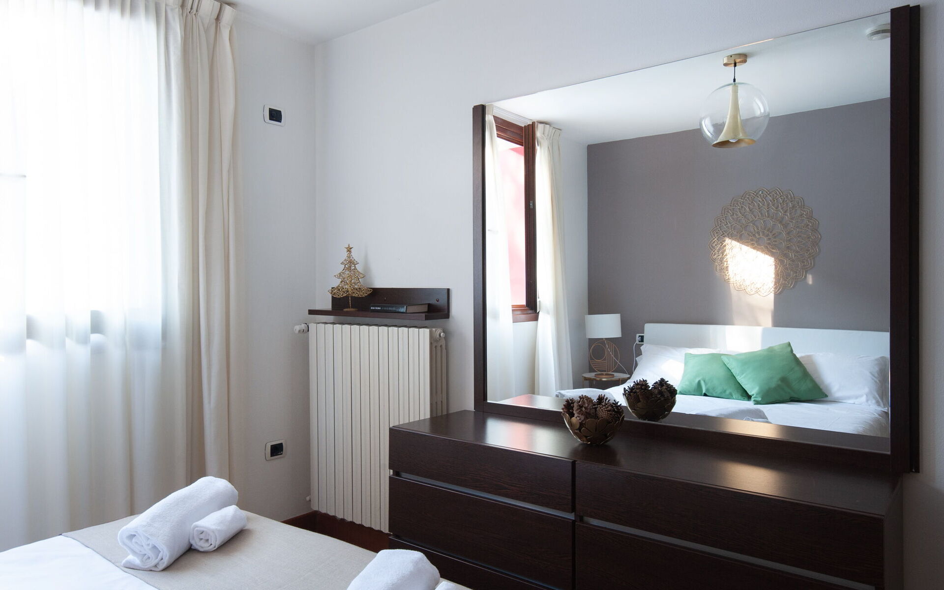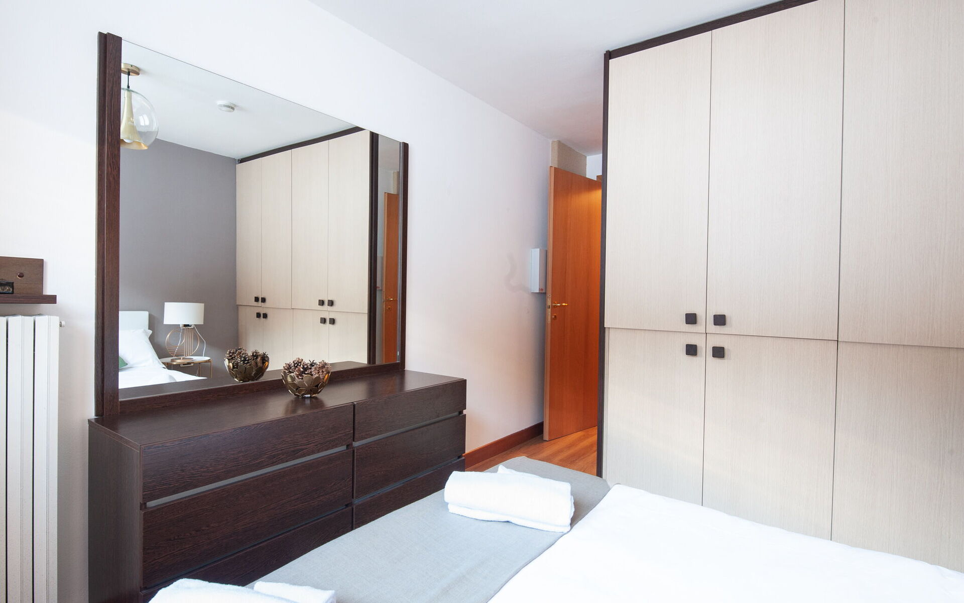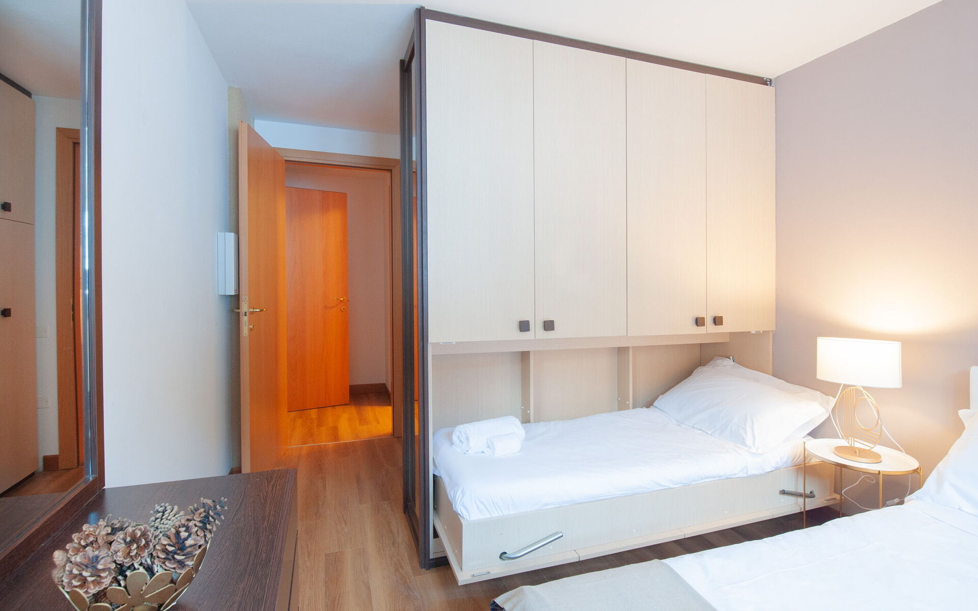 - a bedroom with a double bed, bedside tables, and a closet comprising a roll-out single bed for a further guest