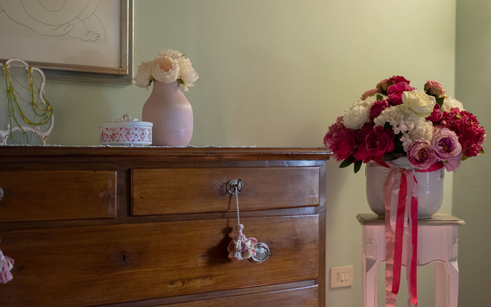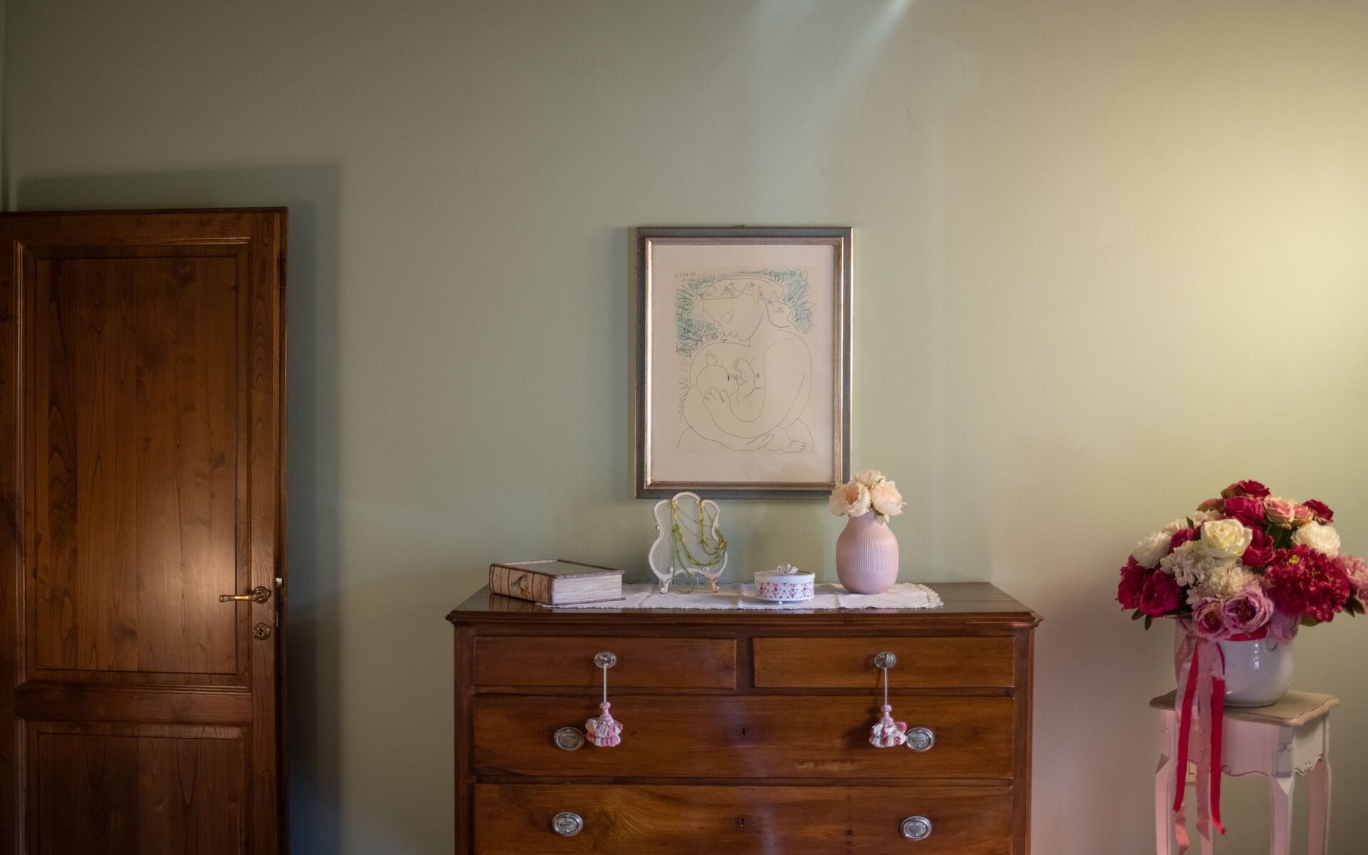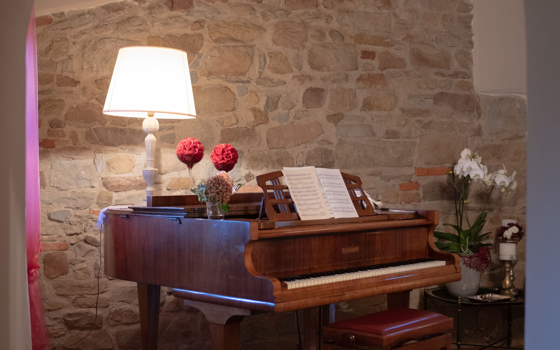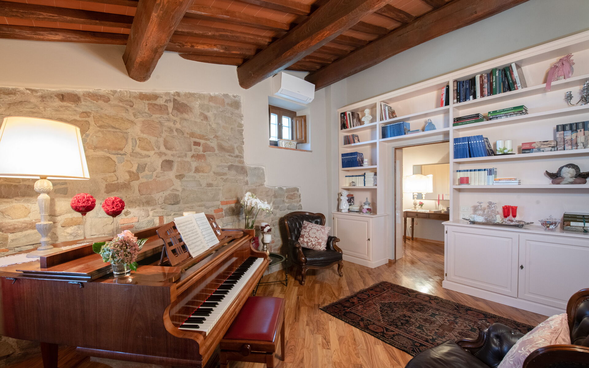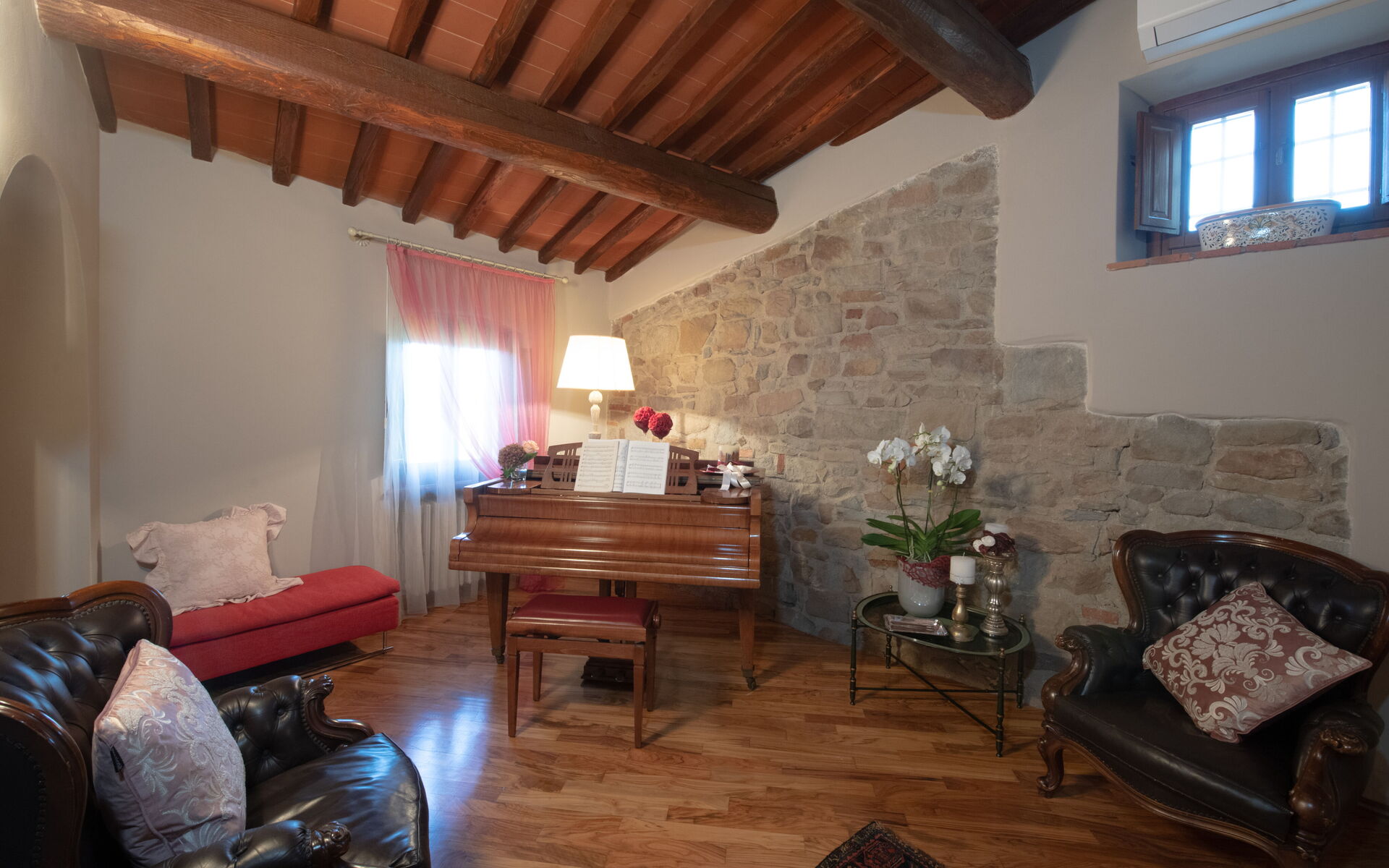 Entering the main entrance on the ground floor, we find a large and bright living area, with direct access to the outdoor courtyard through French doors. This room is furnished in classical style with sofas, a fireplace, a piano, elegant carpets and a dining table for 20 people.