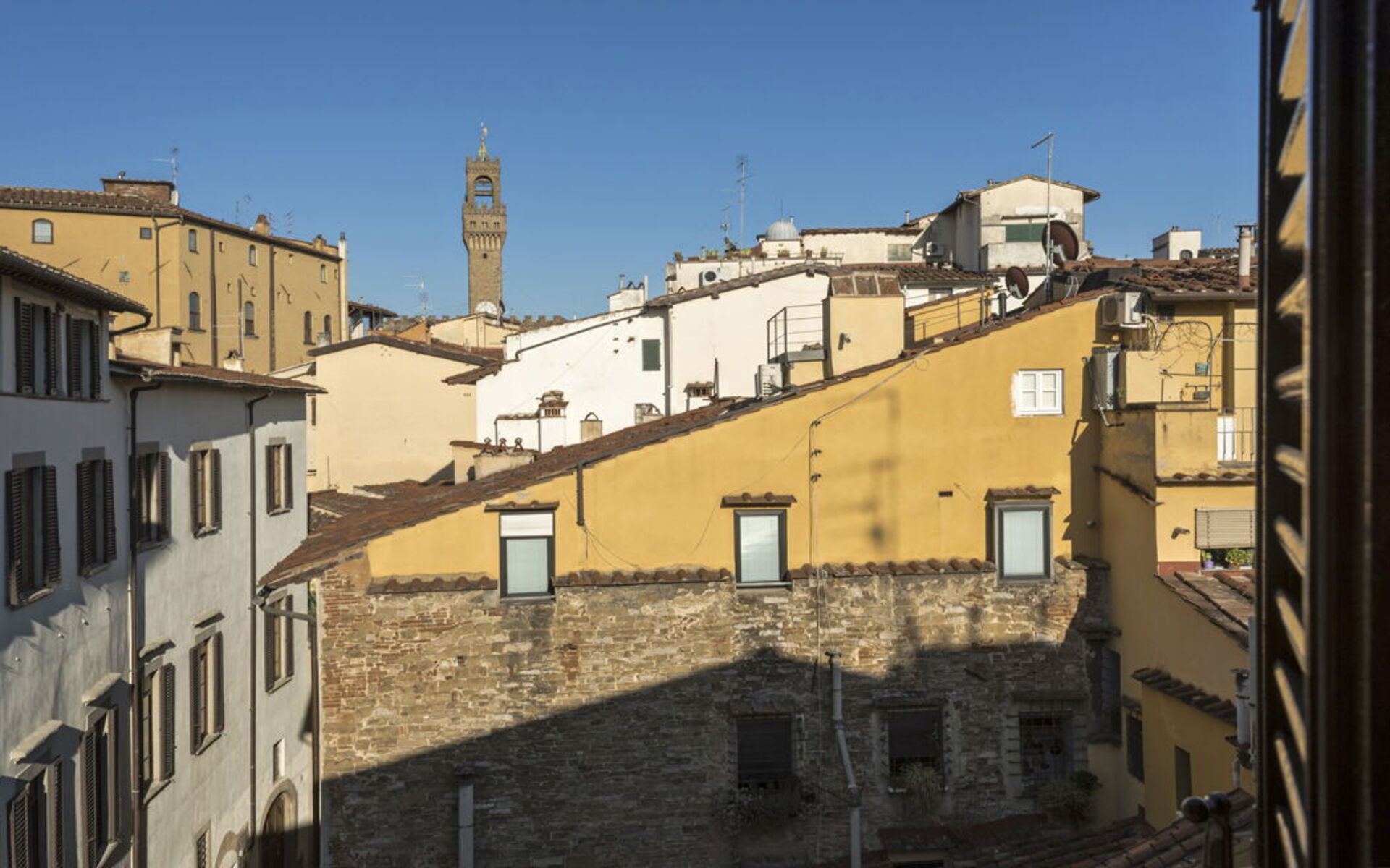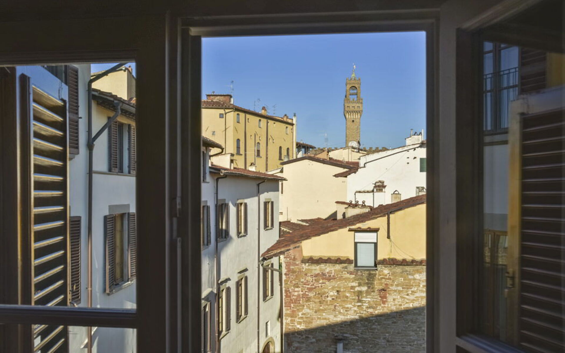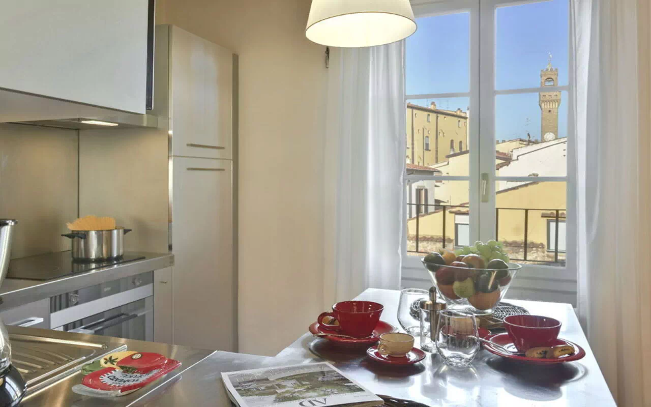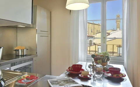 Both the living room and bedroom enjoy beautiful views of the Arnolfo Tower of Palazzo Vecchio, offering a truly unique Florentine experience.