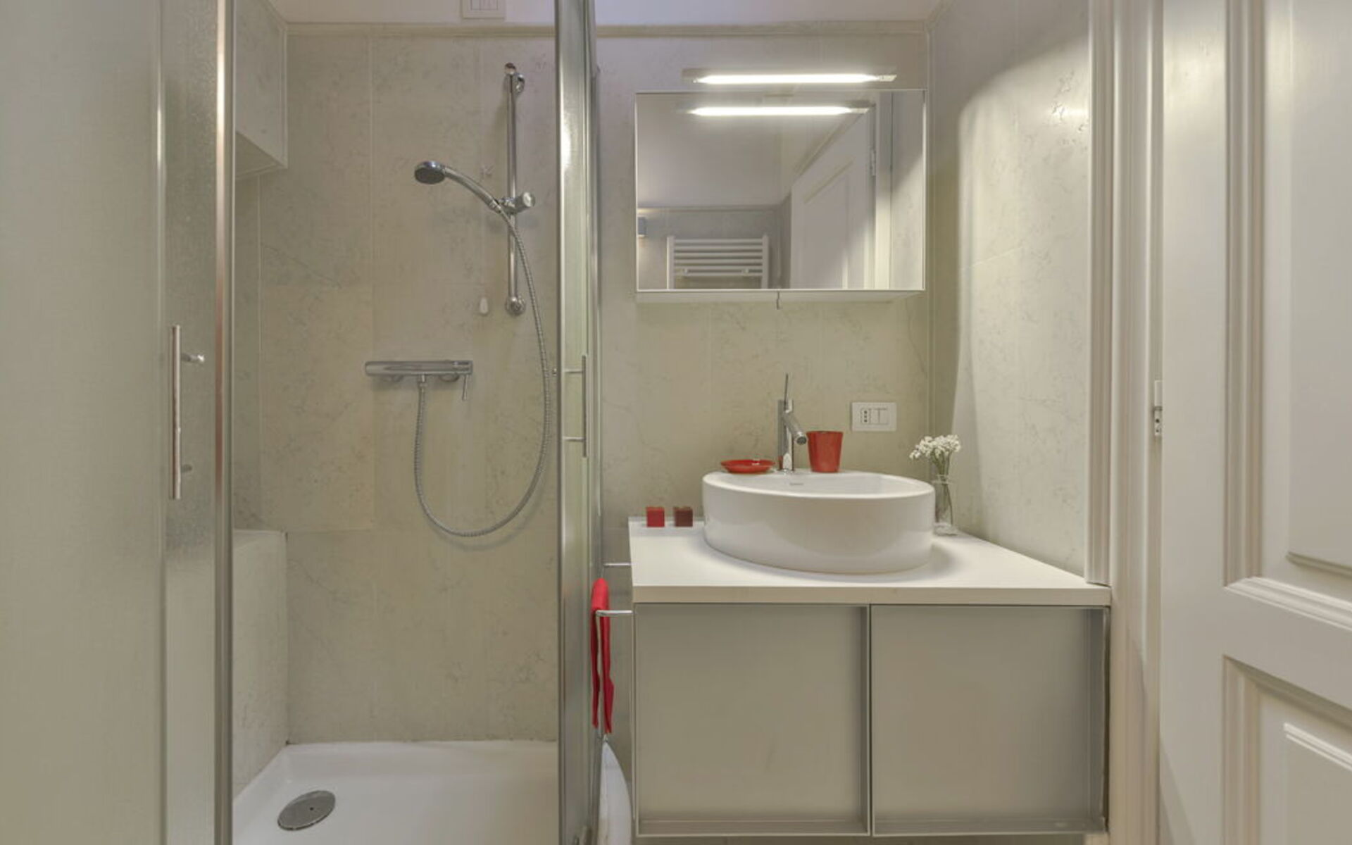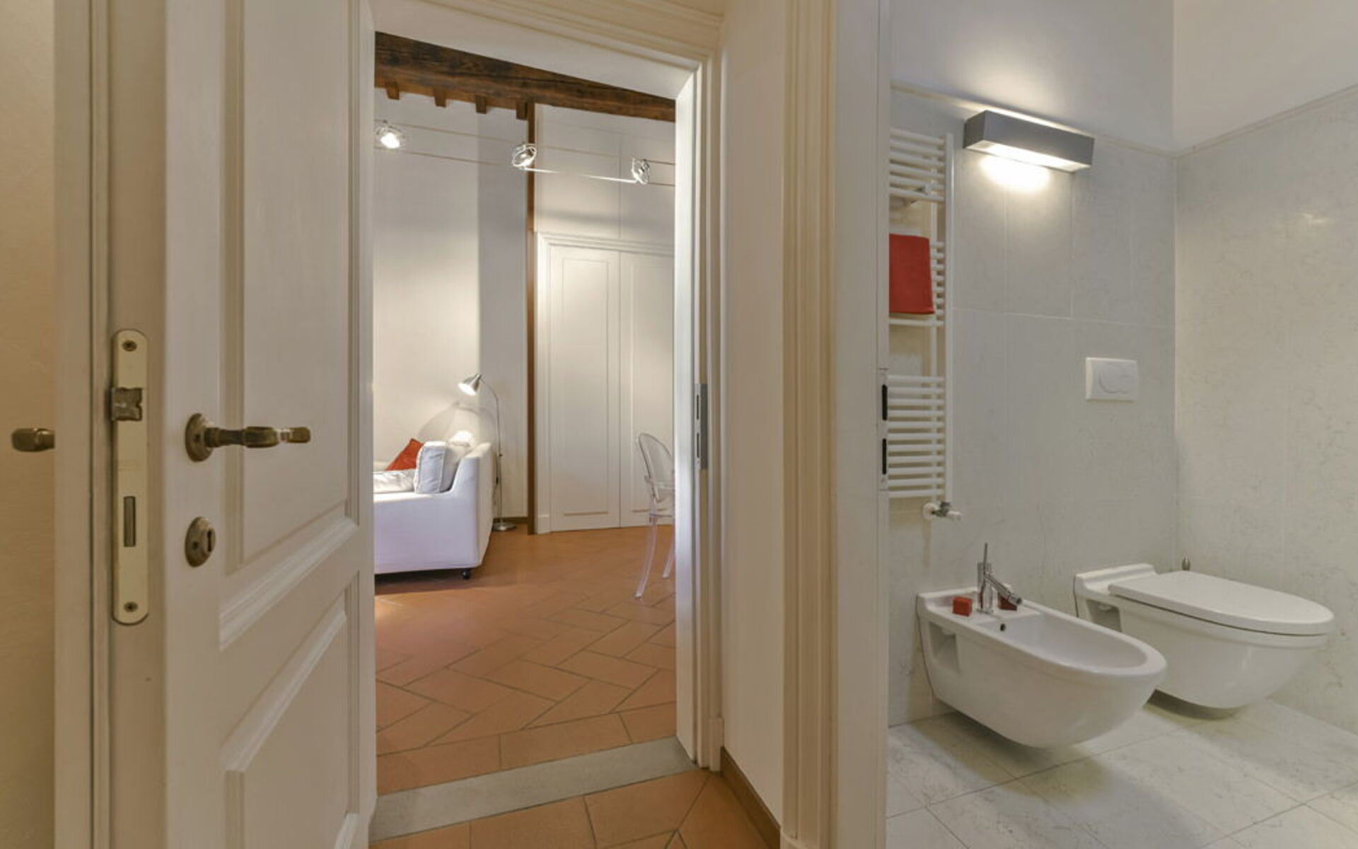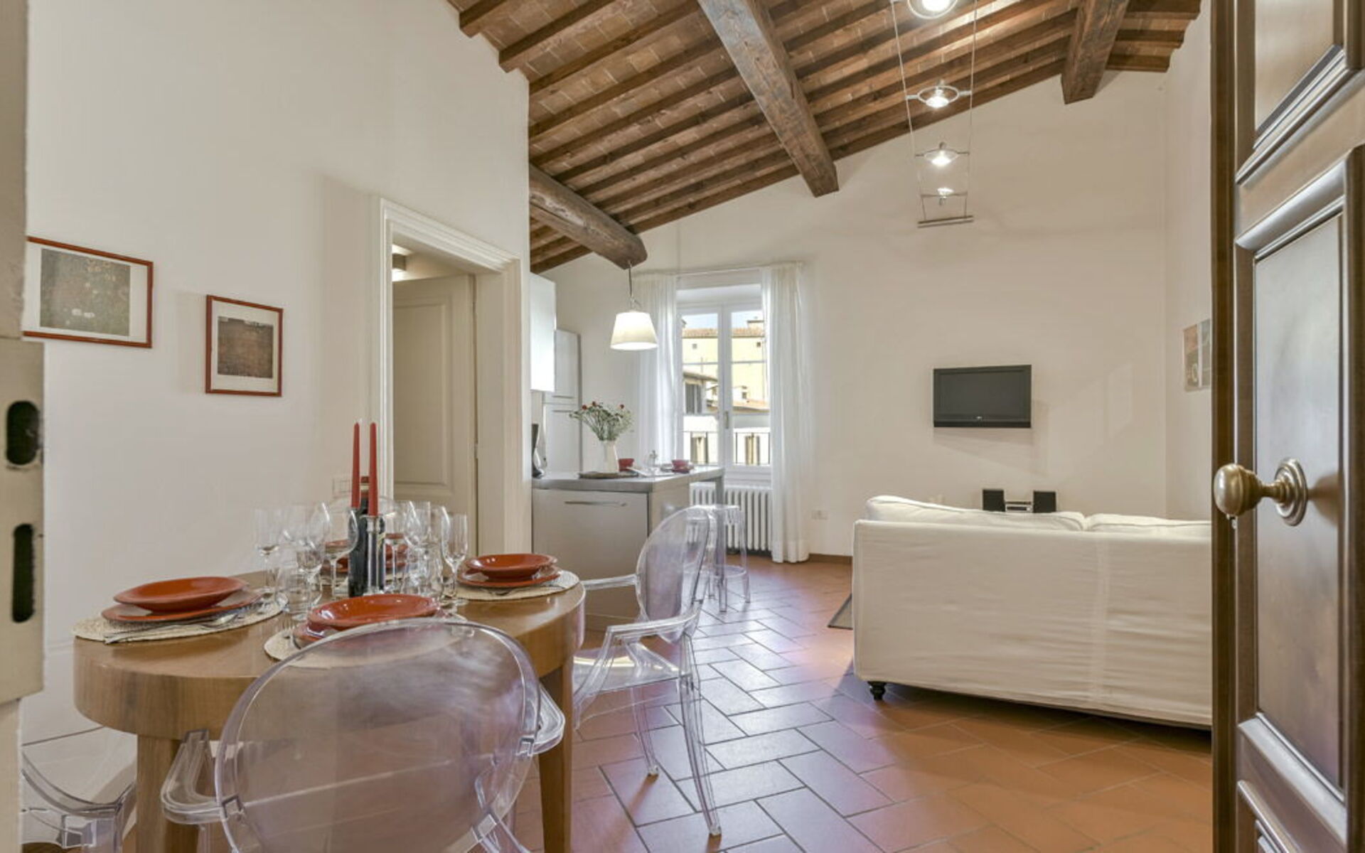 Both the living room and bedroom enjoy beautiful views of the Arnolfo Tower of Palazzo Vecchio, offering a truly unique Florentine experience.