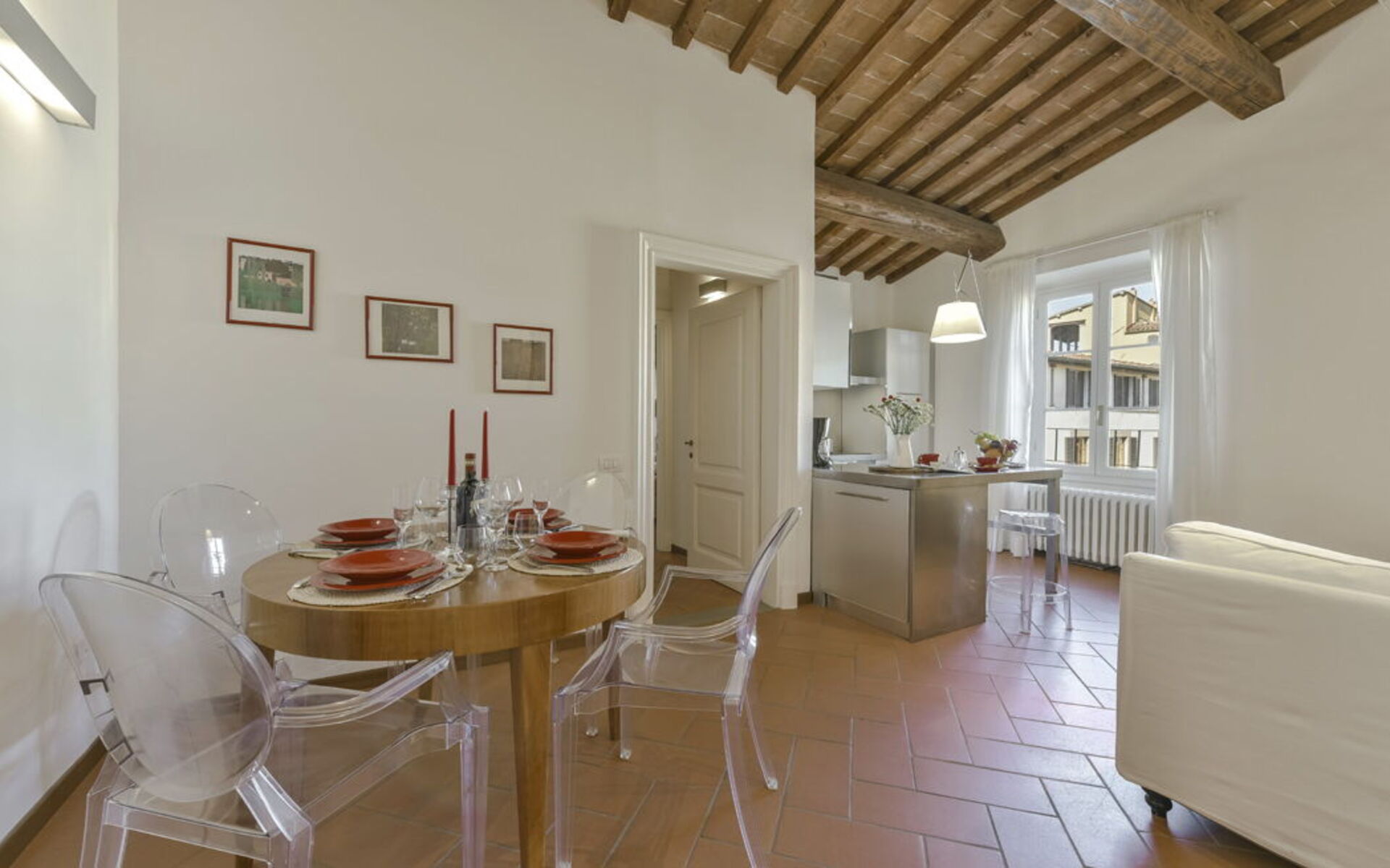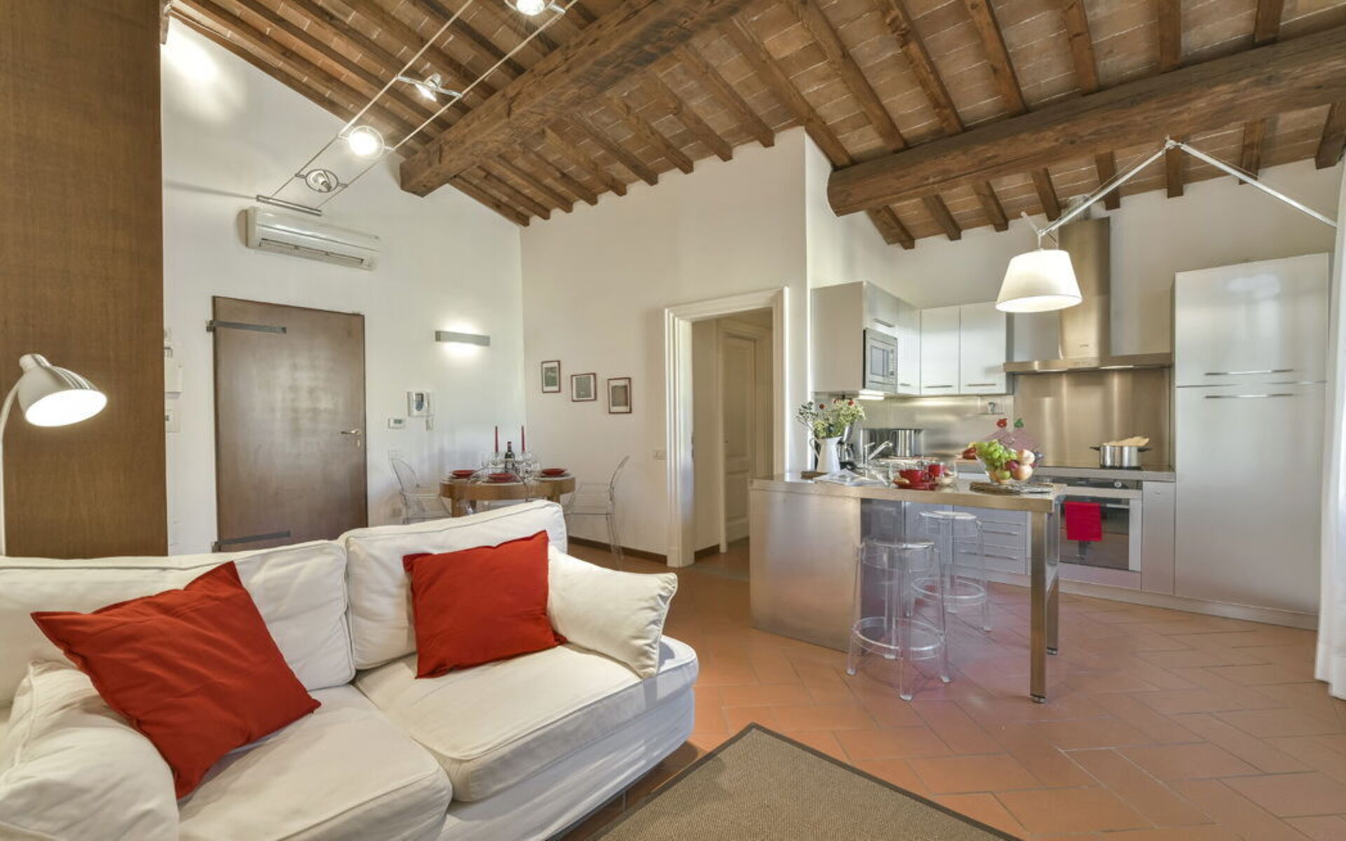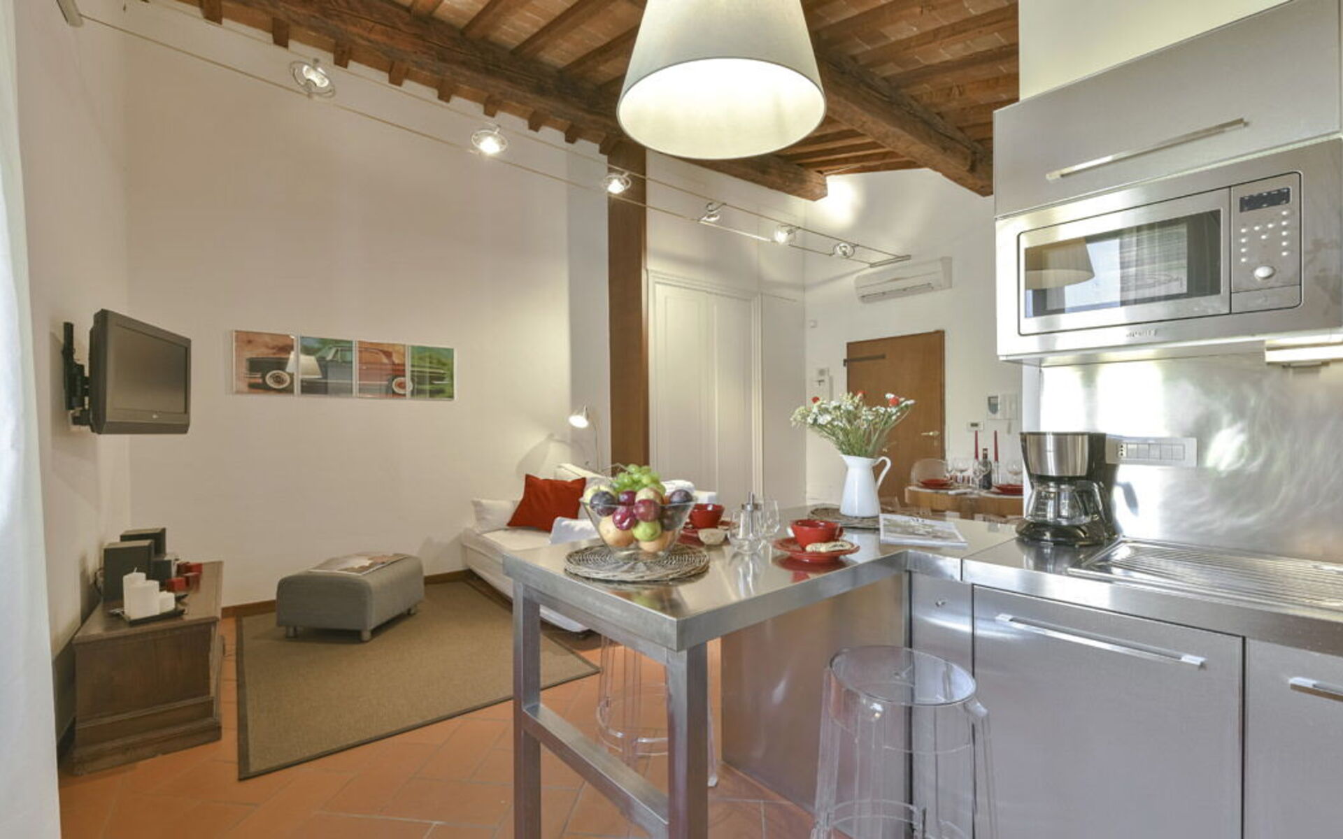 The apartment features a bright living area with double sofa bed, dining table and fully equipped modern kitchen. The double bedroom (180 cm bed) retains the charm of exposed wooden beams and terracotta floors. The bathroom includes a shower.