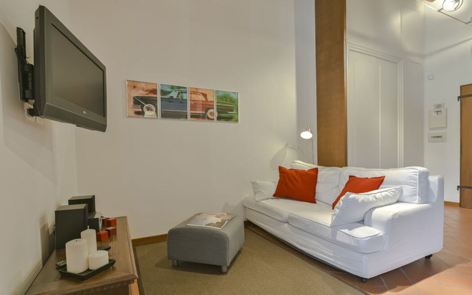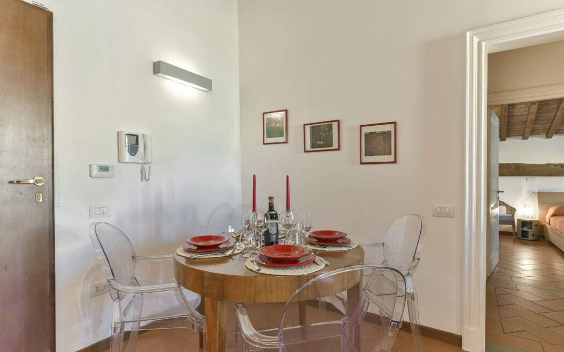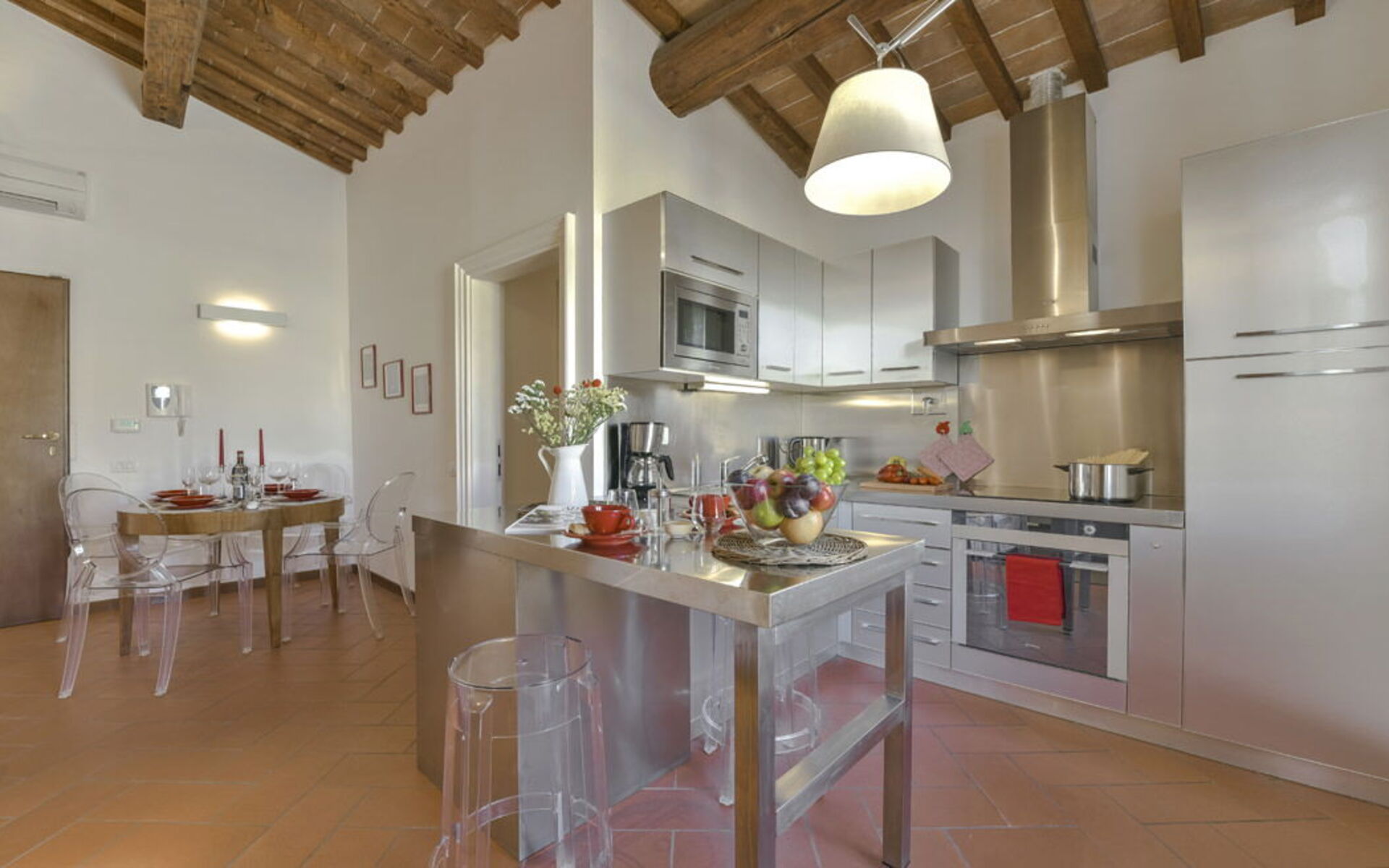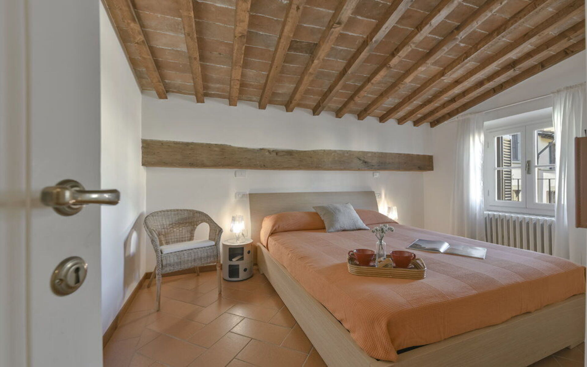 The apartment features a bright living area with double sofa bed, dining table and fully equipped modern kitchen. The double bedroom (180 cm bed) retains the charm of exposed wooden beams and terracotta floors. The bathroom includes a shower.