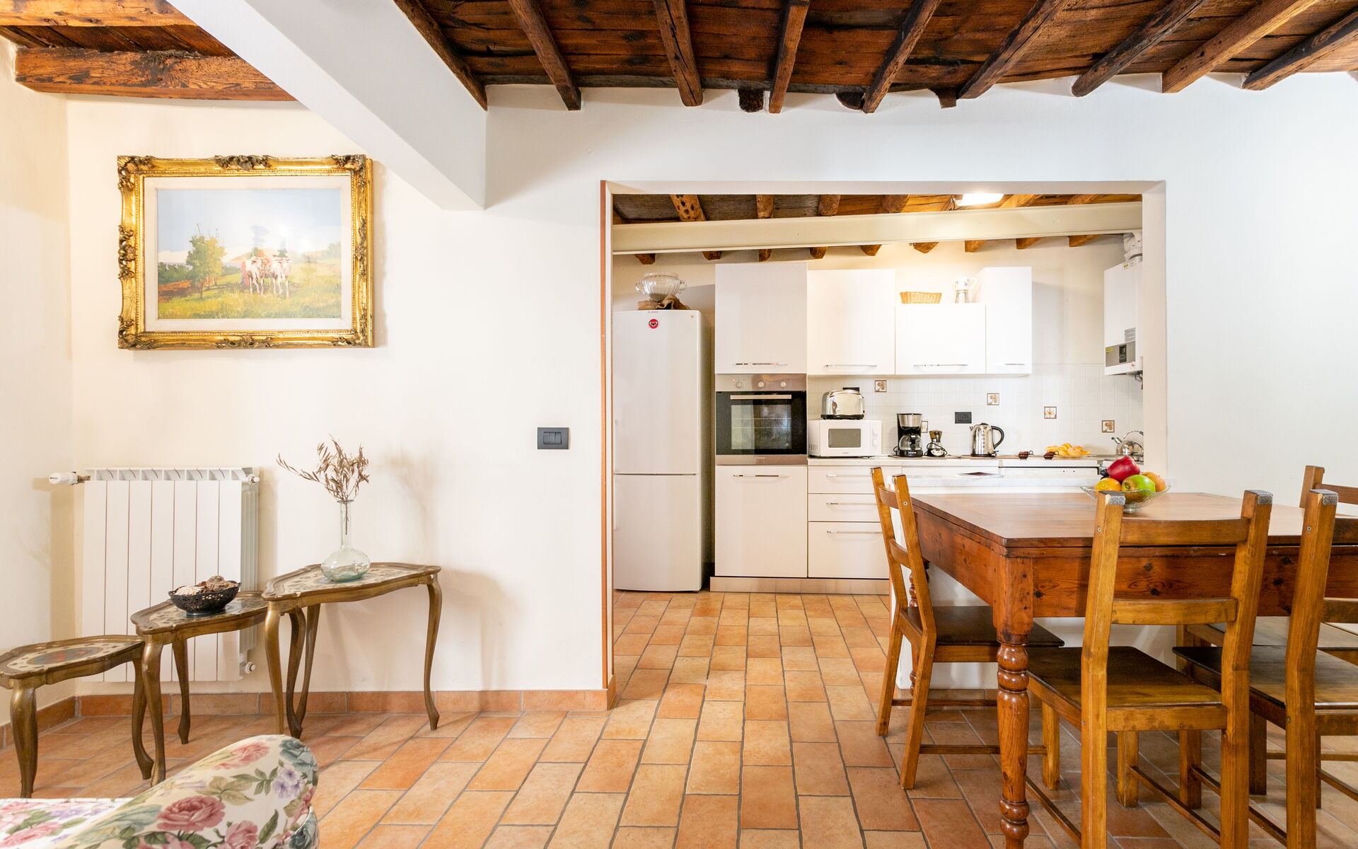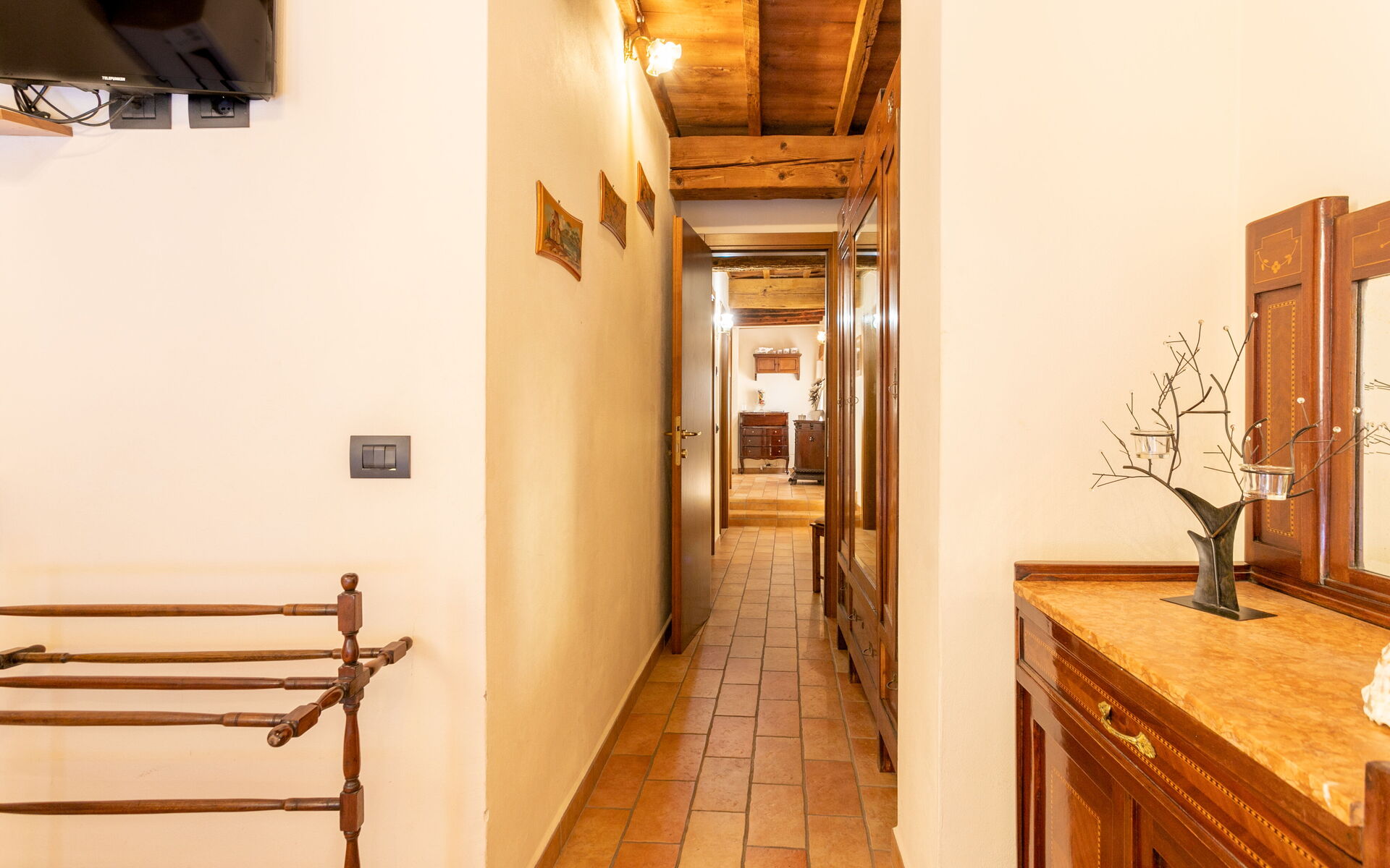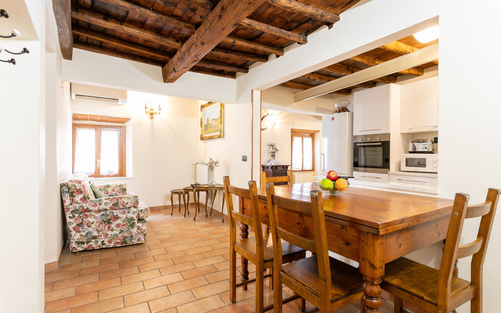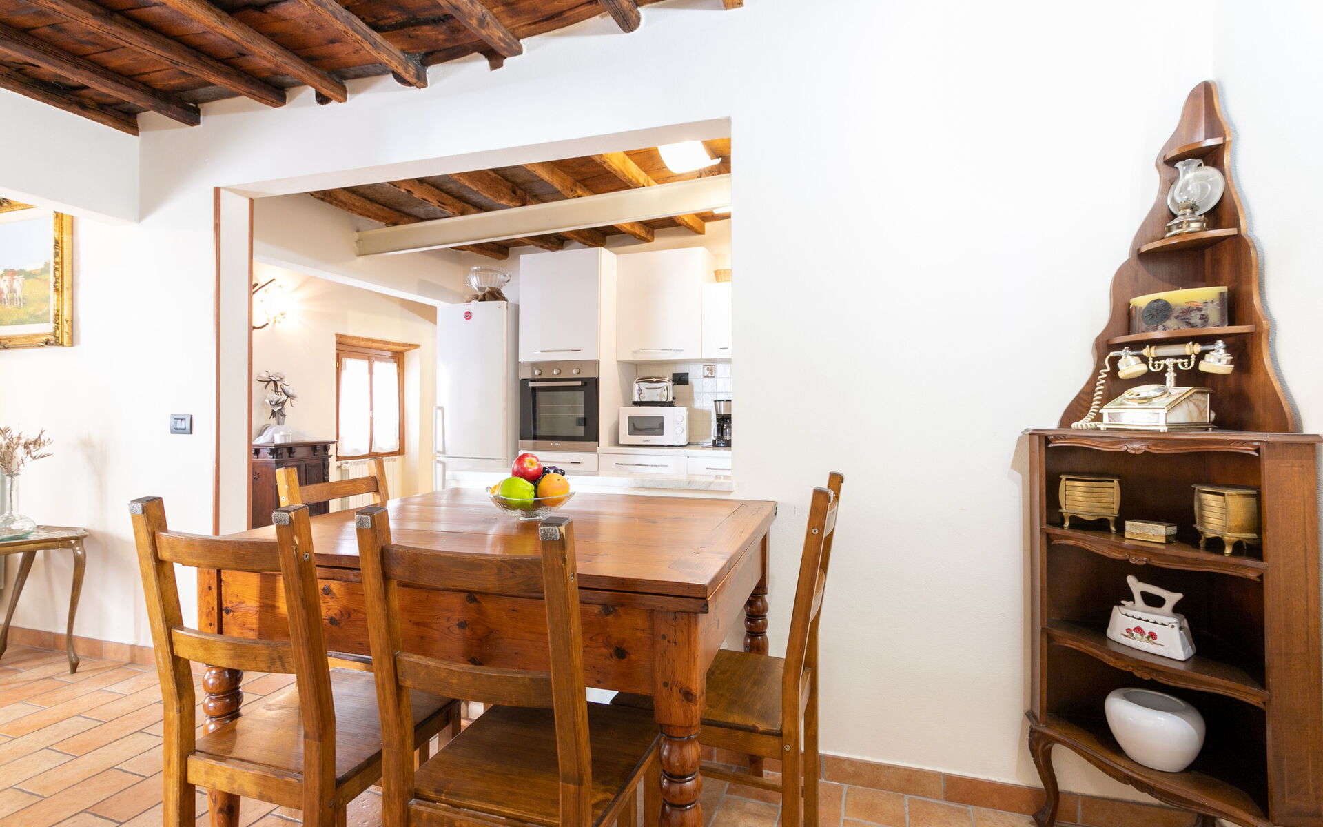 The apartment accommodates up to 6 guests and features 3 double bedrooms and 2 full bathrooms with shower. It is beautifully furnished in an 19th-century style, with exposed wooden ceiling beams and traditional terracotta floors, creating a warm and elegant atmosphere.
