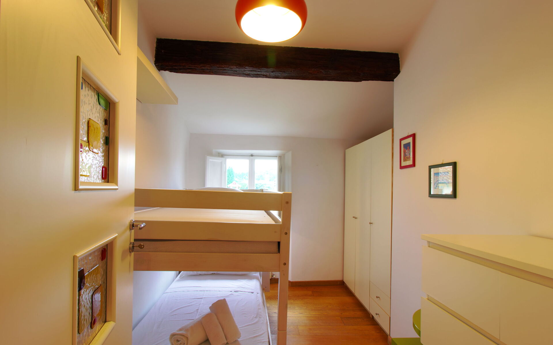 a bedroom with a single bed (90 cm), convertible into a double bed on request