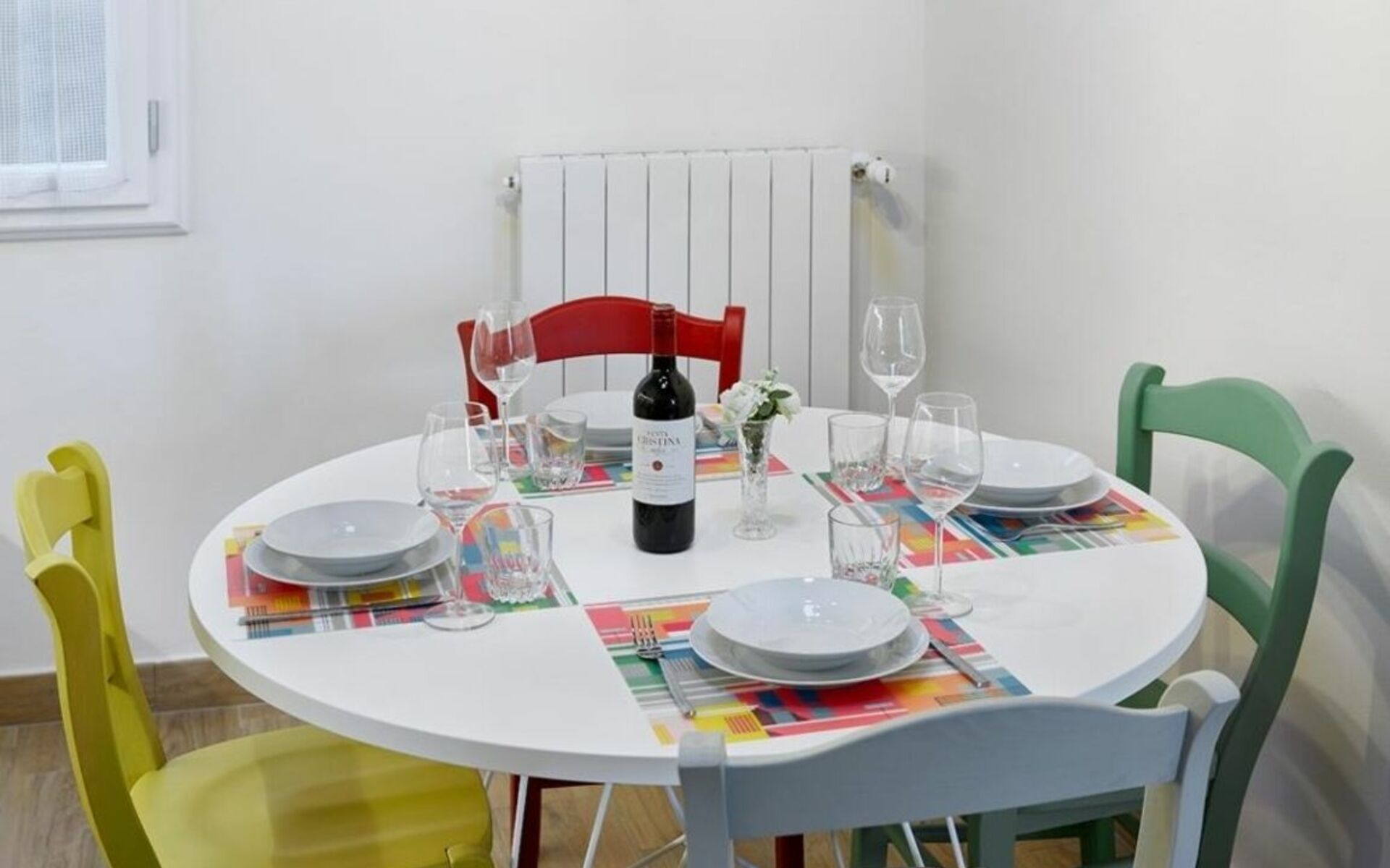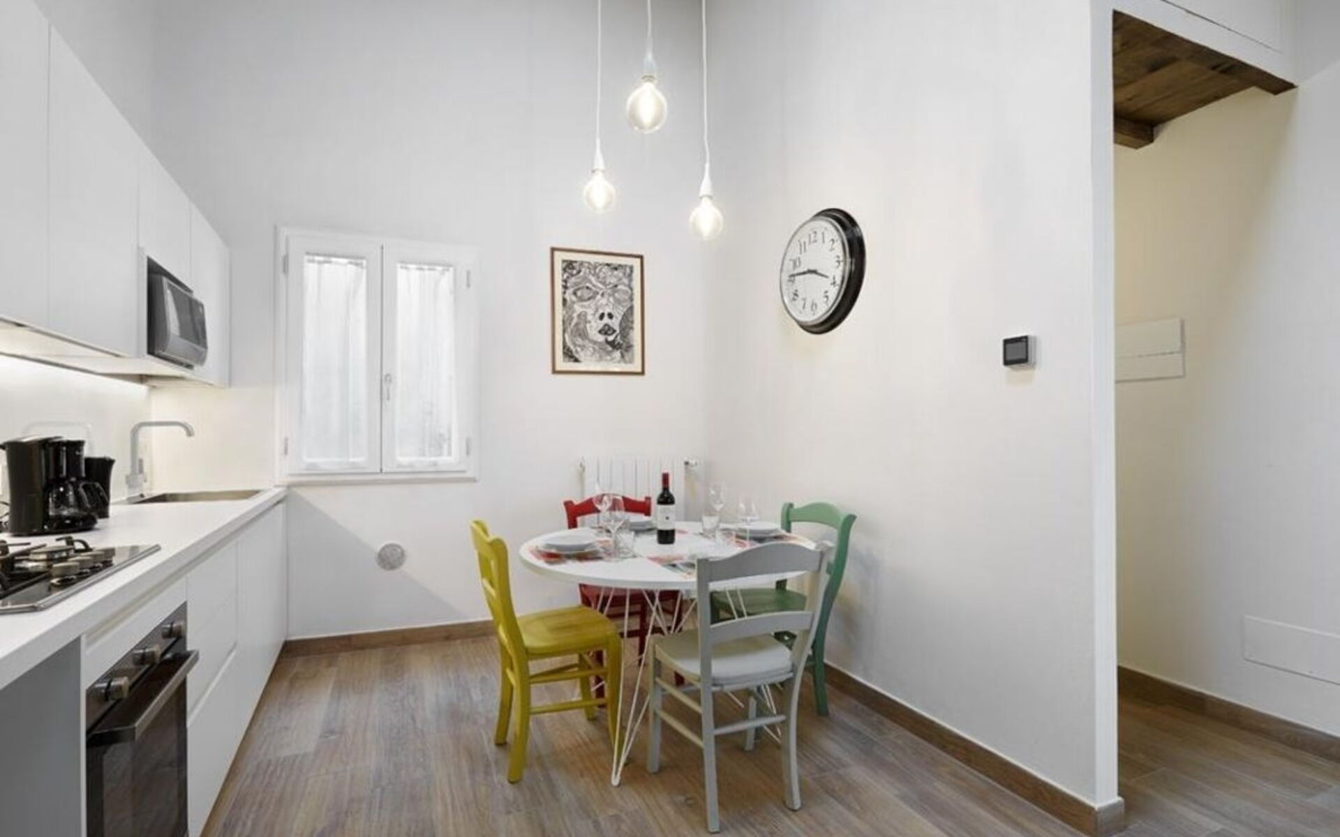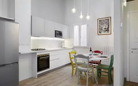 The apartment opens onto a small entrance corridor that leads to the kitchen, which has a dining nook with a table for 4 people.