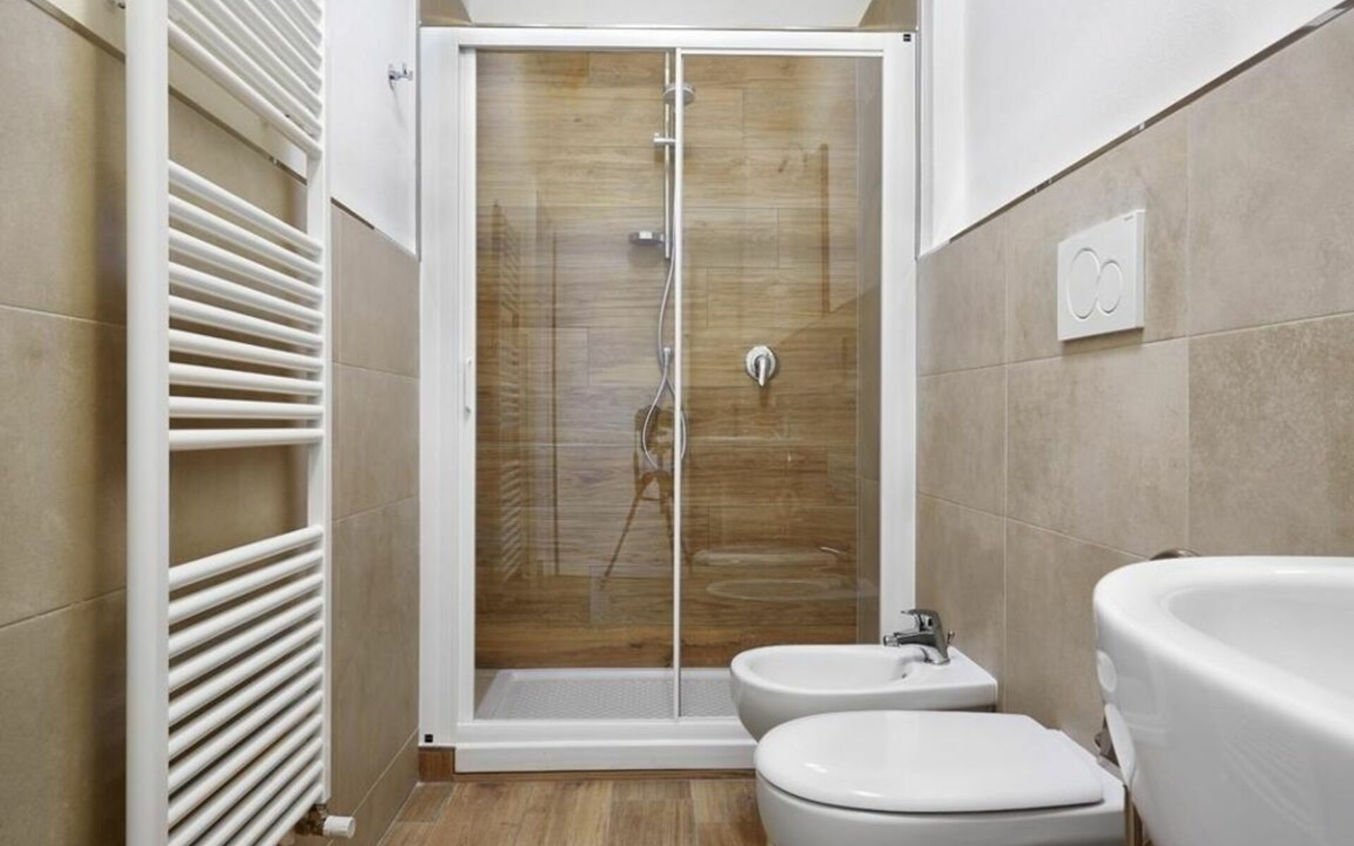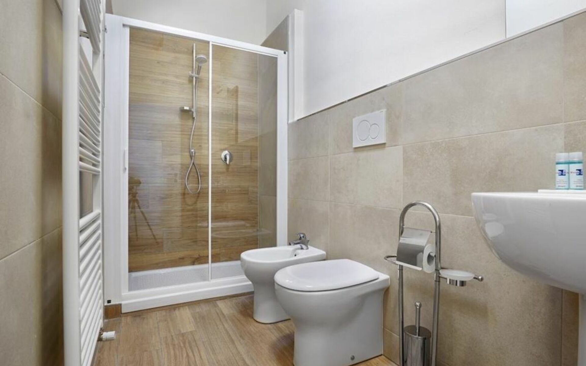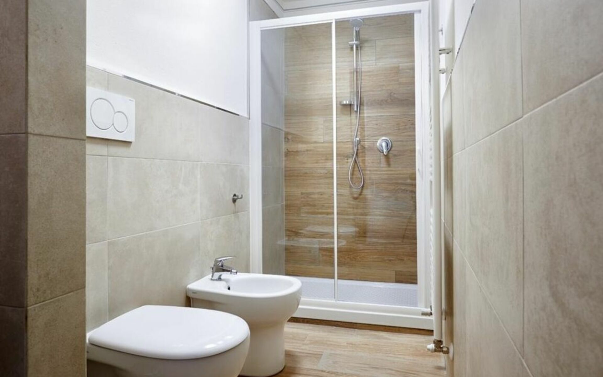 Going back to the entrance corridor, going past the kitchen you'll find the second bathroom, which also has a shower. At the end of the corridor there is the second bedroom (with two single beds 90 cm wide - can be combined). In both bedrooms there is a flat-screen TV.
