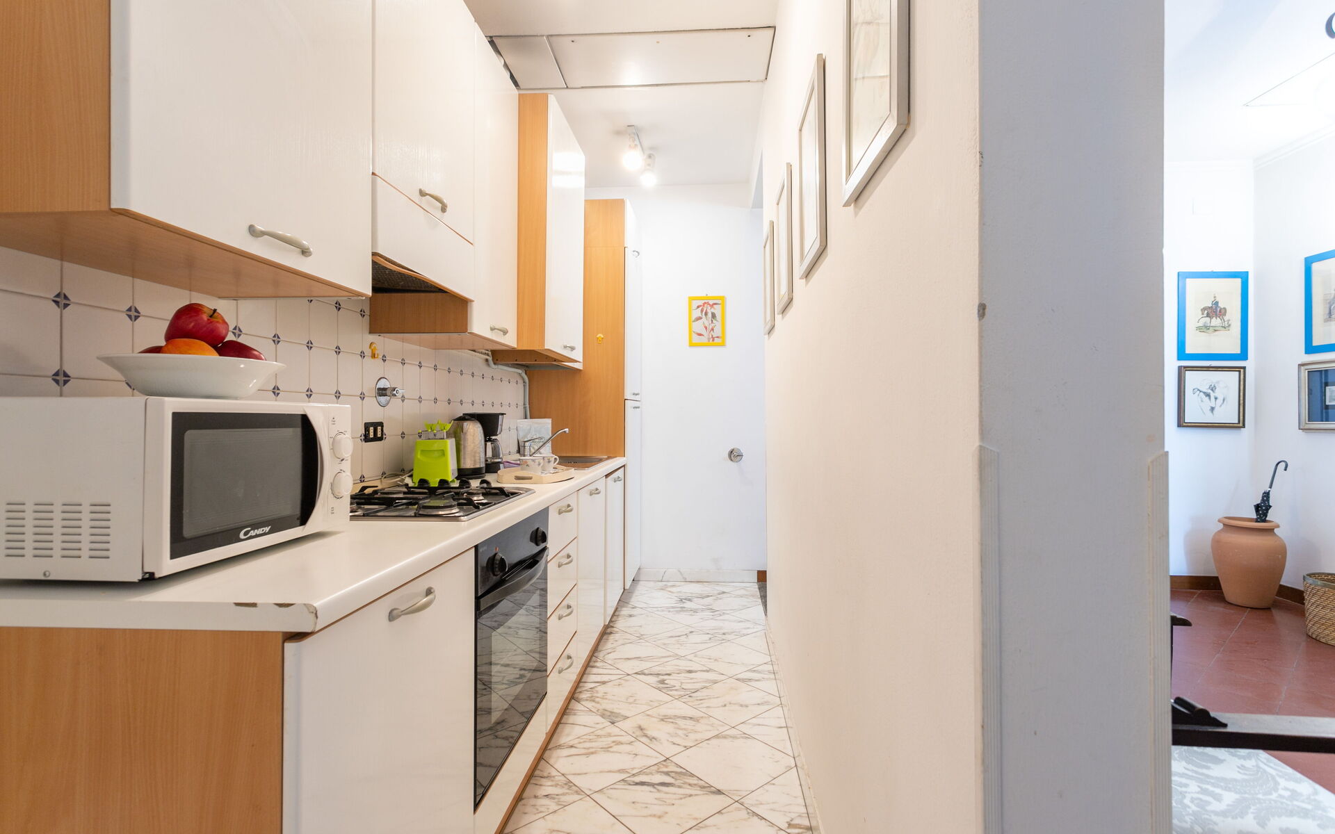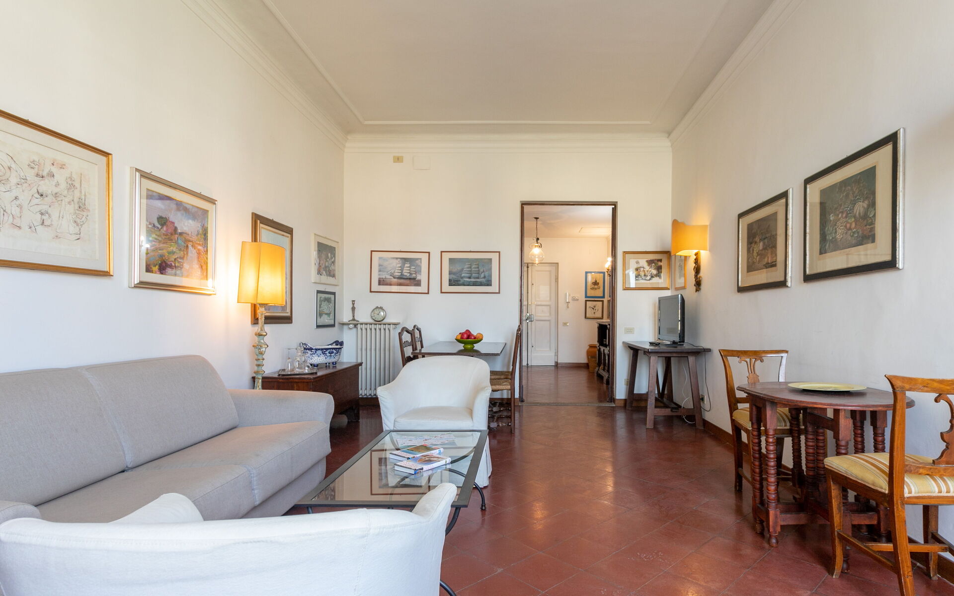 The apartment enjoys beautiful panoramic views of the Arno River and the historic centre. Classic-style interiors include a large double living and dining area with sofa bed, a fully equipped kitchen, a bright and spacious double bedroom, and a bathroom with bathtub/shower.