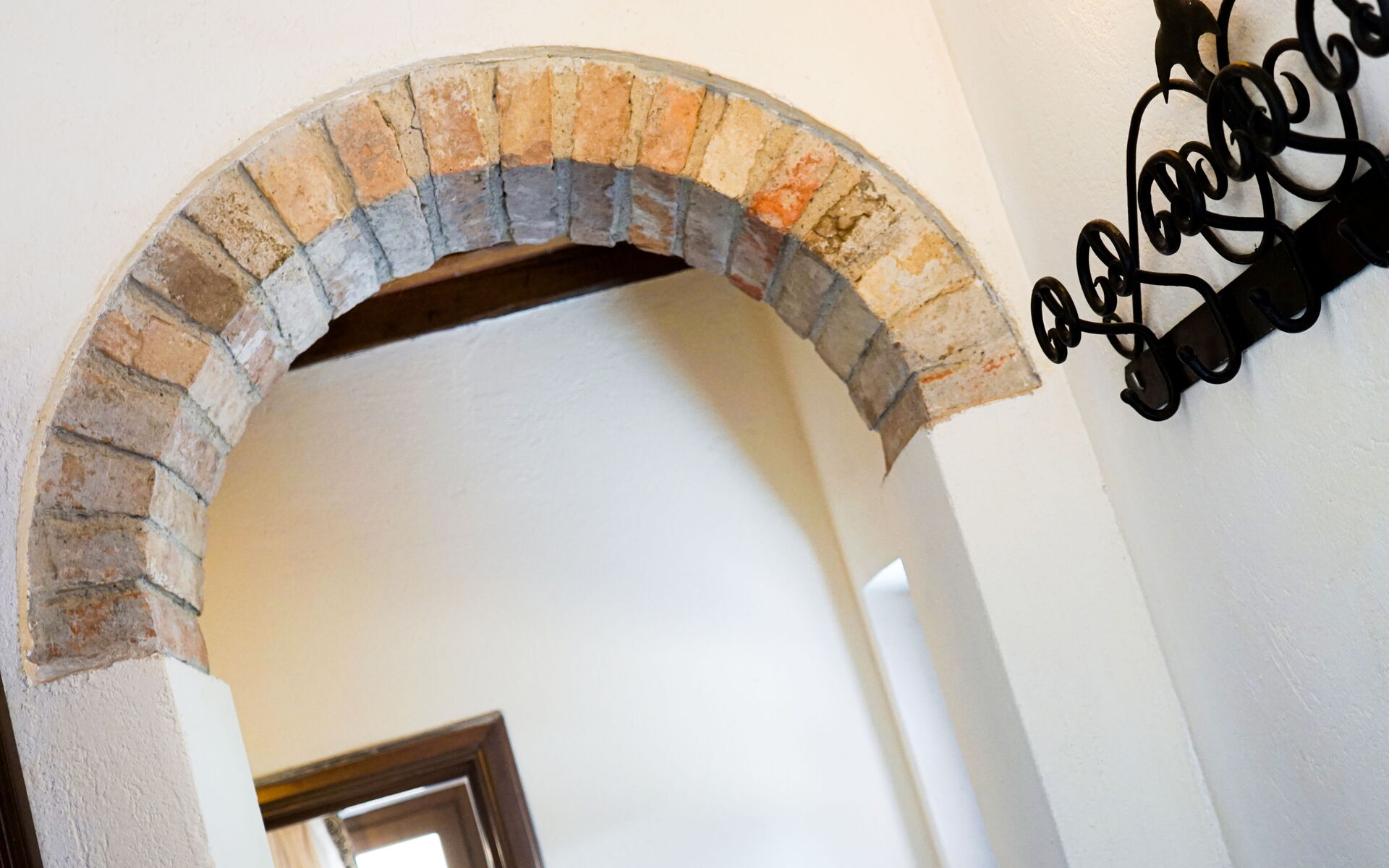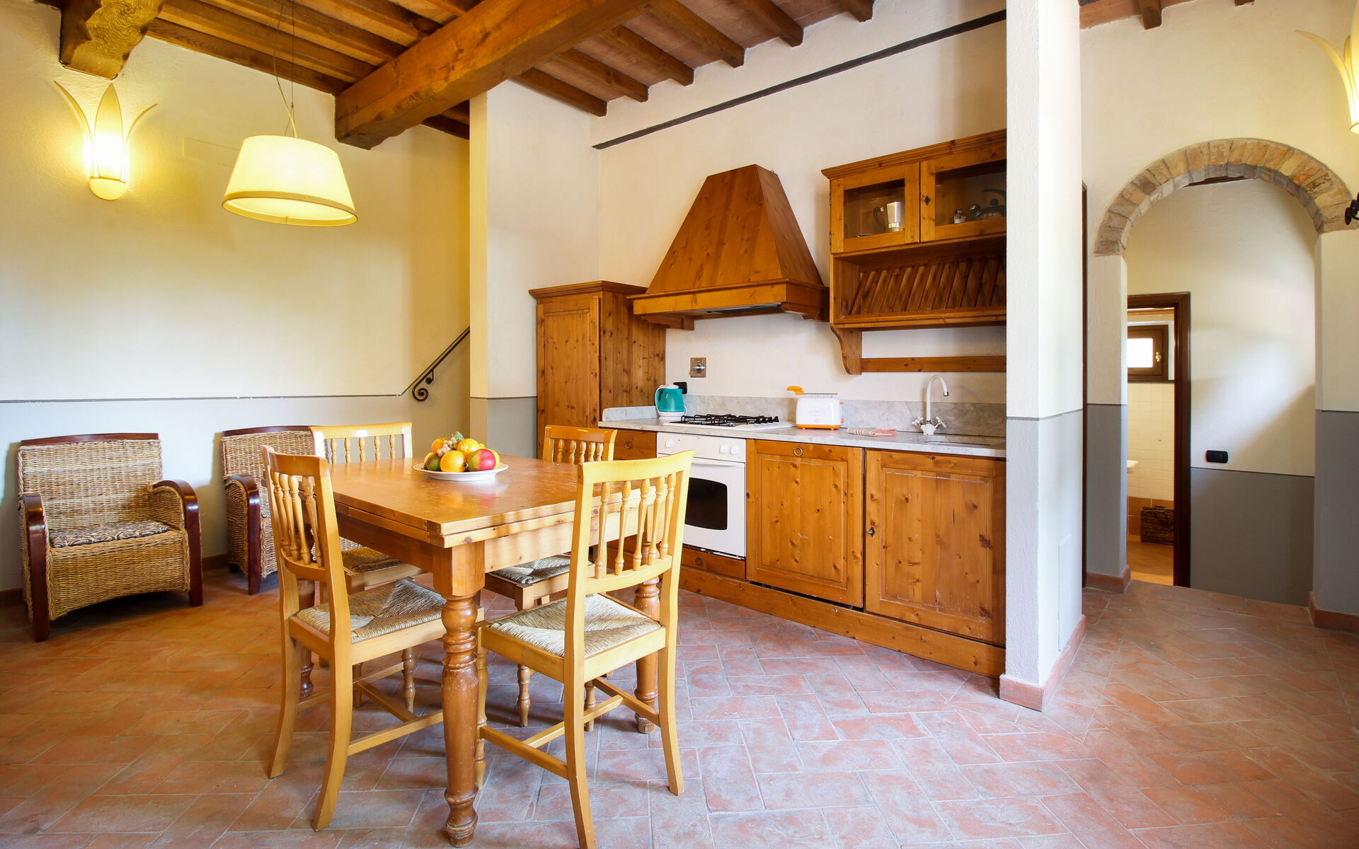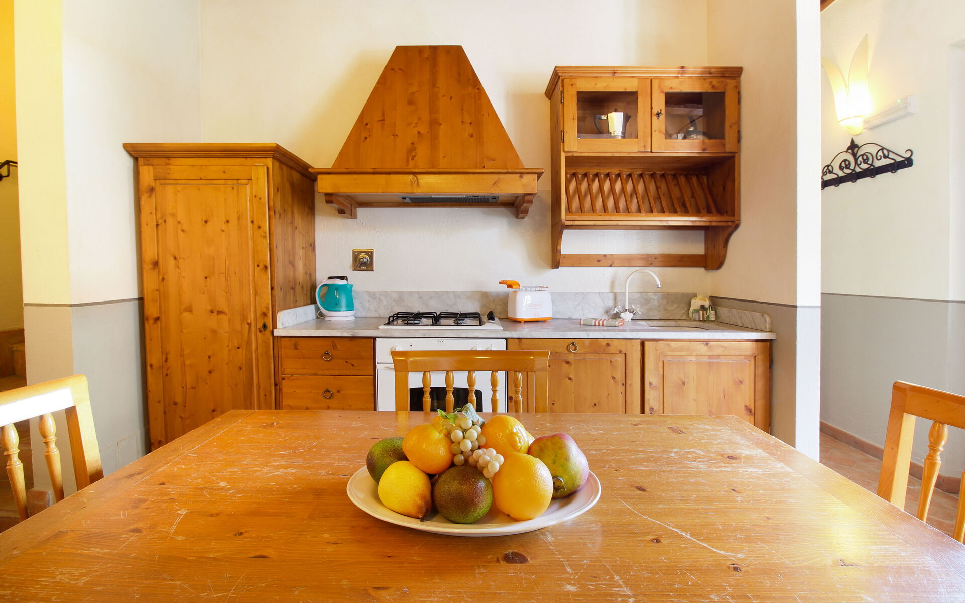 On the ground floor, there is the kitchen with a table and chairs and a fireplace. From the kitchen, divided by a corridor and 3 steps, there is the first double bedroom with its own bathroom.