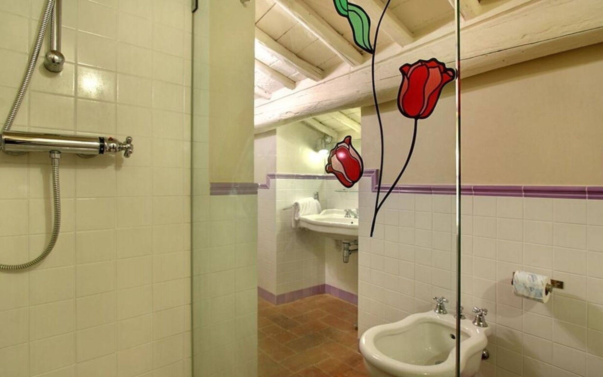 Ground floor: The entrance to the villa is via a covered loggia. You are welcome by a wide entrance hall with terracotta tiled floors and a traditional beamed ceiling.