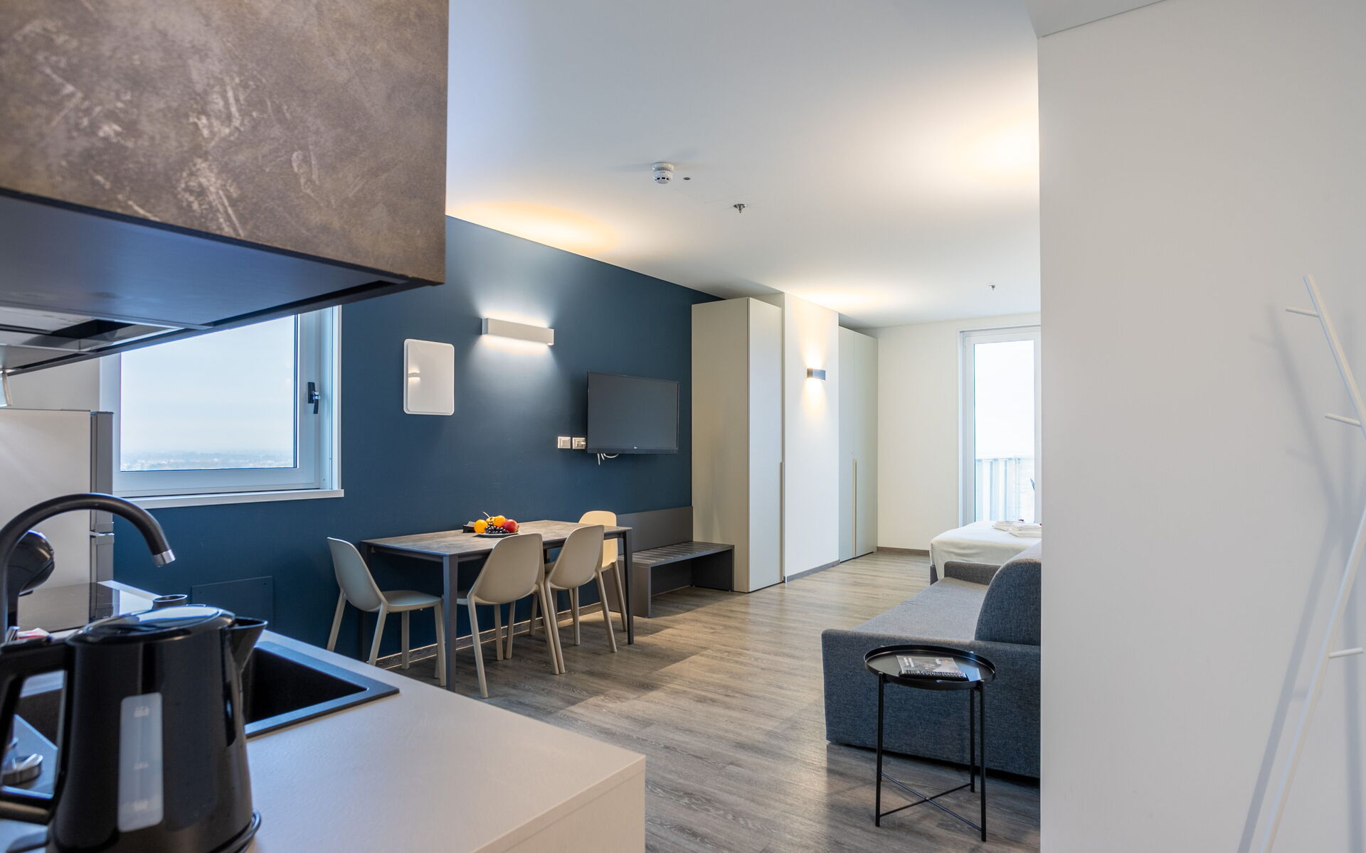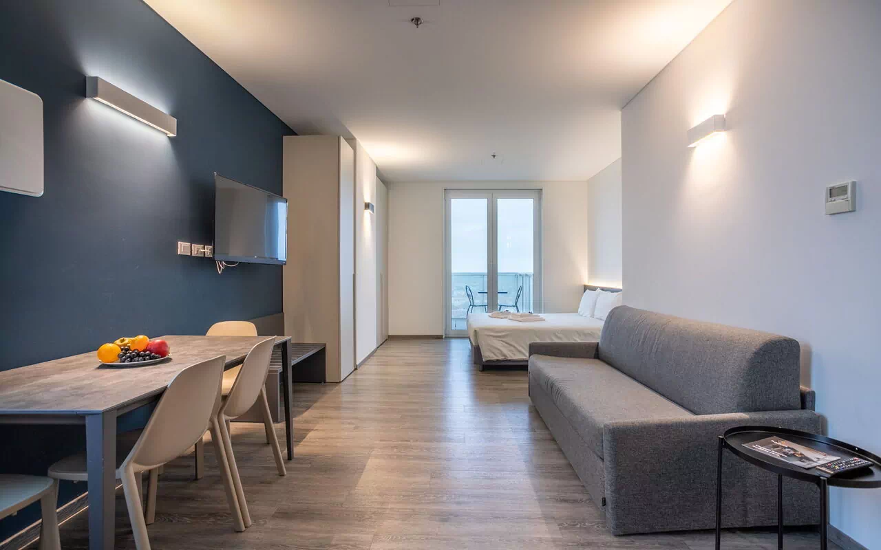• Open‑plan living area with double sofa bed