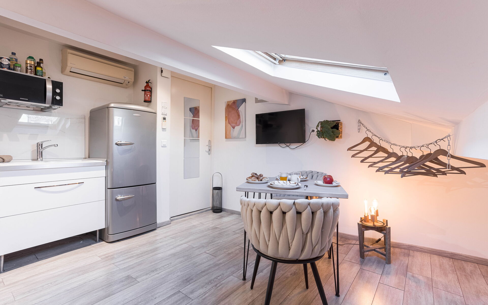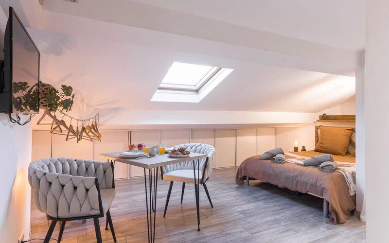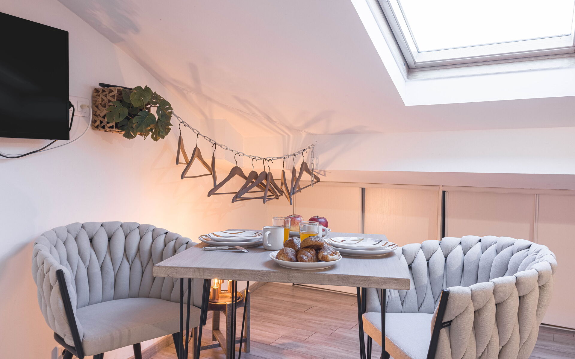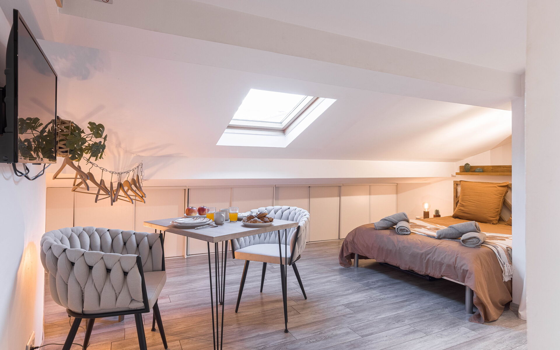 - Attic living room with flat-screen TV + lounge area + table for 2 + double bed 140x200