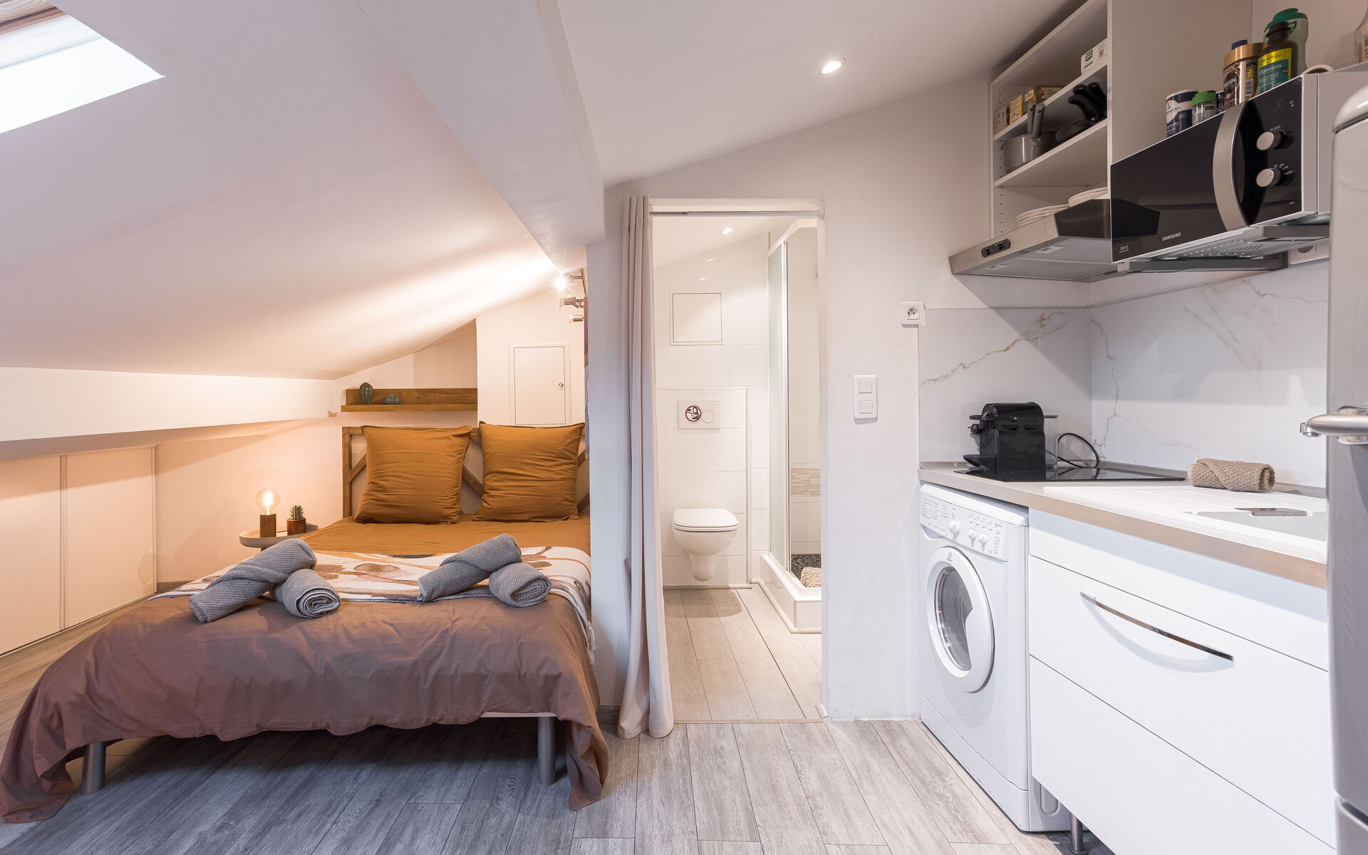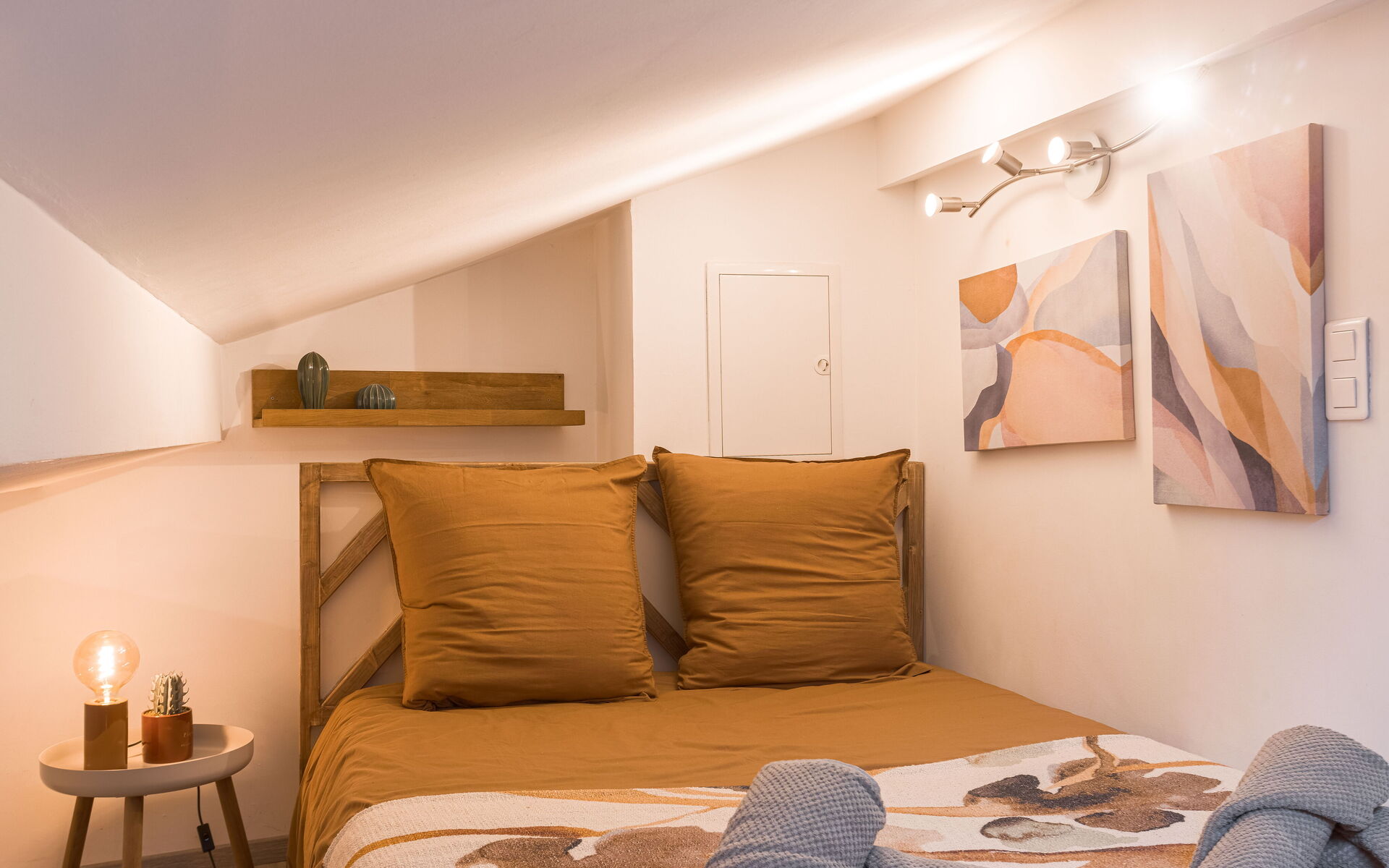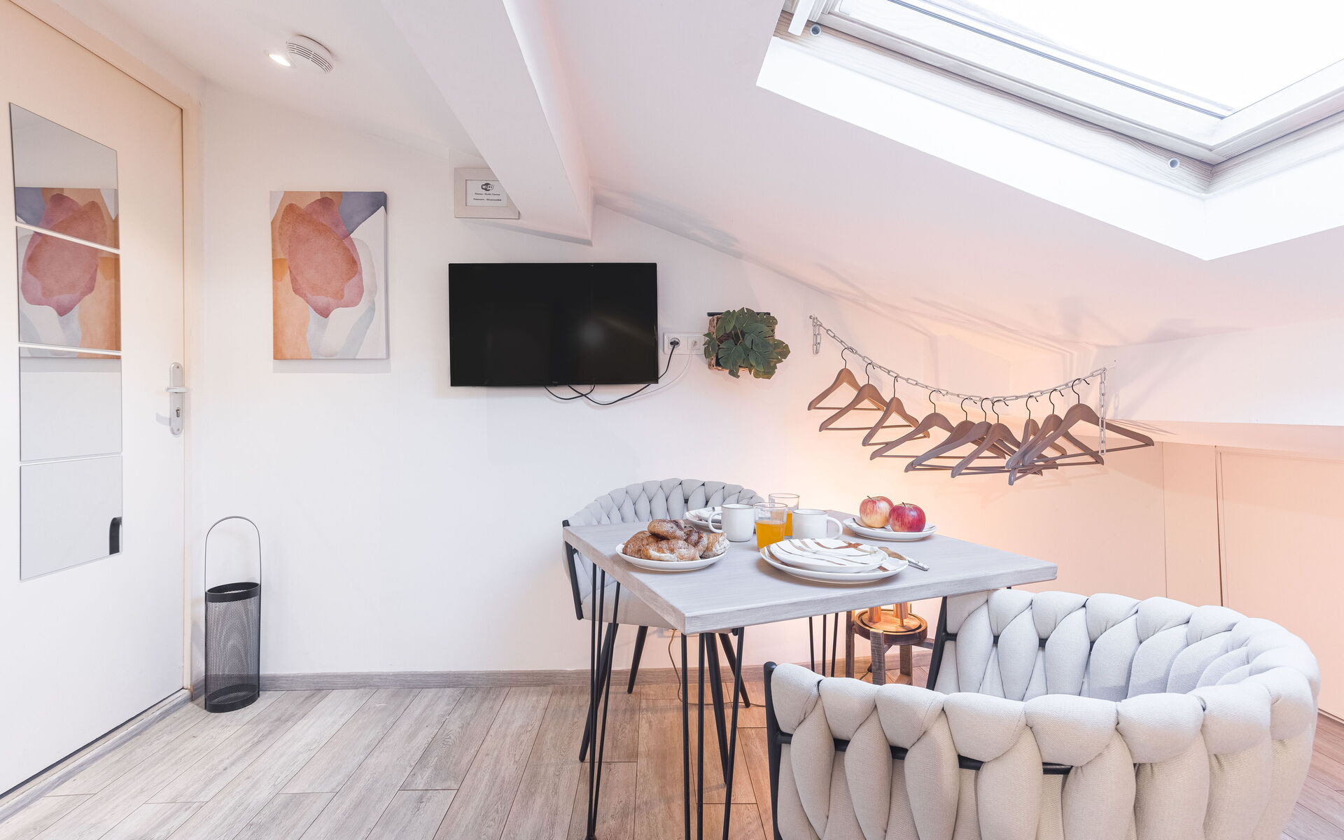 - Attic living room with flat-screen TV + lounge area + table for 2 + double bed 140x200