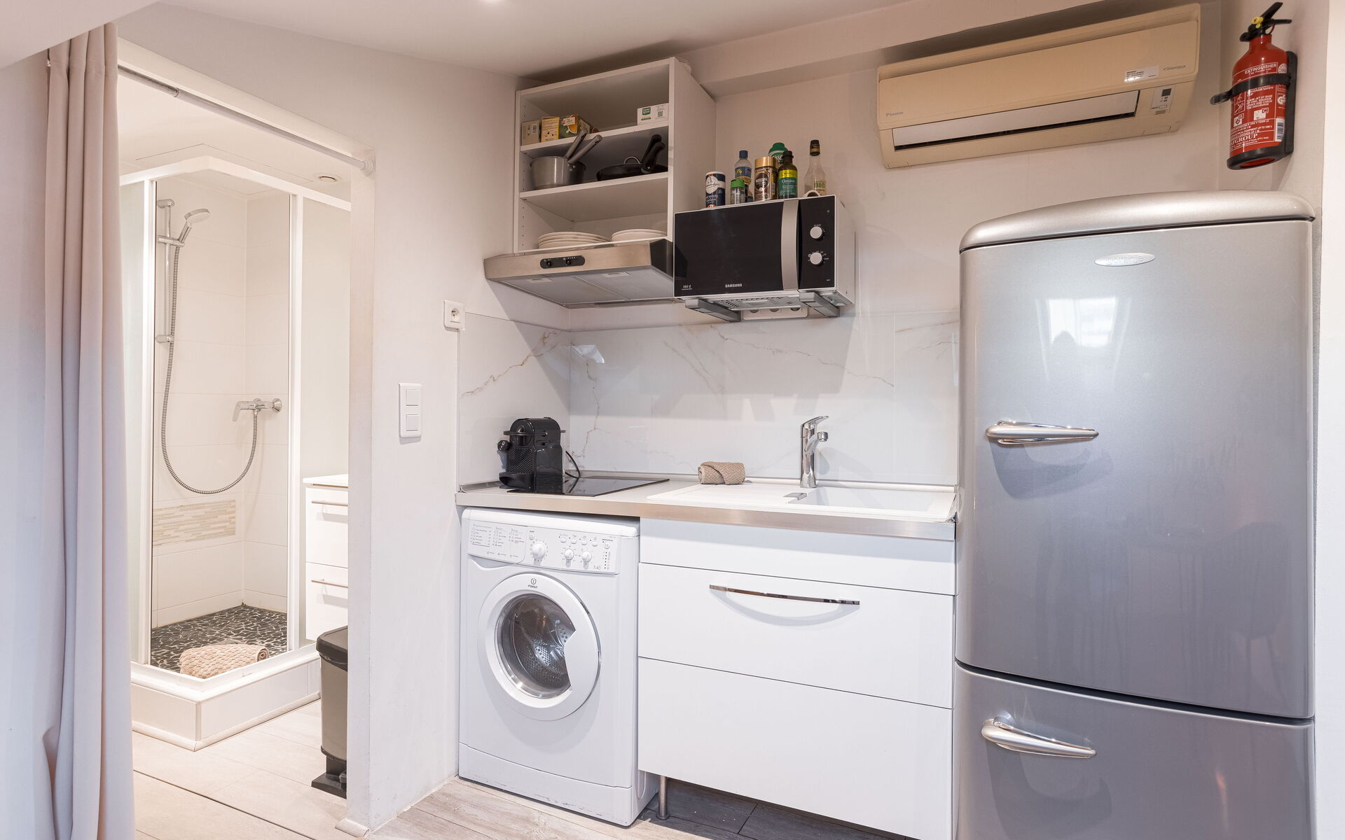 - Fully equipped American kitchen: fridge + kettle + toaster + microwave + coffee machine
