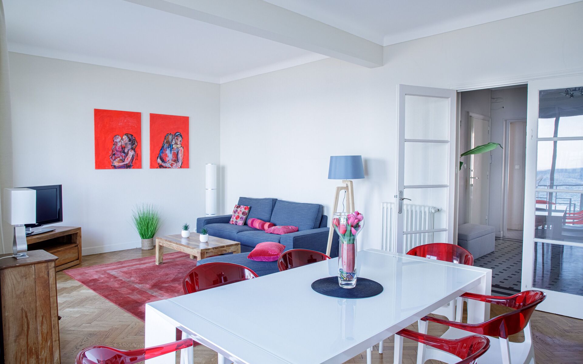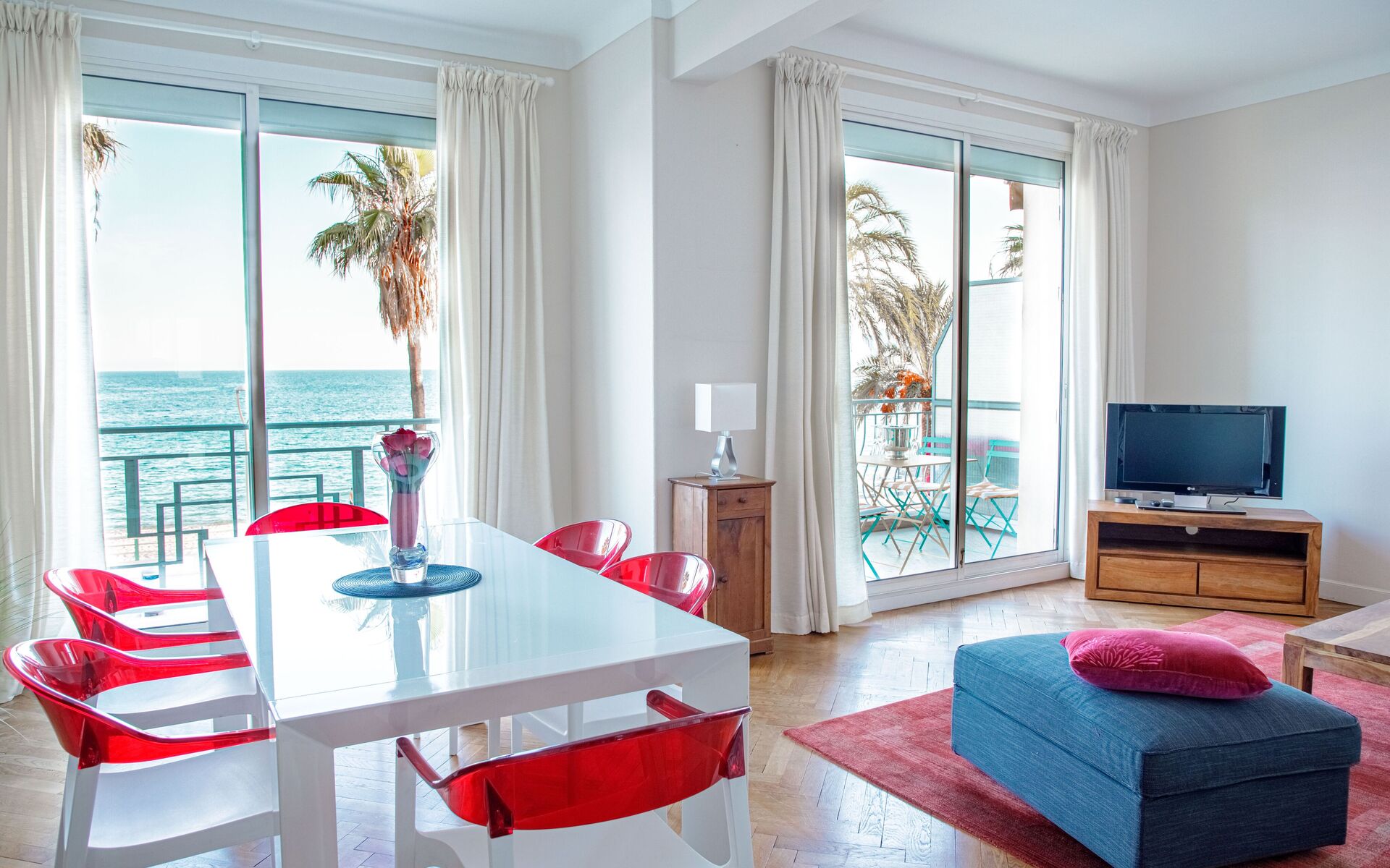 - Living room opening onto the beautiful sunny terrace + flat-screen TV + dining area