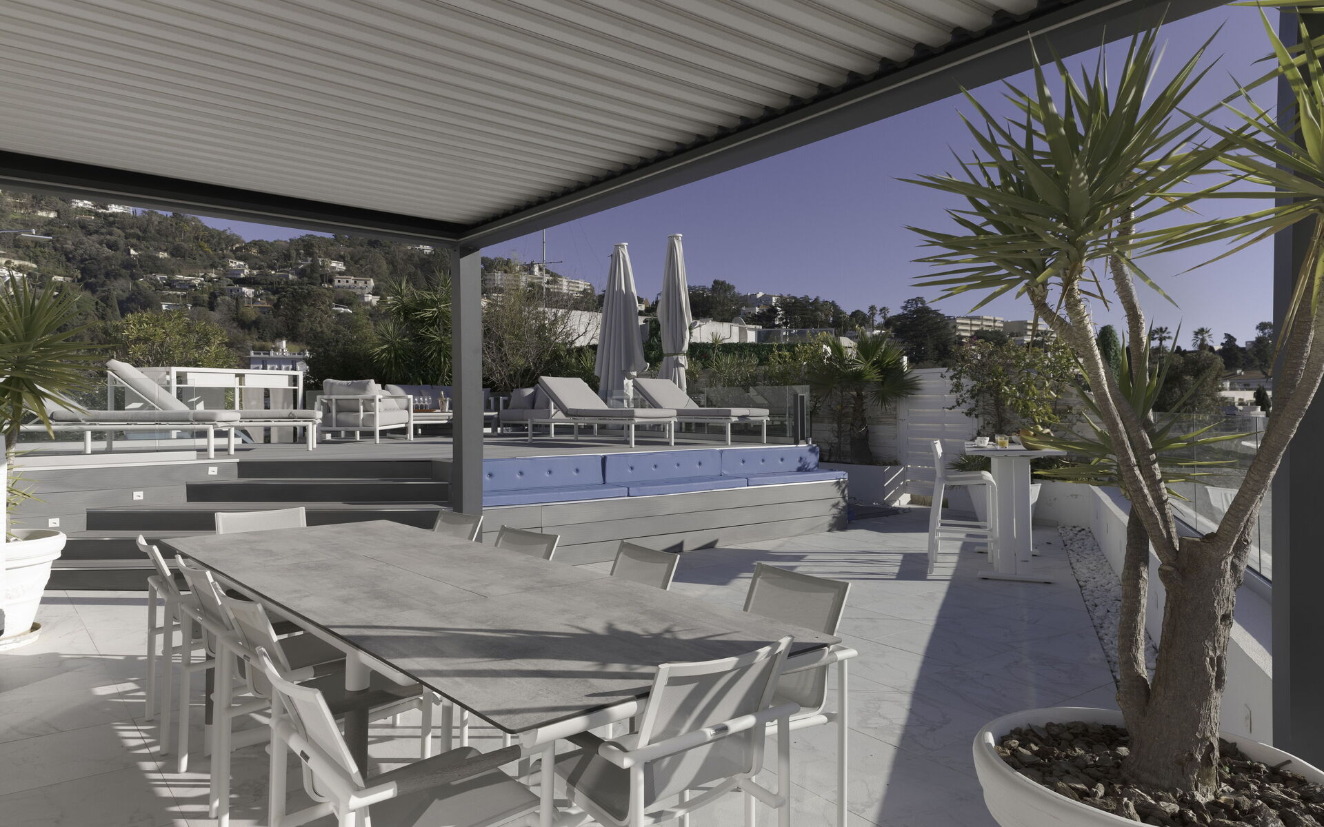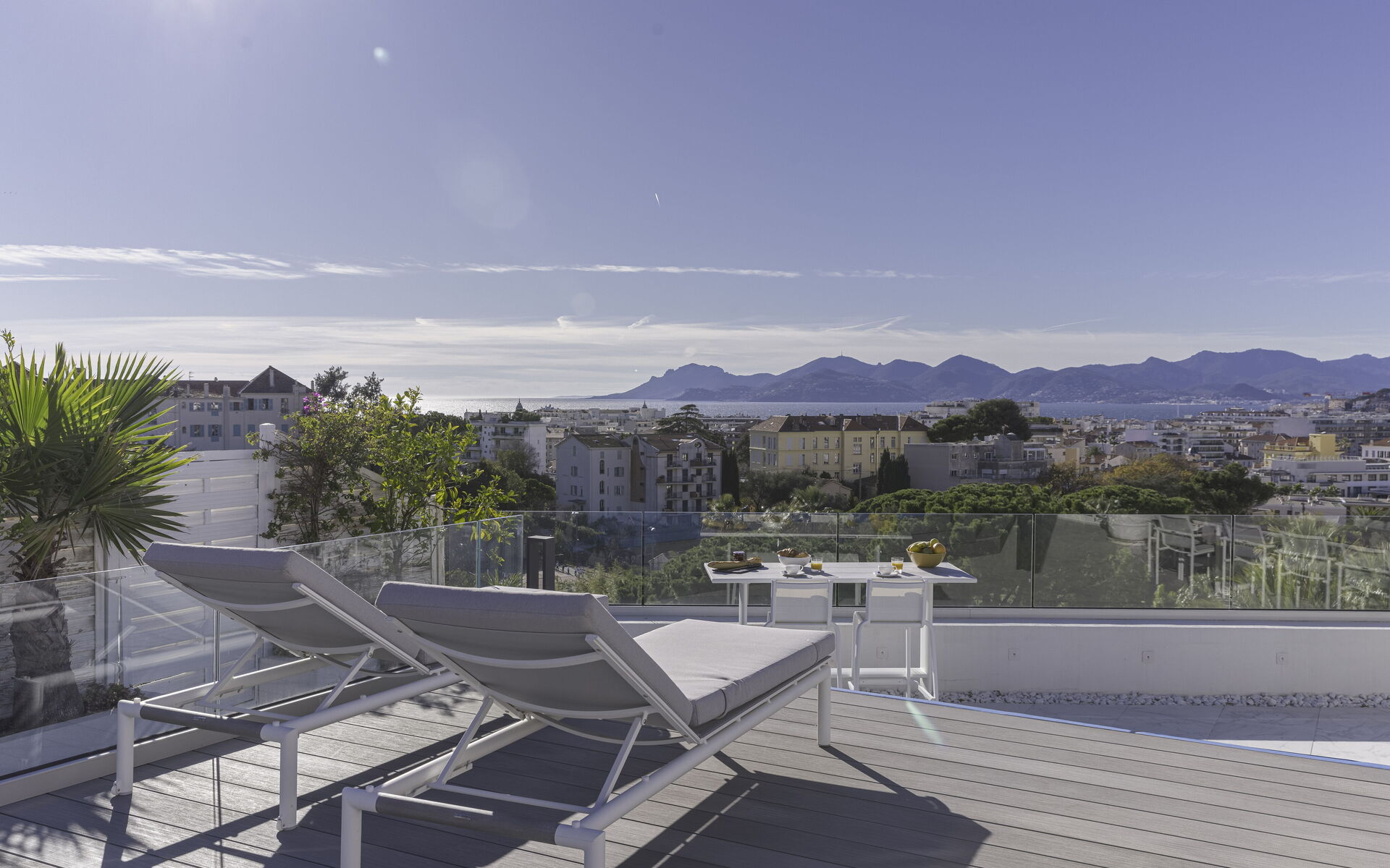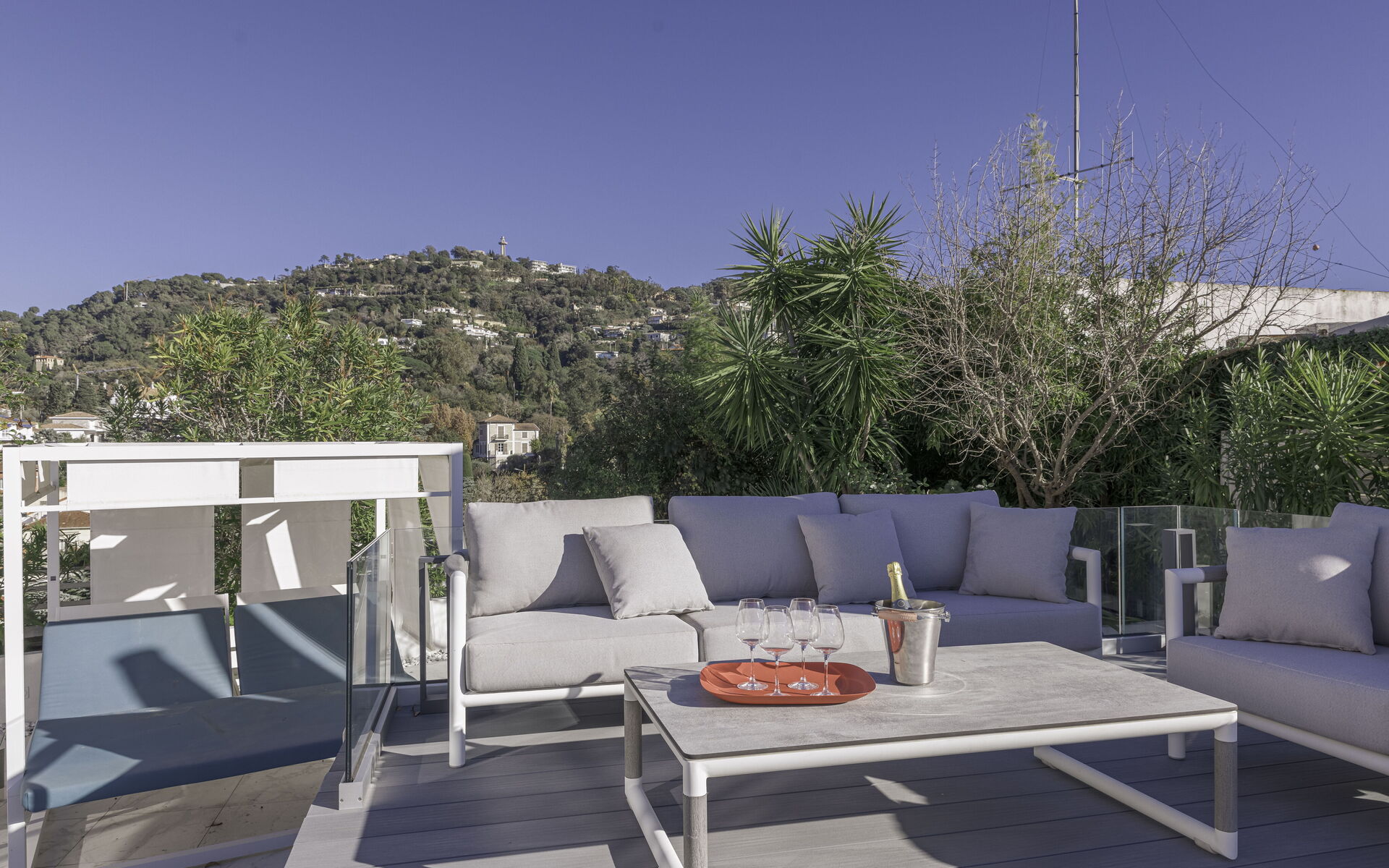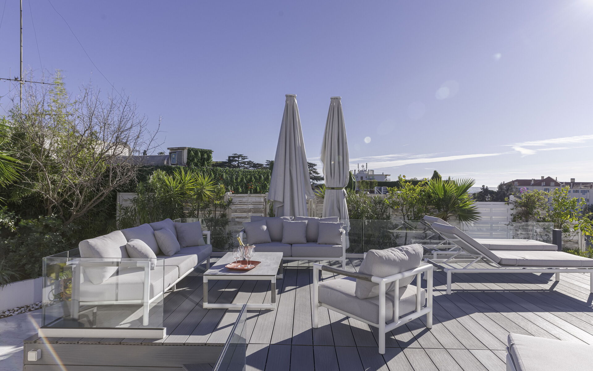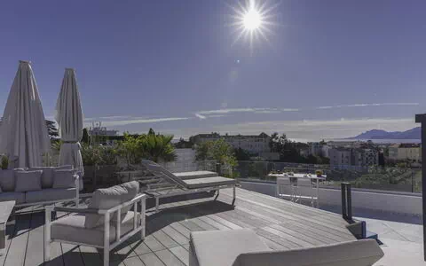 - South-facing terrace converted into a summer lounge. Panoramic sea view. dining table for 10, lounge area, sun beds