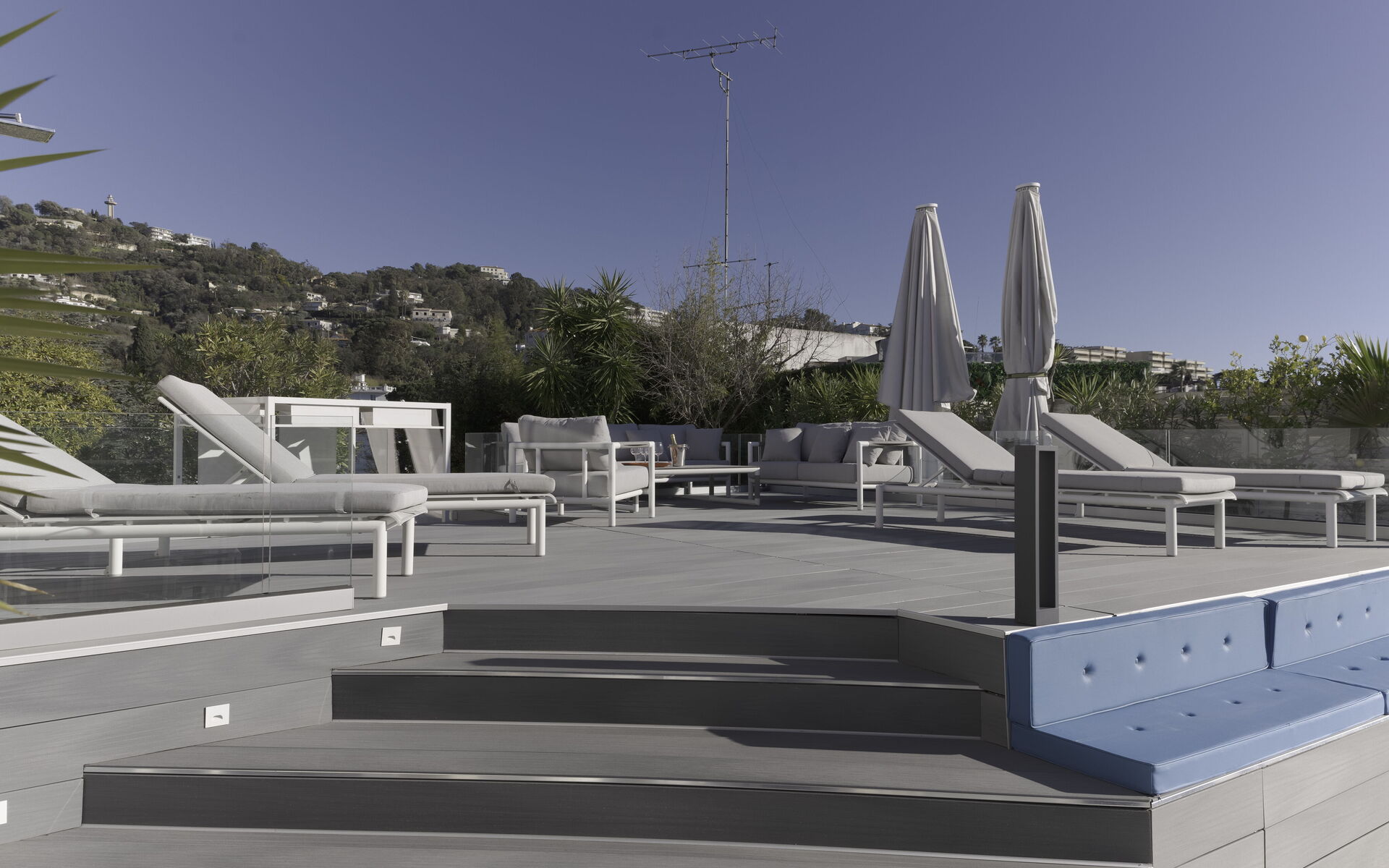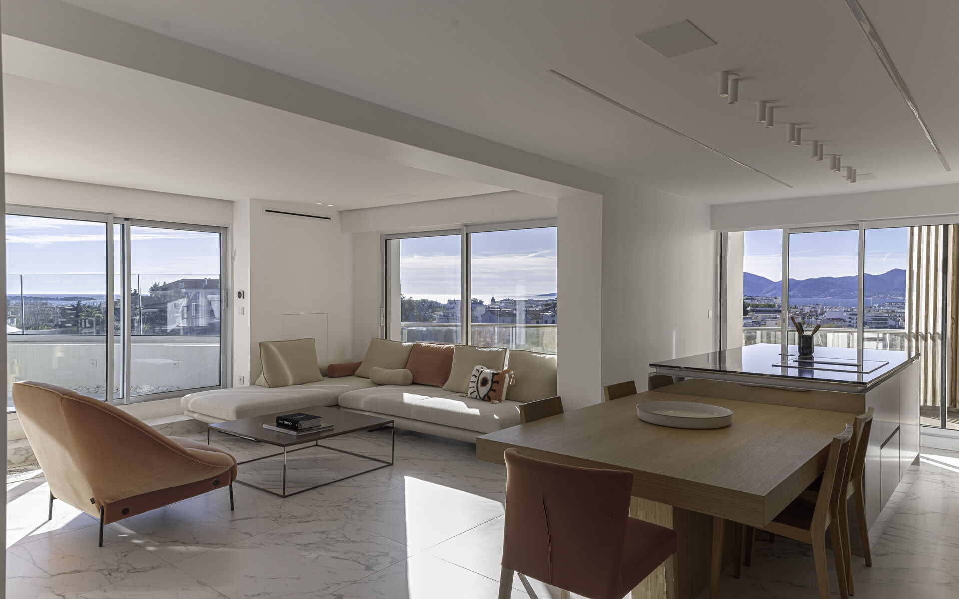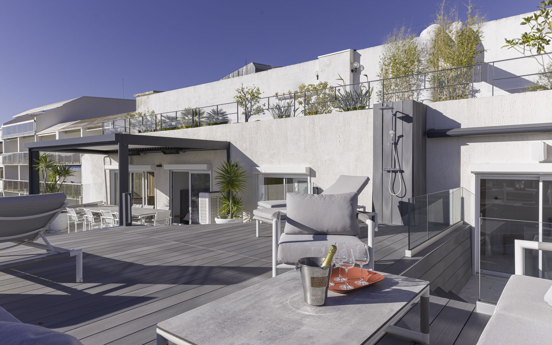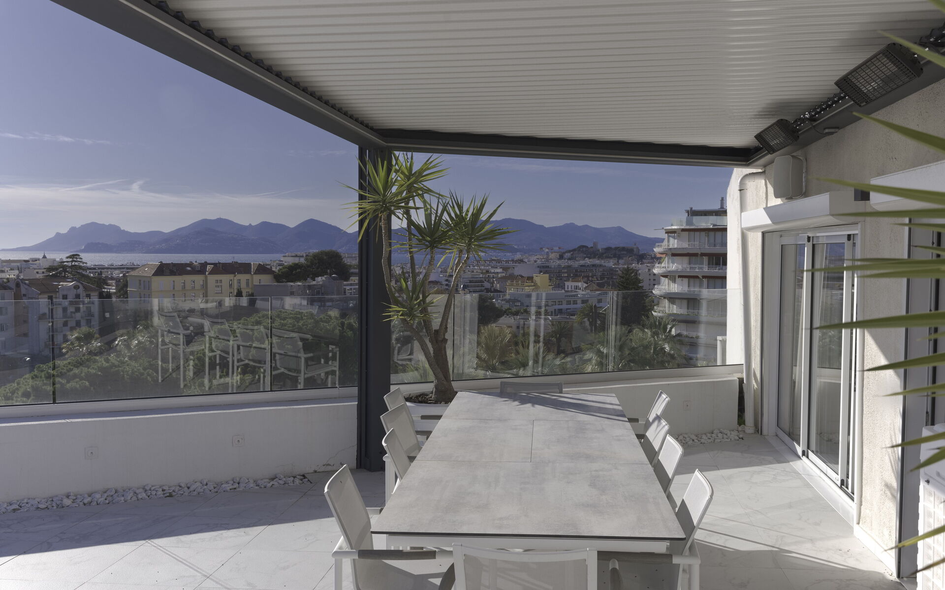 - South-facing terrace converted into a summer lounge. Panoramic sea view. dining table for 10, lounge area, sun beds