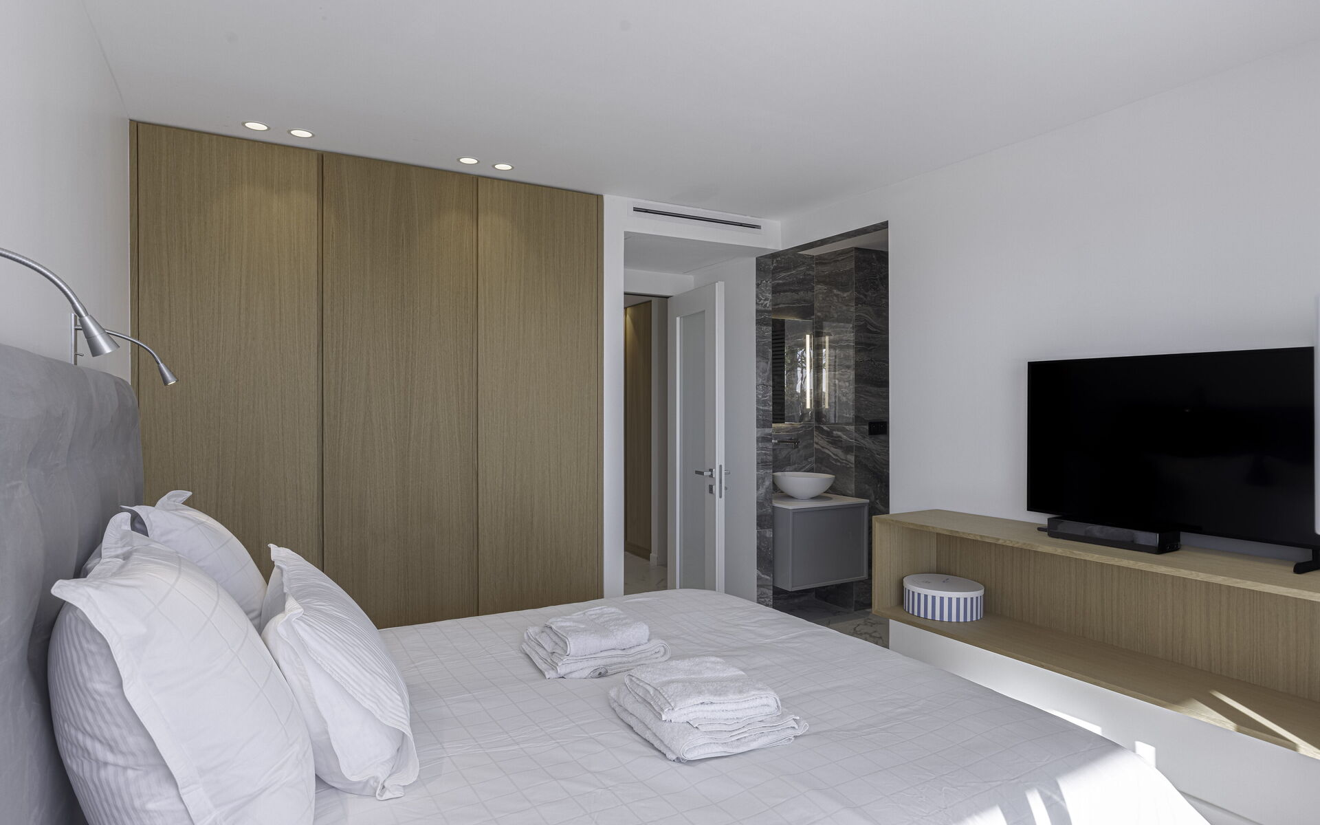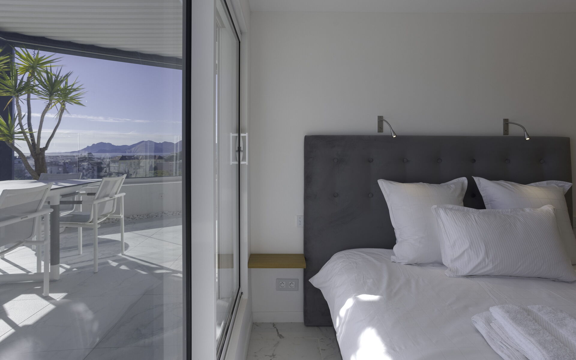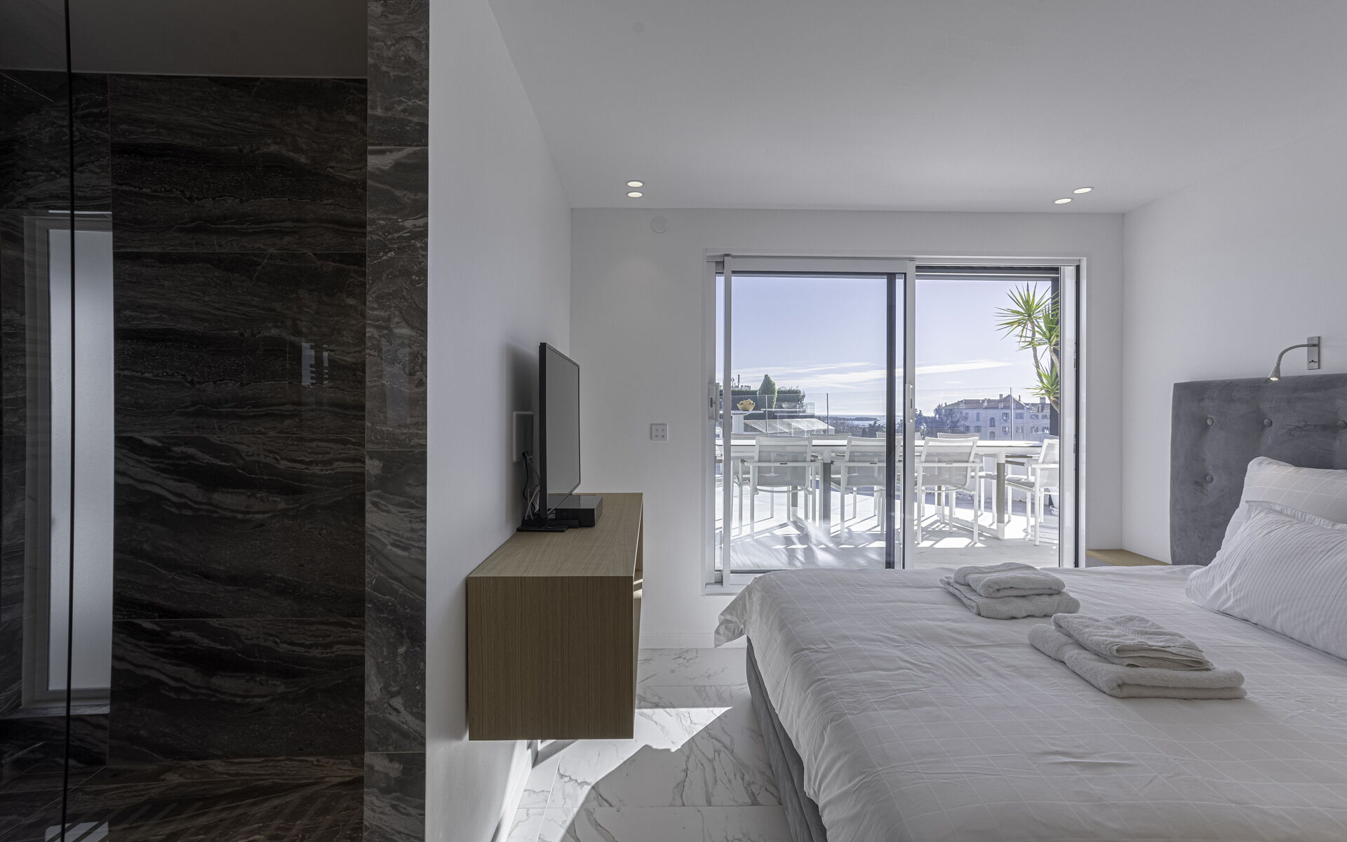 South-facing bedrooms opening onto the sea view terrace - all with private flat screen TV