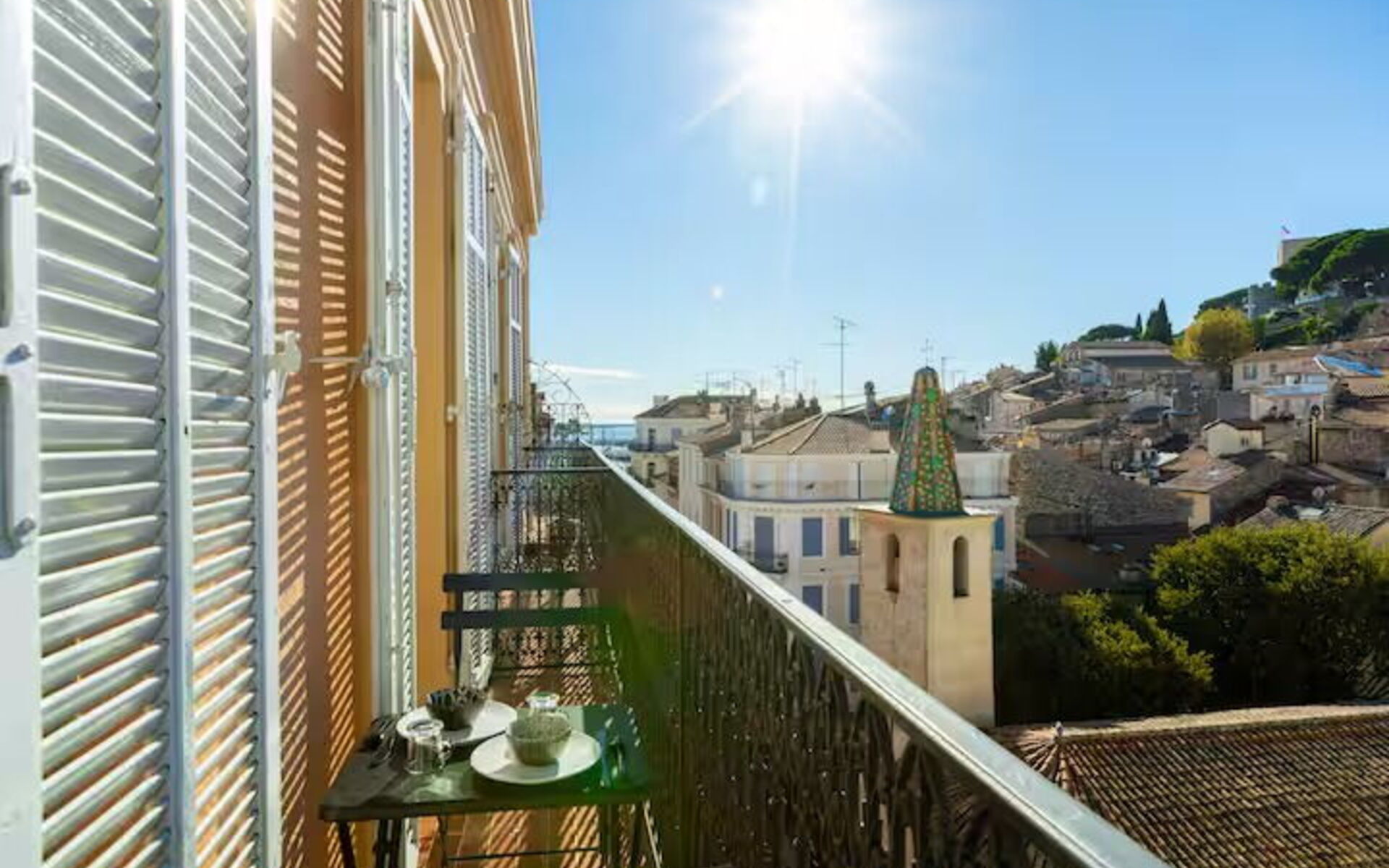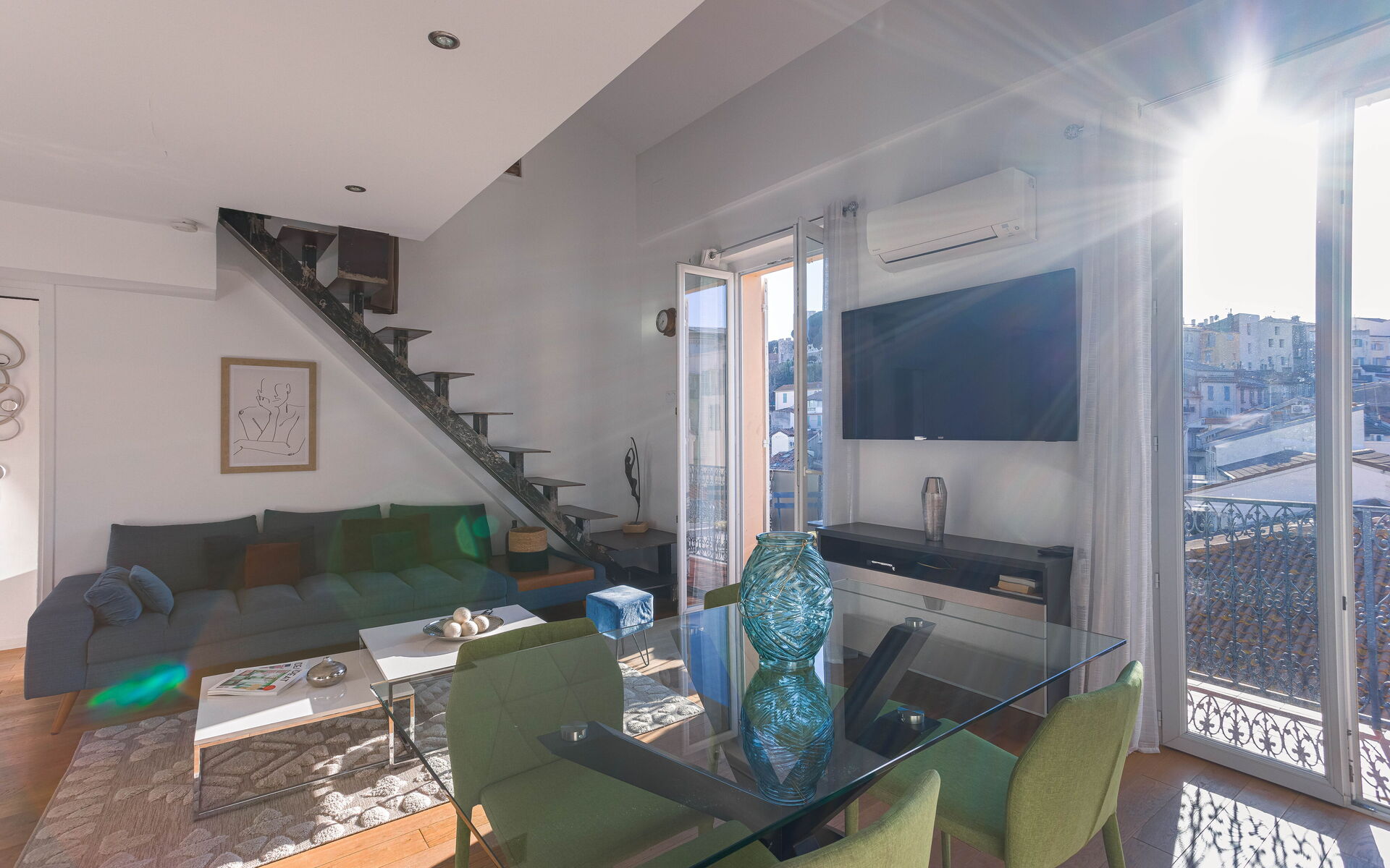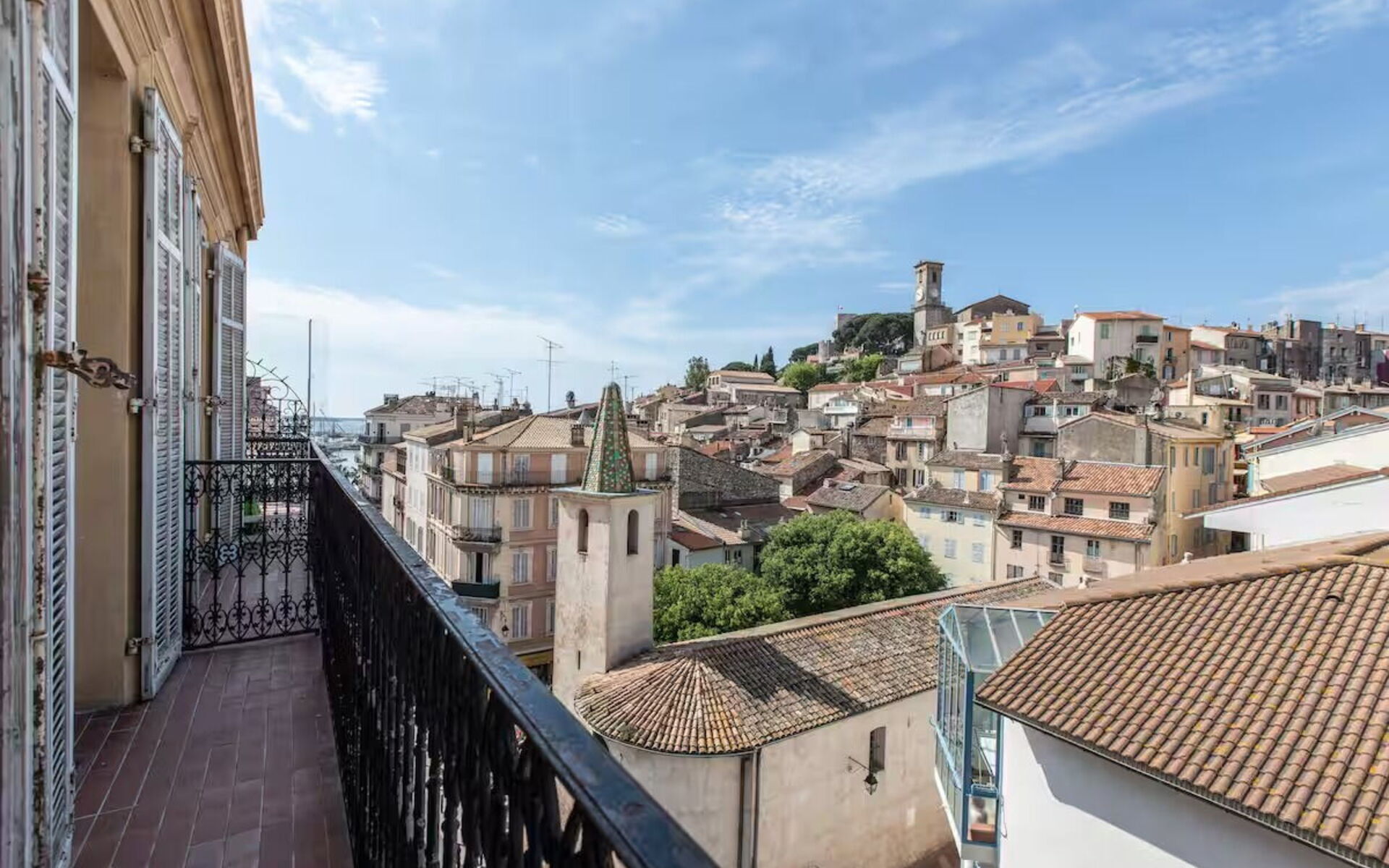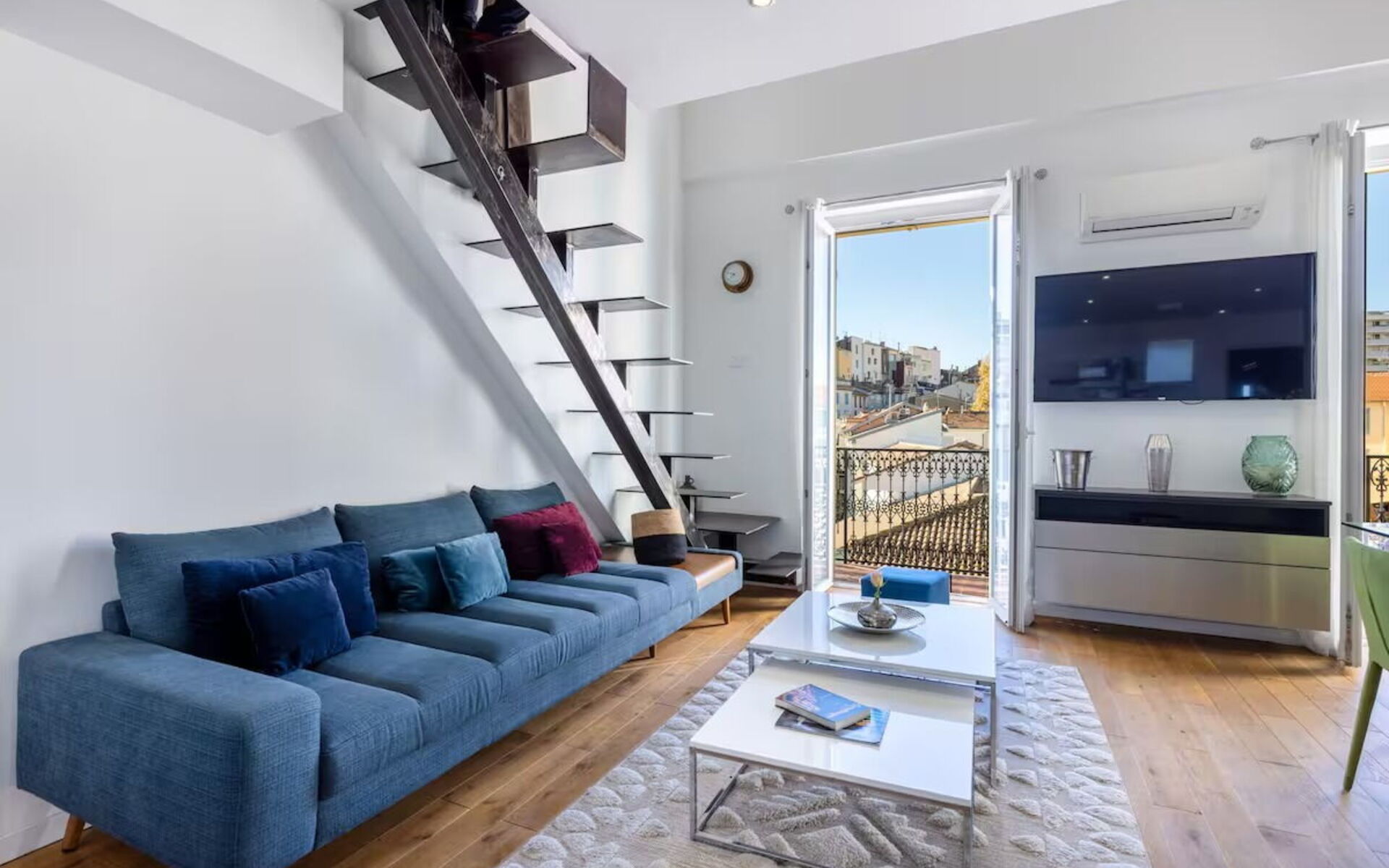 You'll be in awe of the gorgeous view from this duplex apartment in Cannes, light-filled, loft-like space with a commanding position overlooking the surrounding city. Step outside onto the balcony with your morning coffee or an evening glass of wine, come home each afternoon to such comforts as air conditioning and a washer/dryer and enjoy easy walking access to beaches, the port, and the Palais des Festivals.