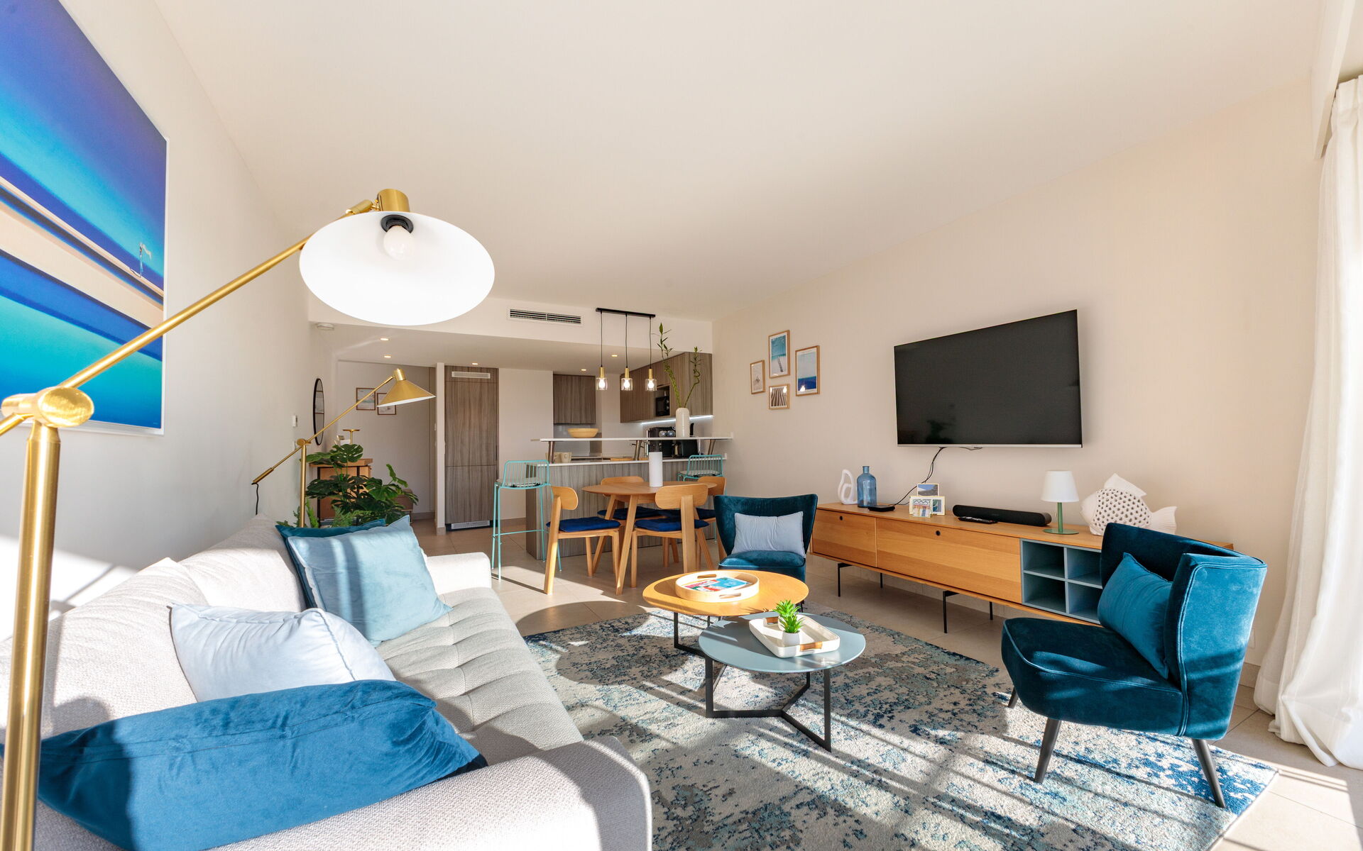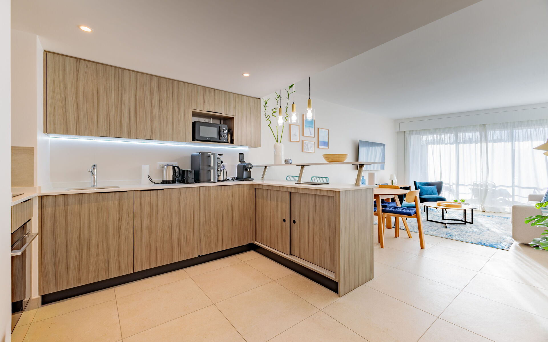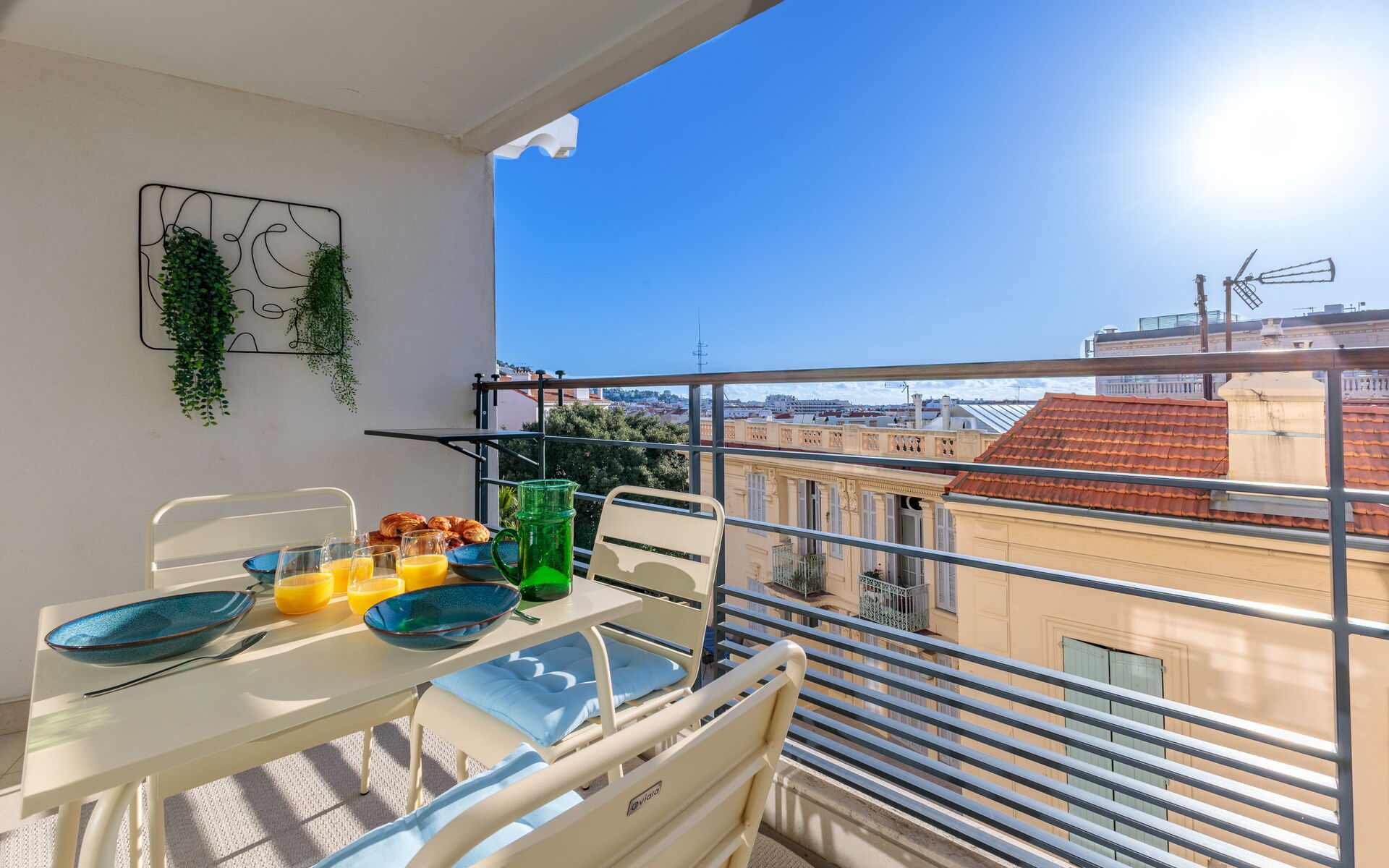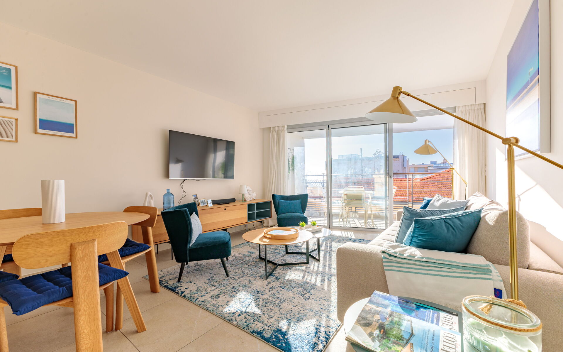 - Living room opening onto a sunny terrace with dining table