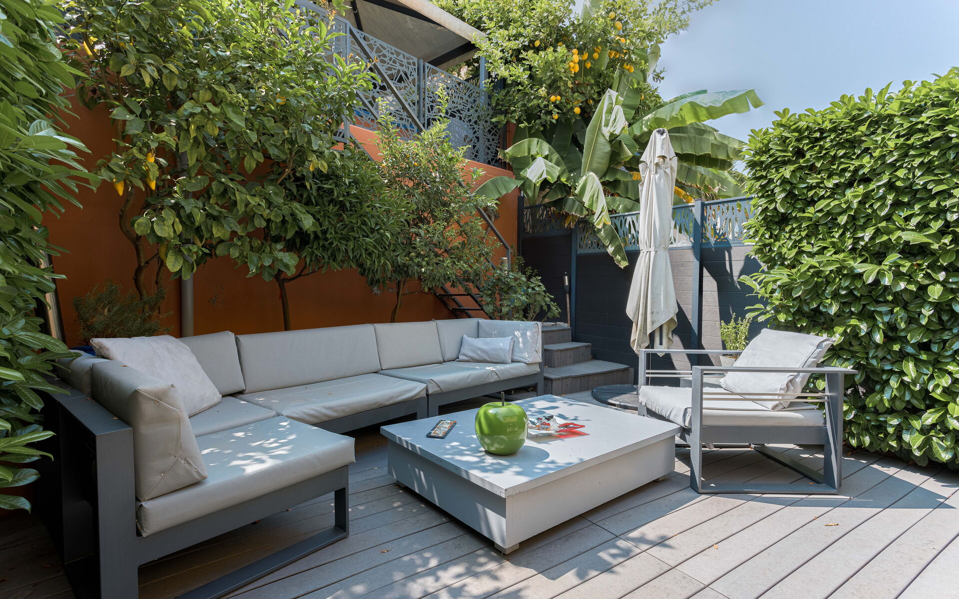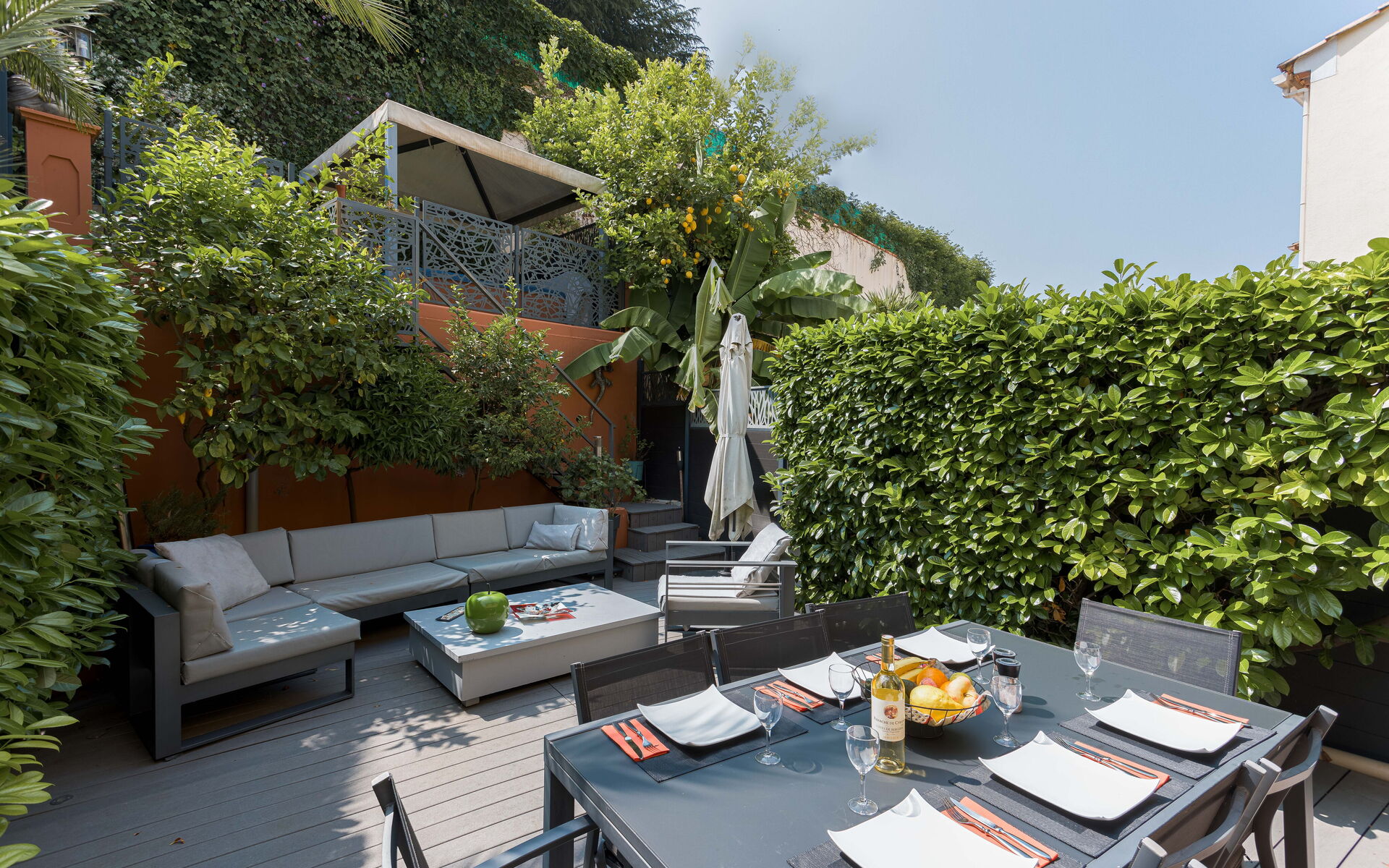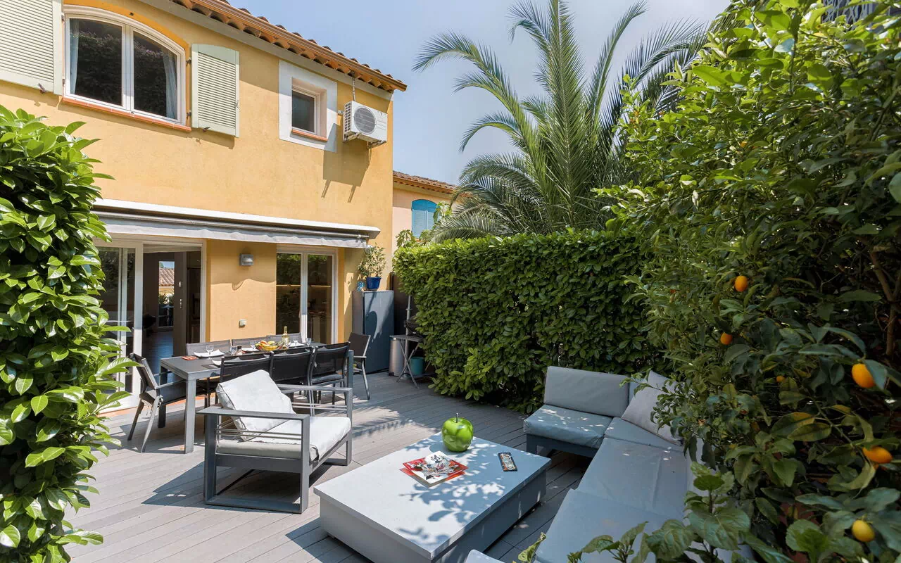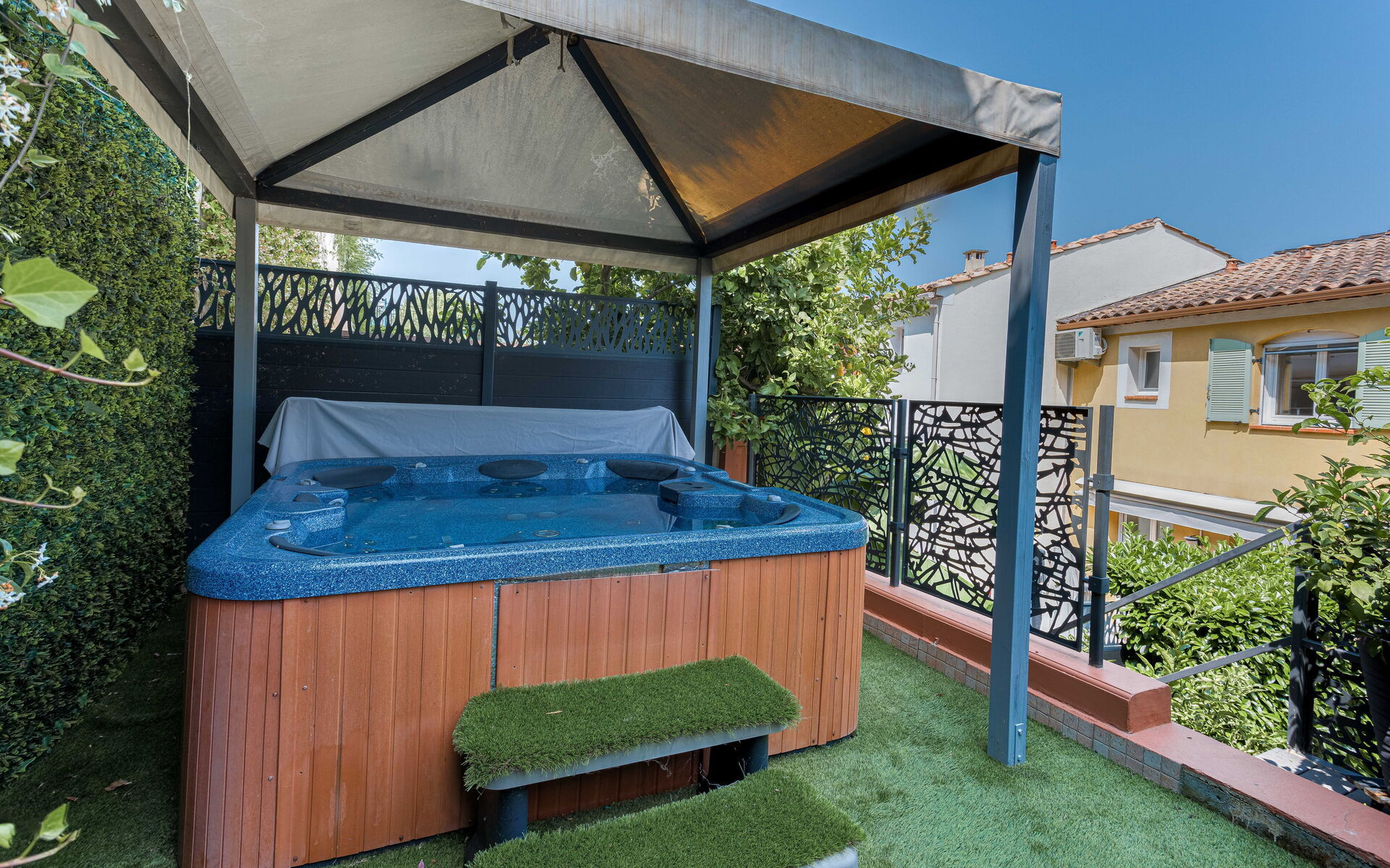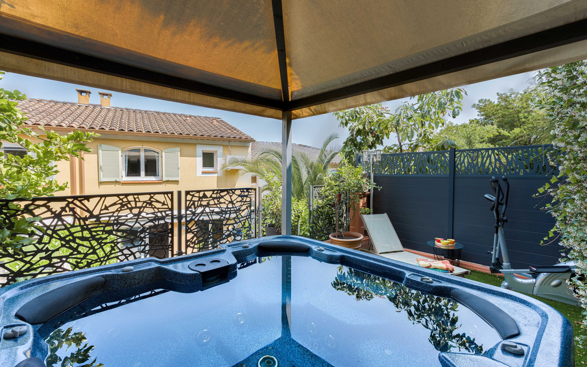 - Large living room opening onto shaded terrace with jacuzzi and barbecue