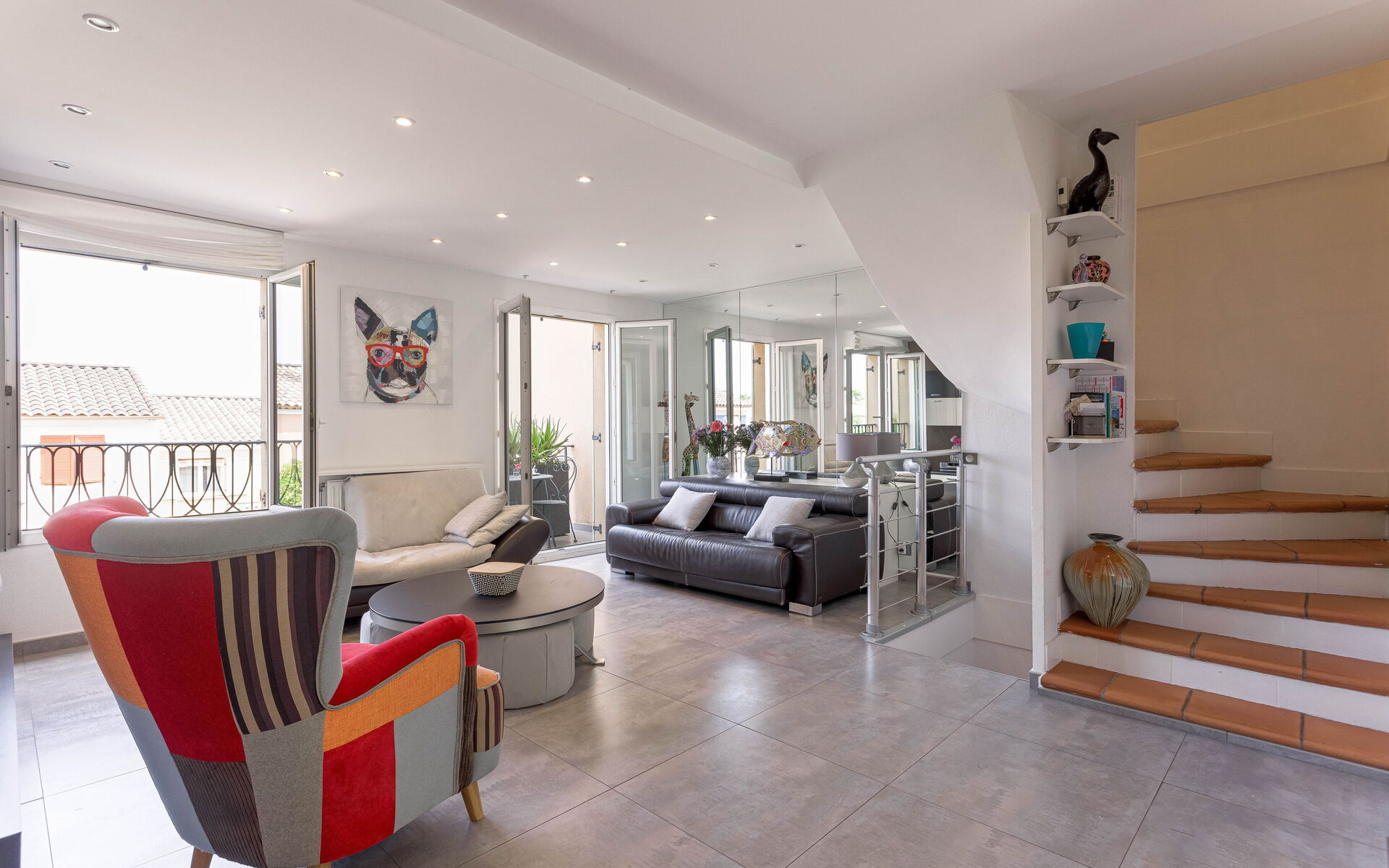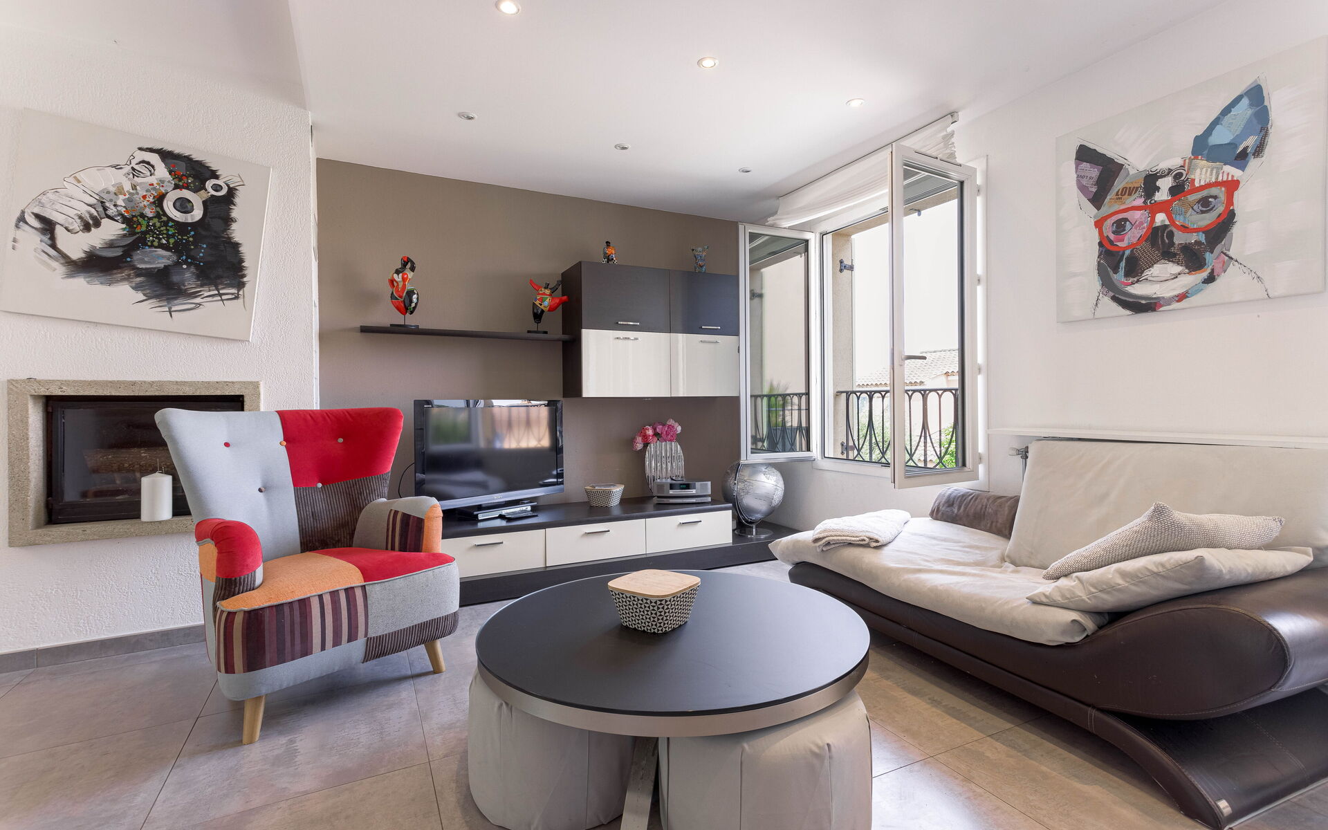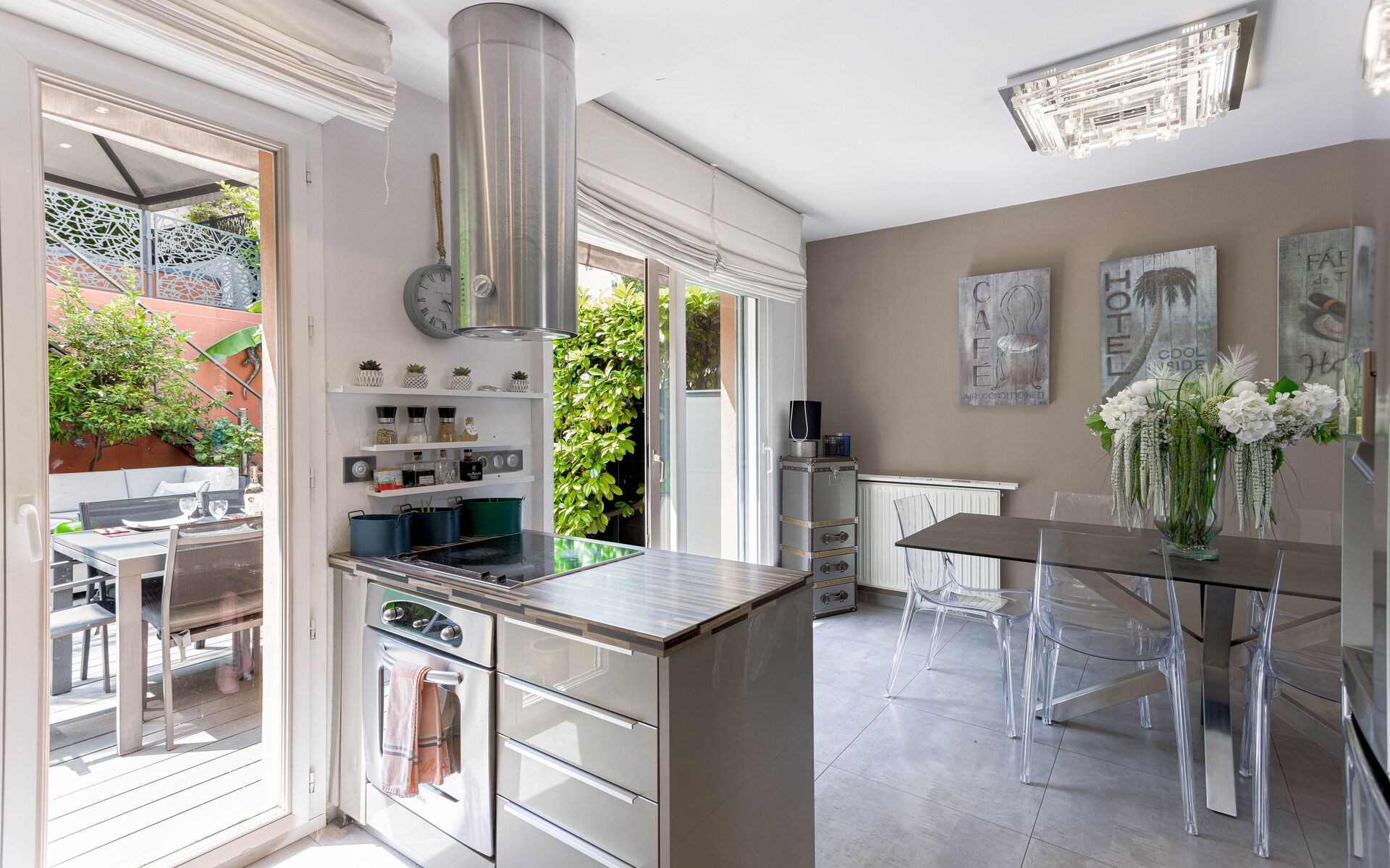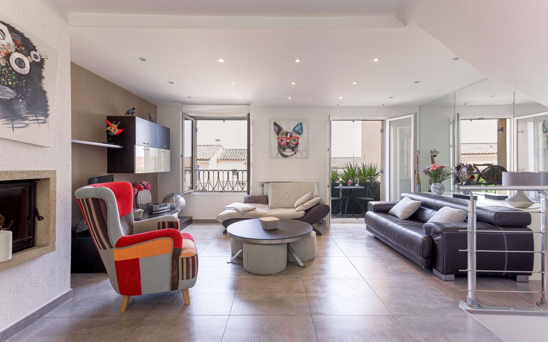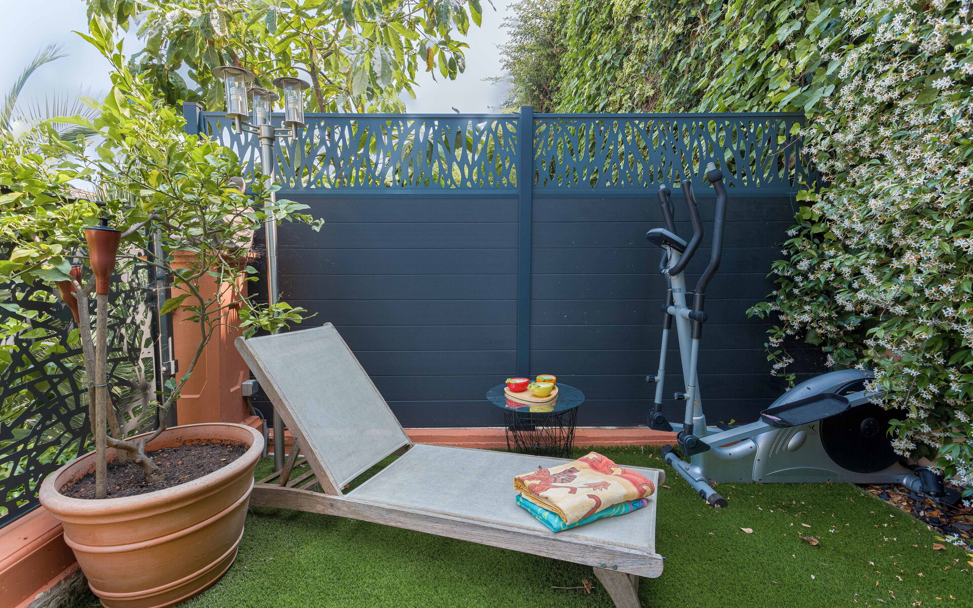 - Large living room opening onto shaded terrace with jacuzzi and barbecue