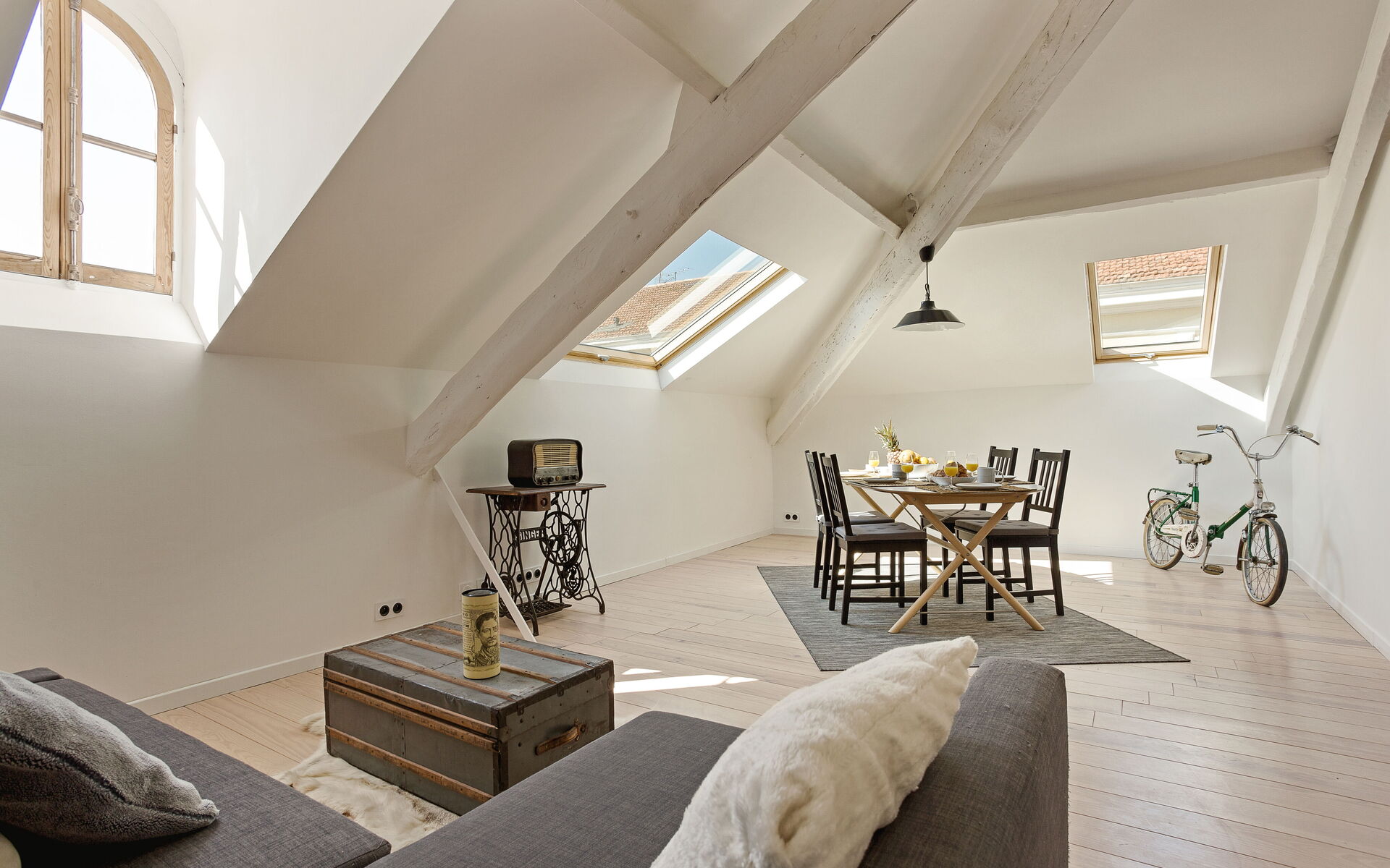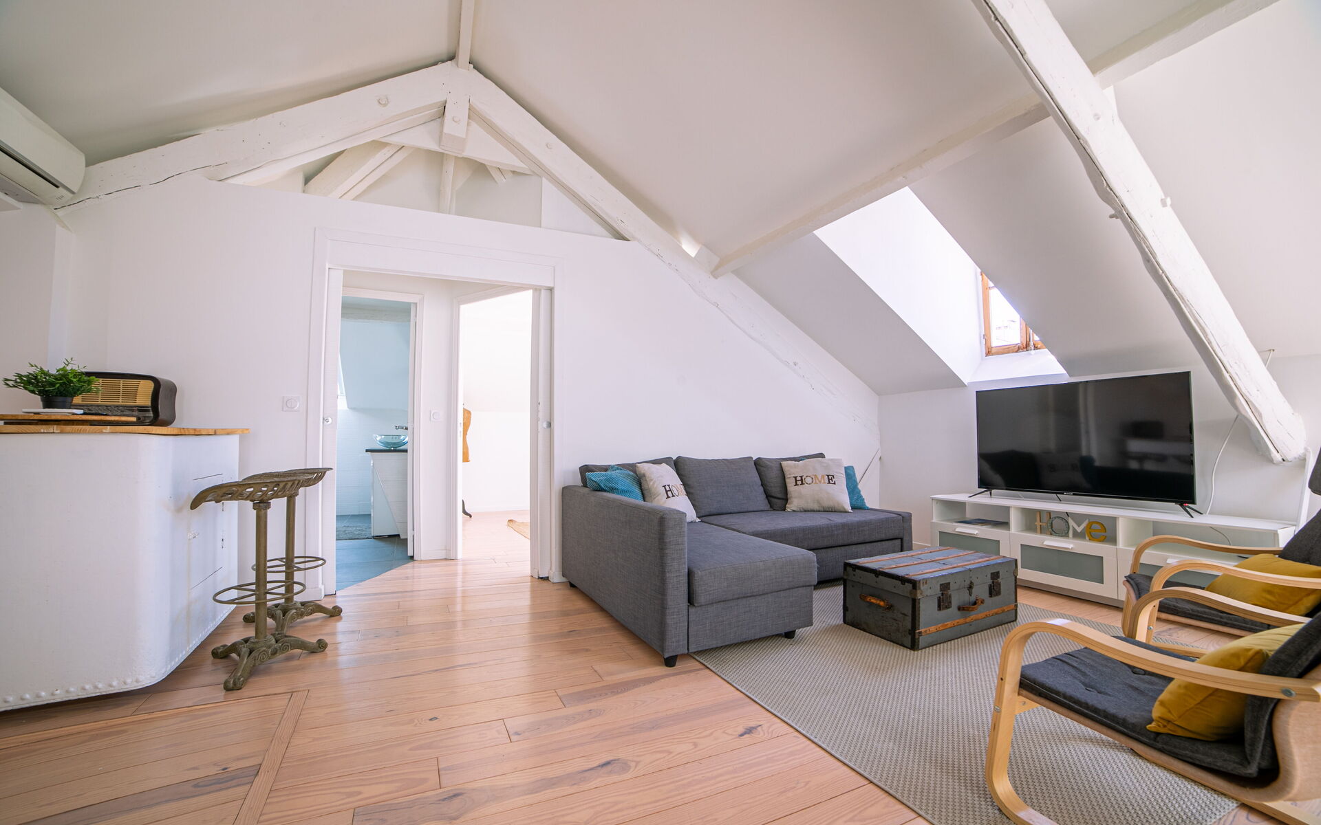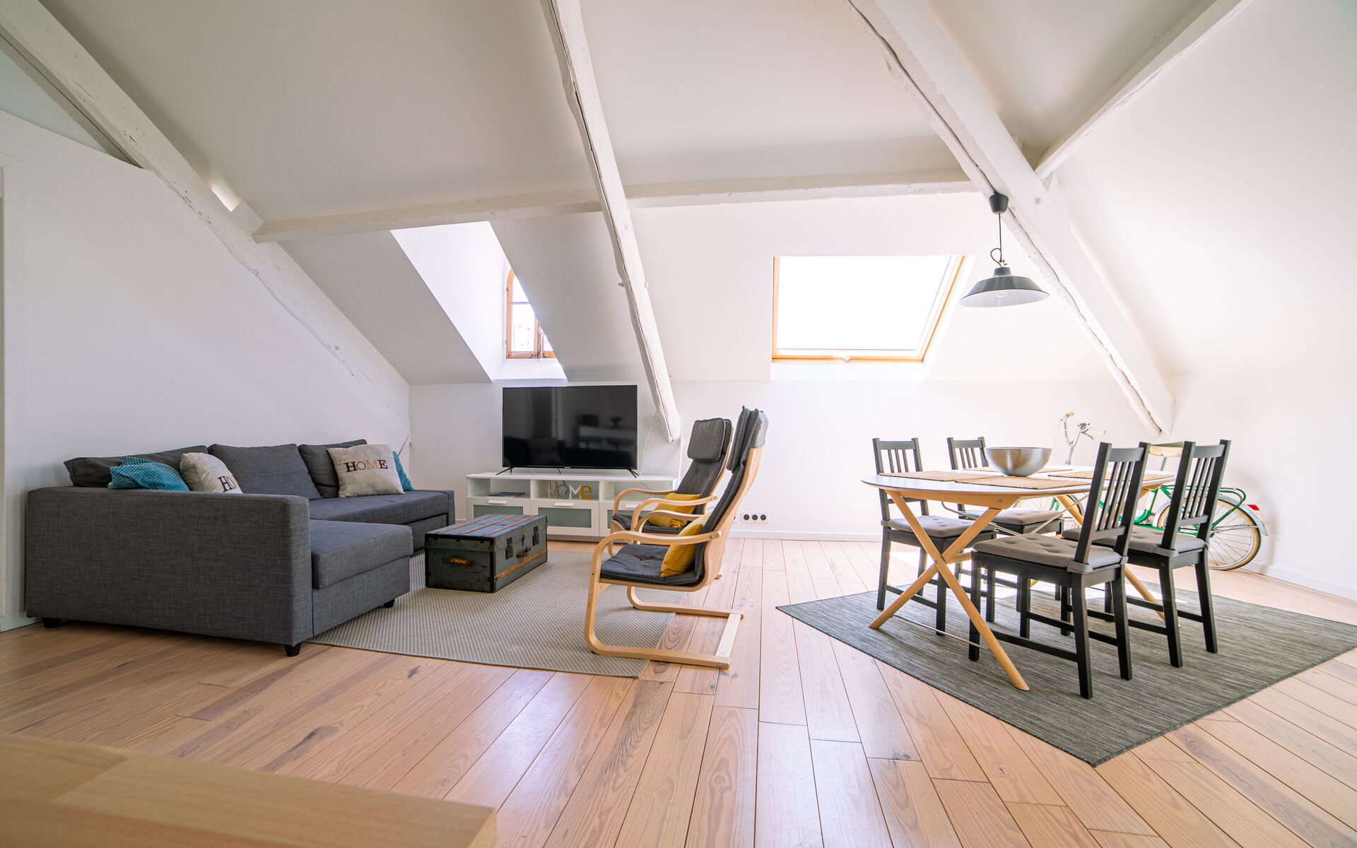 - Living room : flat screen TV + sofa + dining area