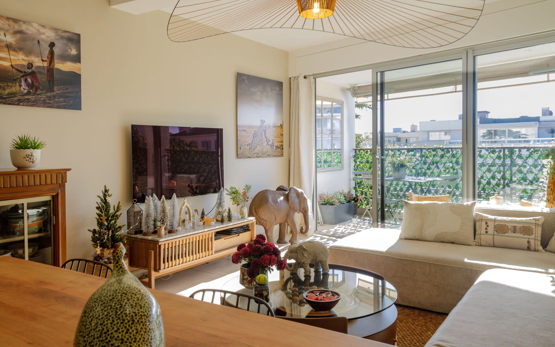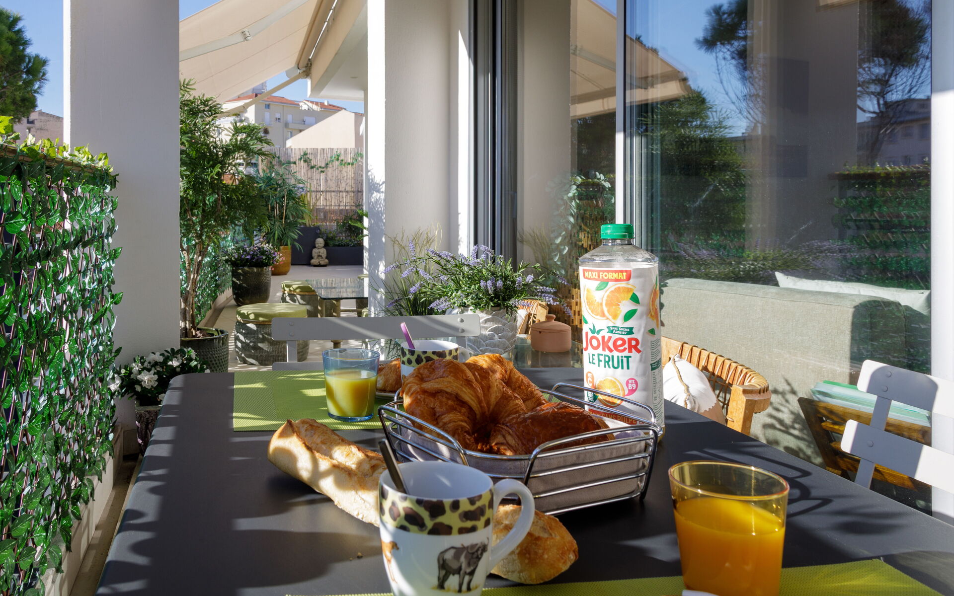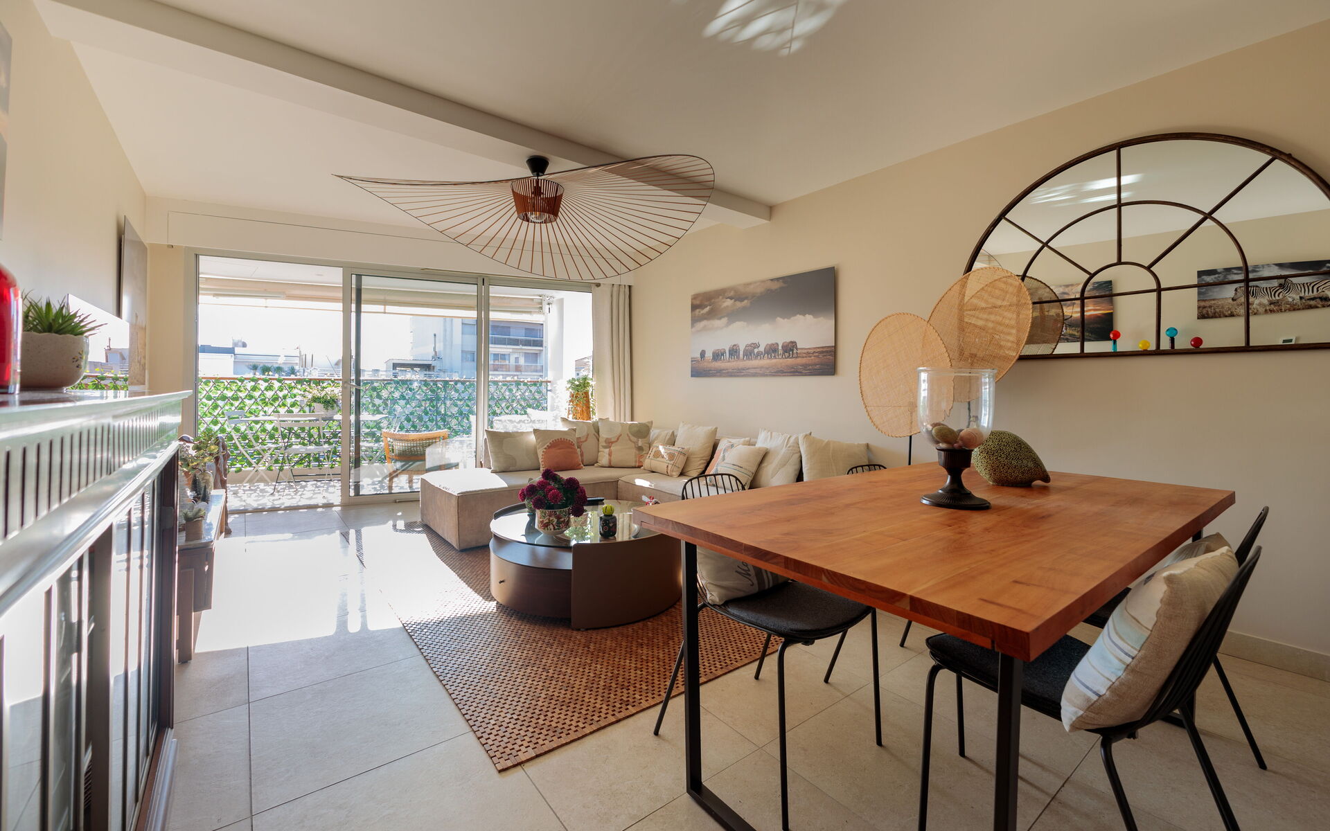 - Living room opening onto a sunny terrace with dining table