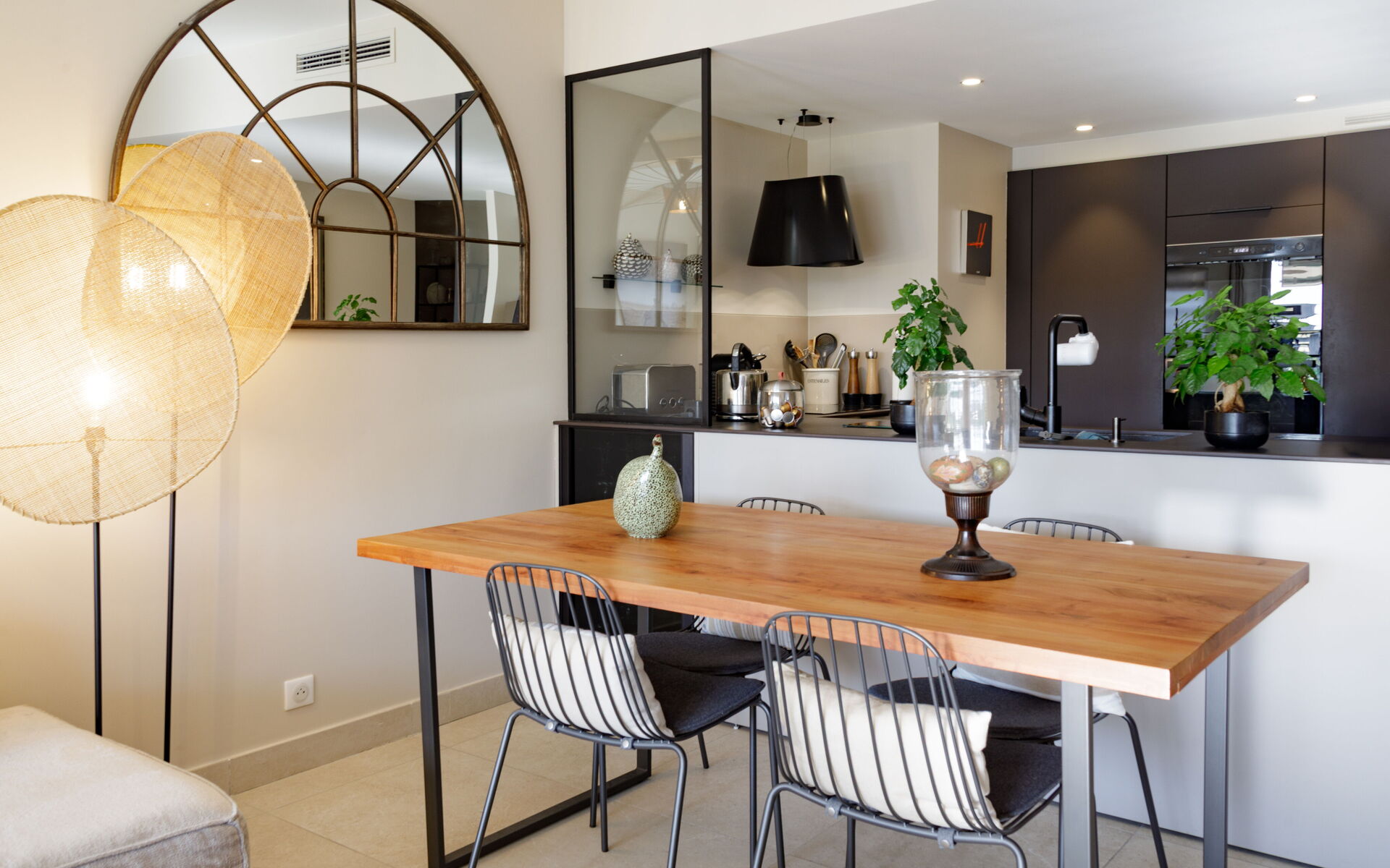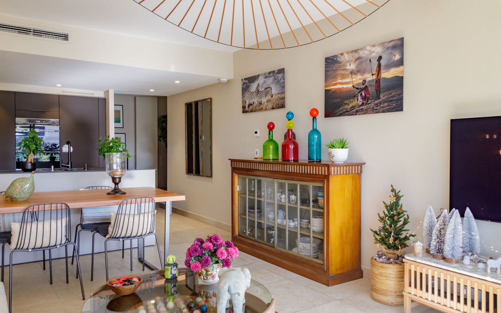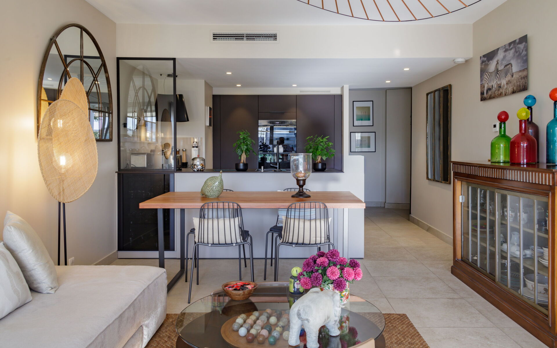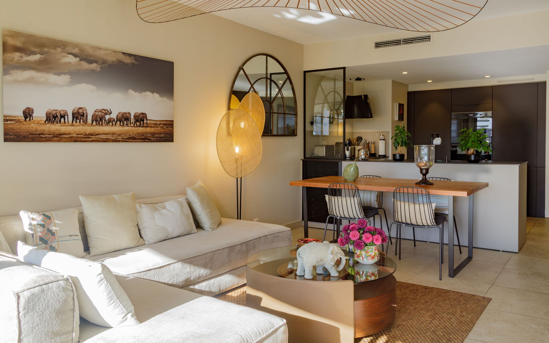 - Living room opening onto a sunny terrace with dining table