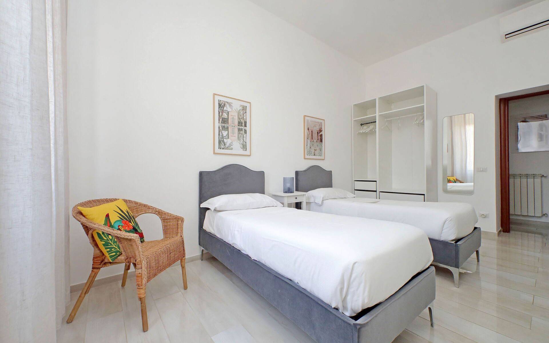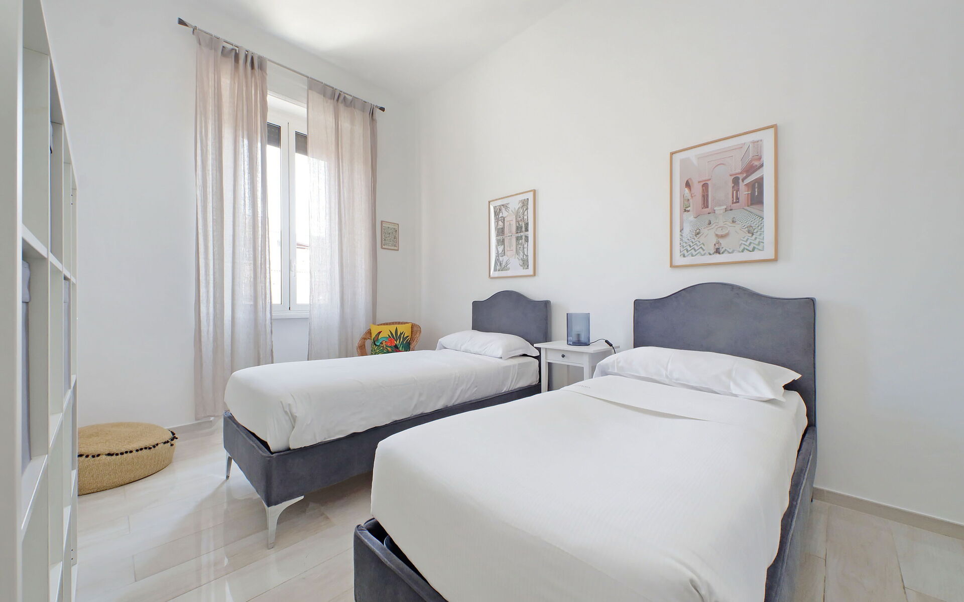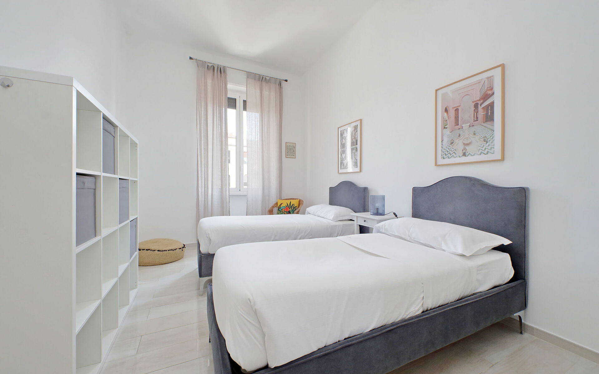 La seconda camera da letto ha due letti singoli, comodino, armadio e libreria.