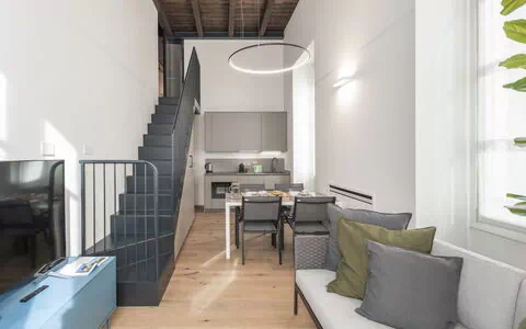 Situato al primo piano, l'appartamento dispone di una zona giorno con cucina completamente attrezzata con piano a induzione, lavastoviglie, frigorifero, microonde, bollitore, tostapane e macchina da caffè Nespresso. Il soggiorno è arredato con un divano e una Smart TV da 55". Al piano inferiore si trovano una camera matrimoniale e un bagno con doccia, mentre nel soppalco è presente una camera matrimoniale e un bagno con doccia senza bidet. Parte del sottoscala è adibito a ripostiglio con lavasciuga. L'appartamento è dotato di un sistema di climatizzazione gestito da remoto, che regola automaticamente la temperatura per garantire comfort ed efficienza energetica. È inoltre presente un impianto di ventilazione meccanica controllata che mantiene condizioni ambientali ottimali, regolando anche l'umidità. Per il corretto funzionamento del sistema, si consiglia di tenere le finestre chiuse.