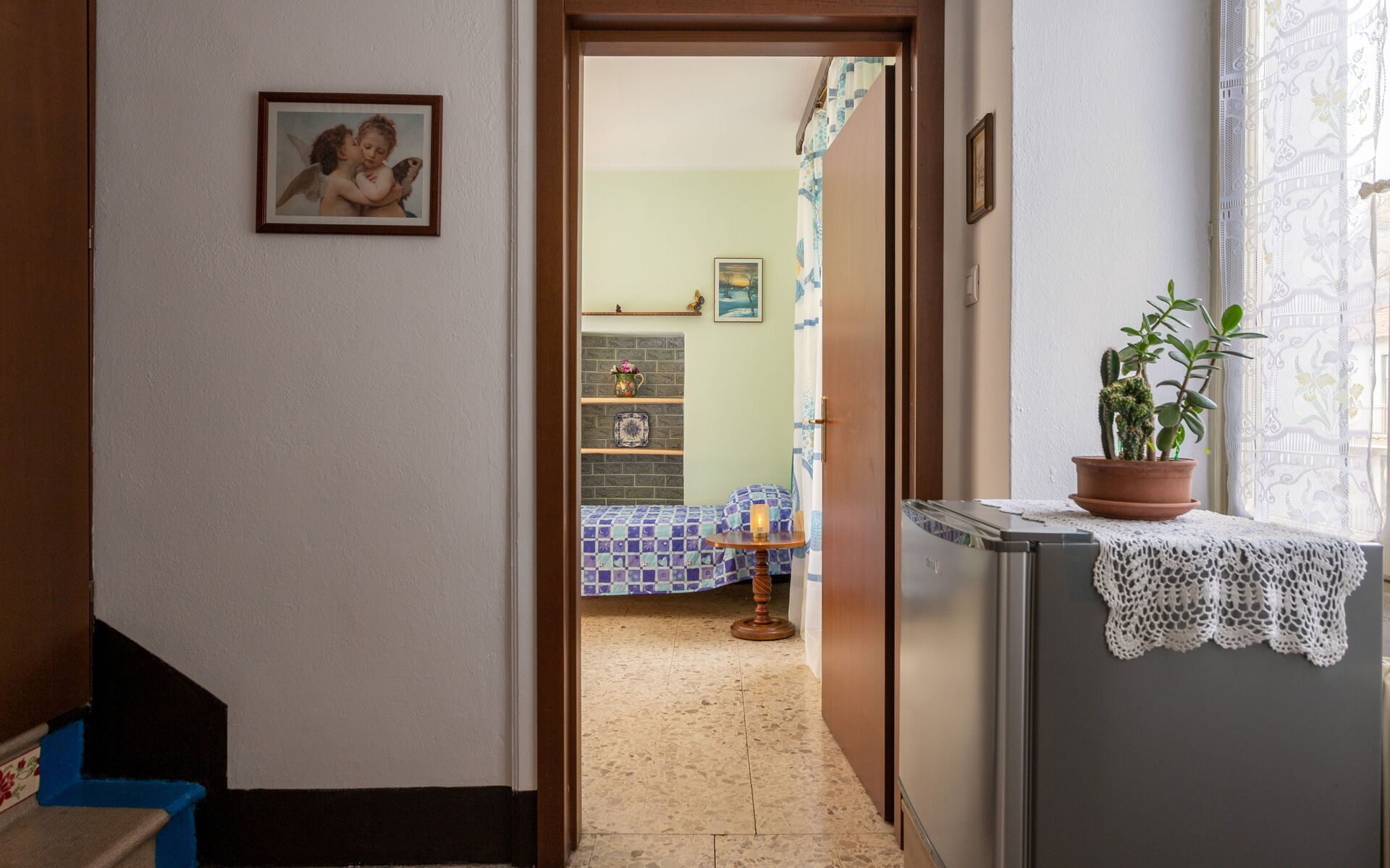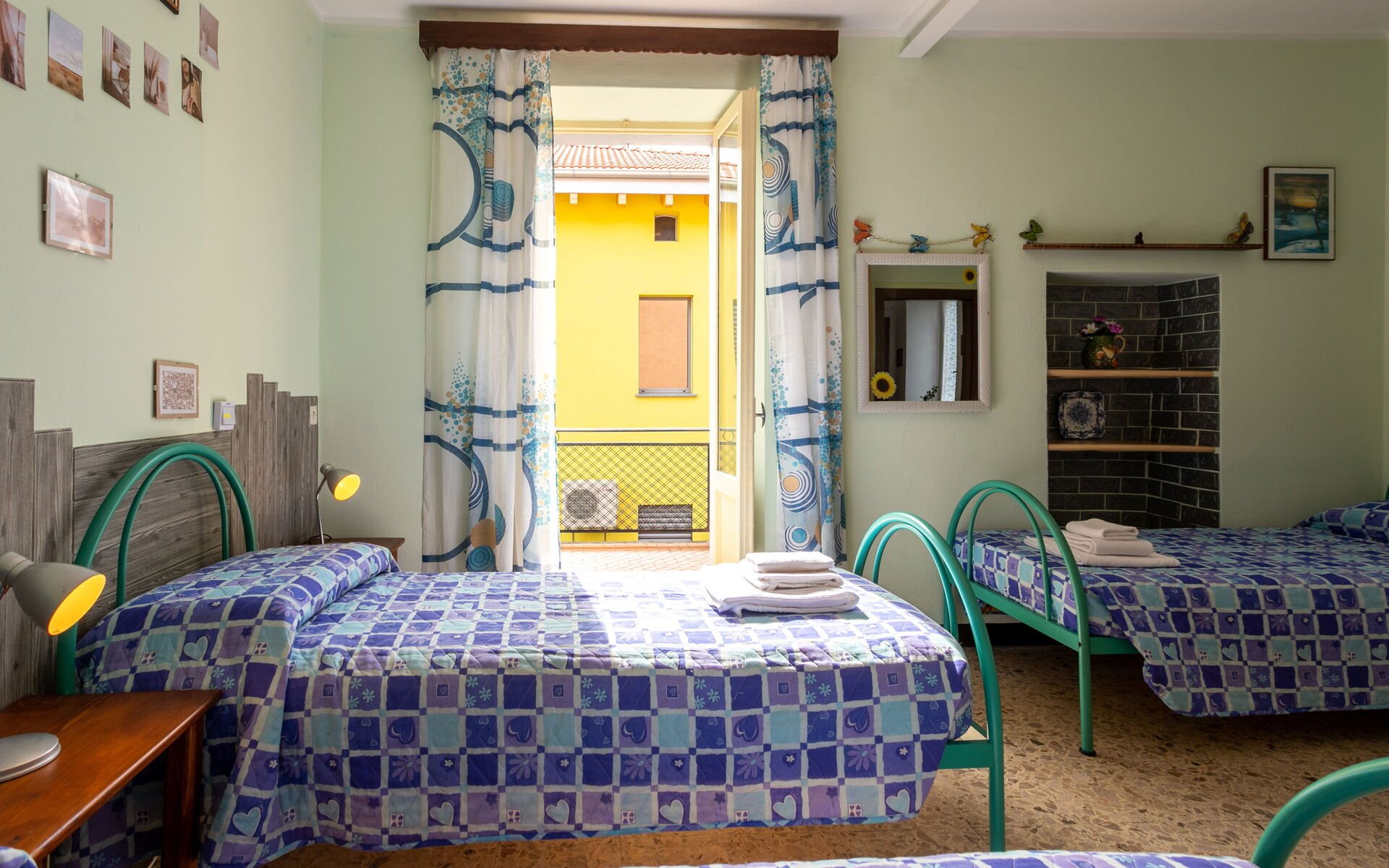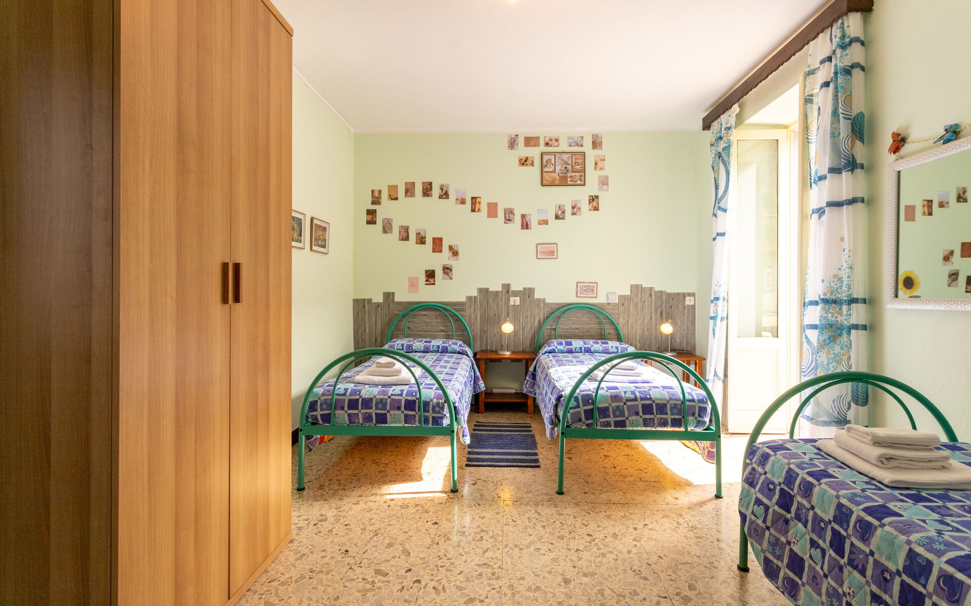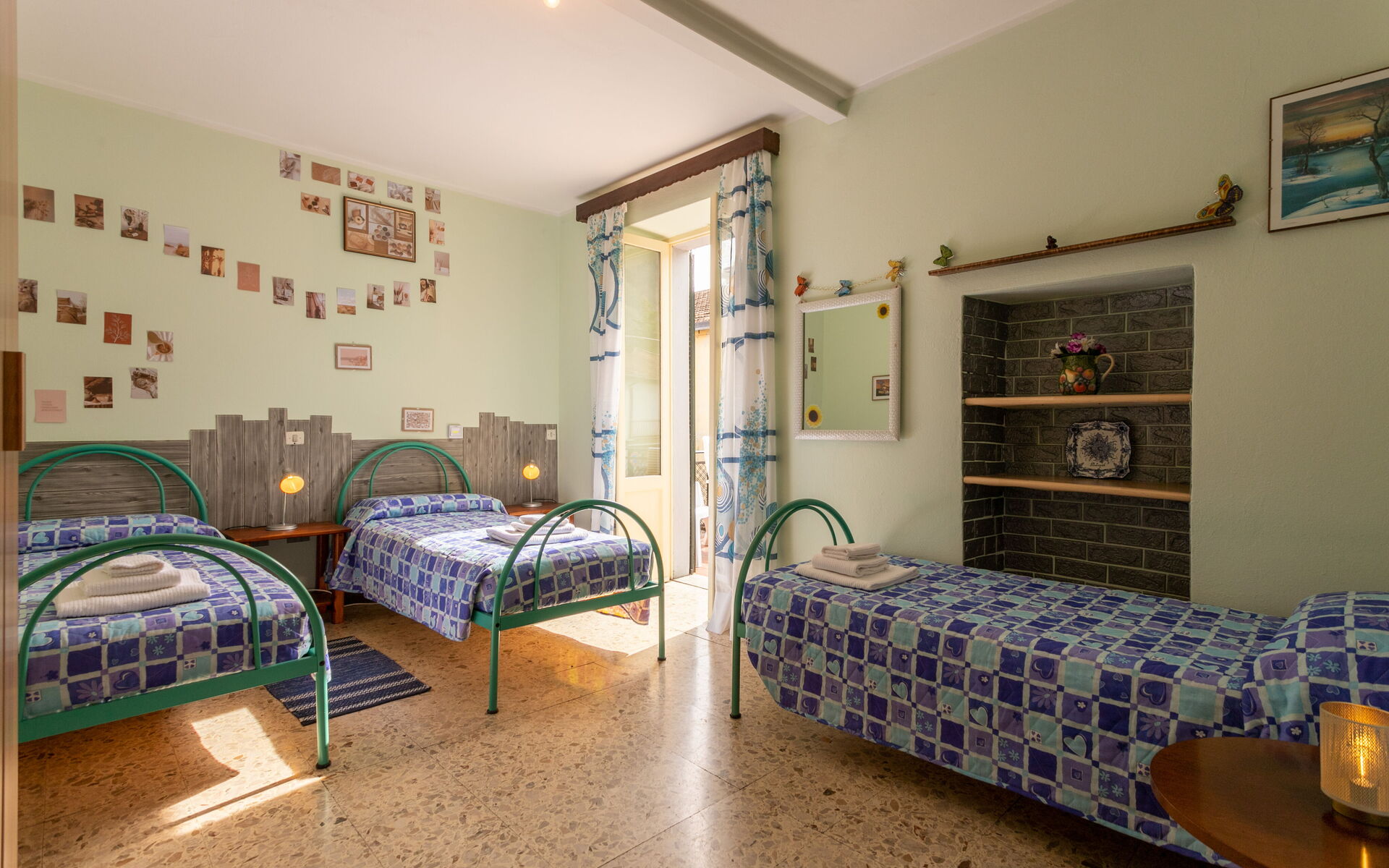 Climbing another seven steps, you reach the upper floor, which houses two bedrooms: one with a double bed and one with three single beds.