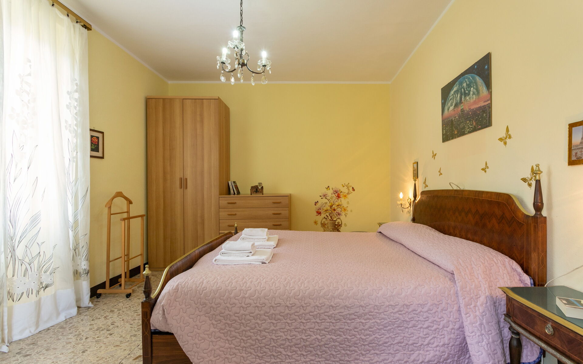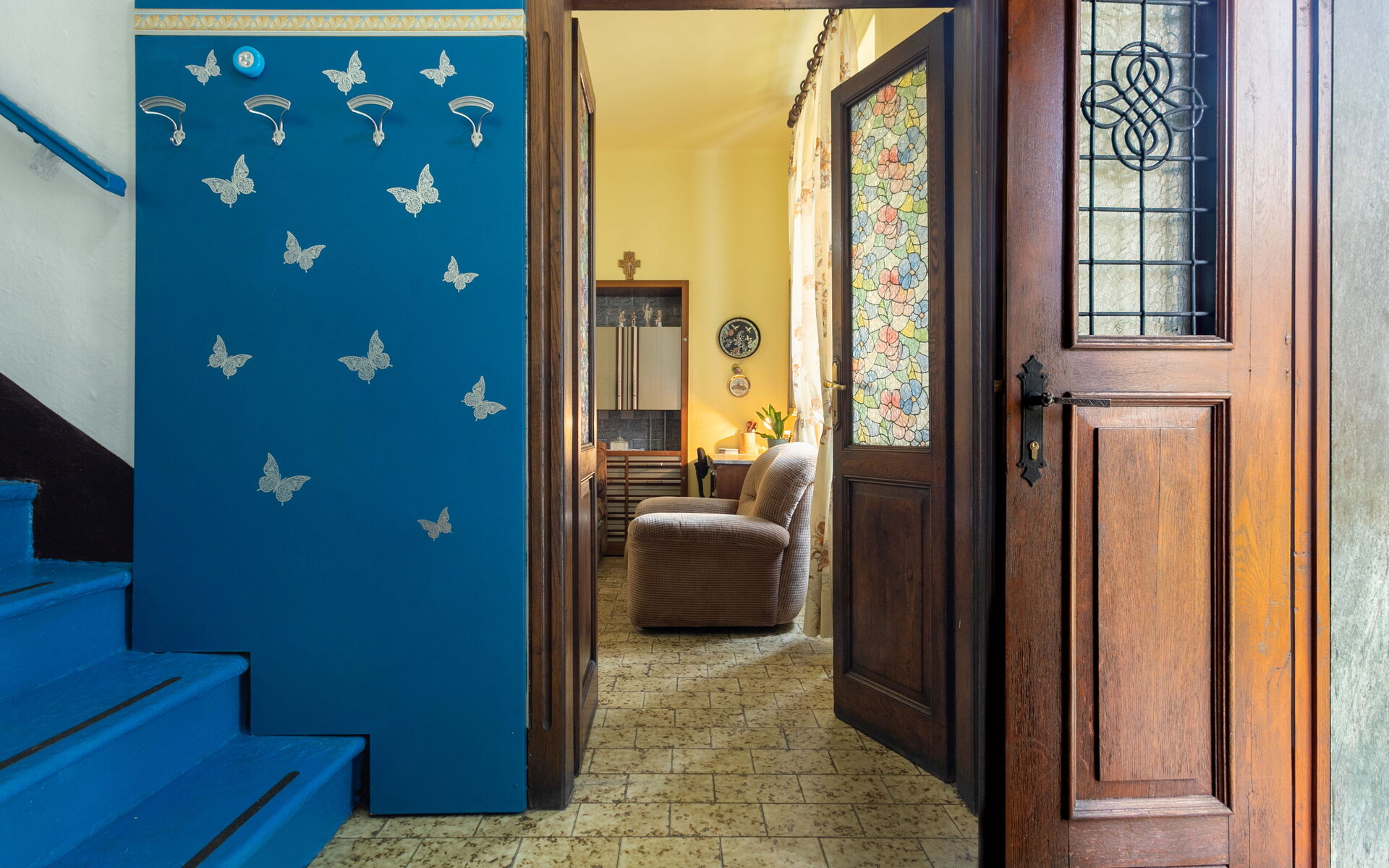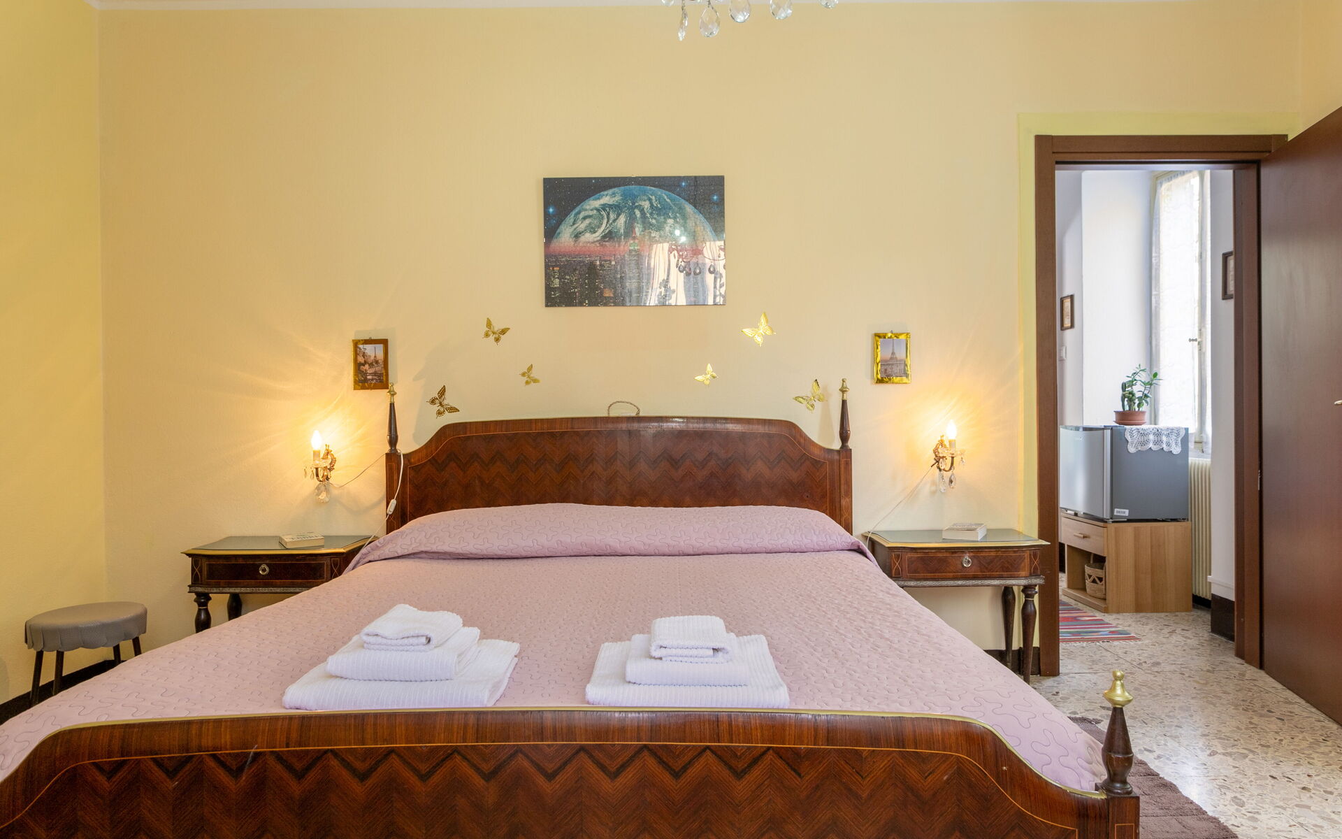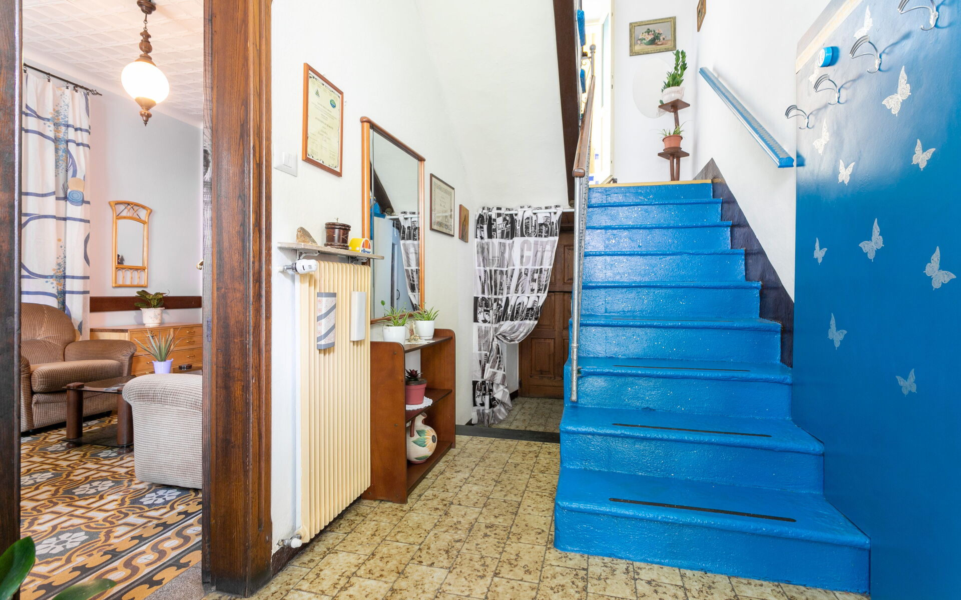 Climbing another seven steps, you reach the upper floor, which houses two bedrooms: one with a double bed and one with three single beds.