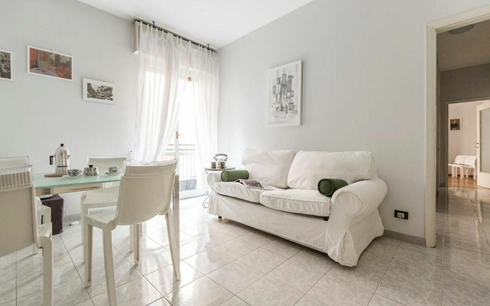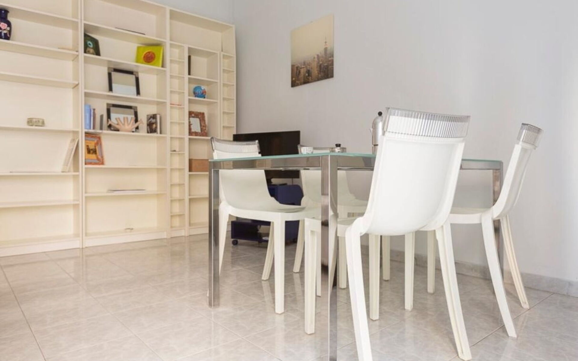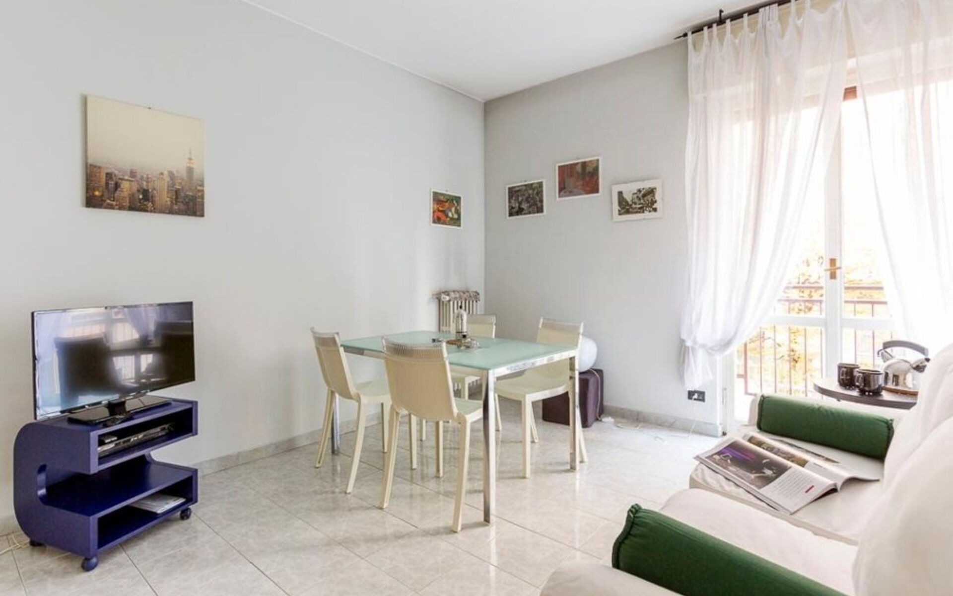 L'appartamento si apre su un ingresso che conduce a tutti gli ambienti; dal soggiorno, che include un tavolo con quattro sedie (Kartell), un divano letto singolo, una libreria e una zona TV, si accede a un lungo balcone che attraversa anche la cucina e la camera da letto.