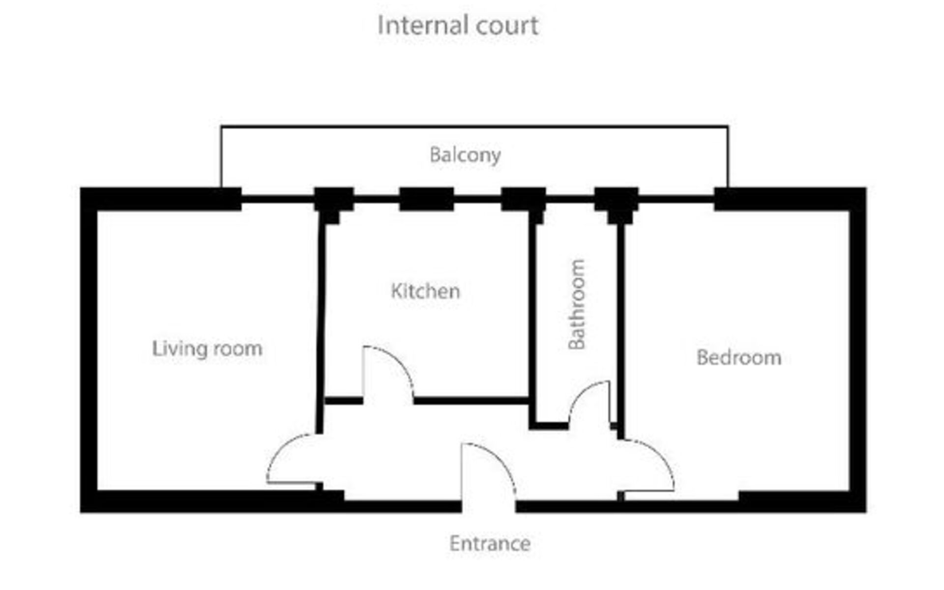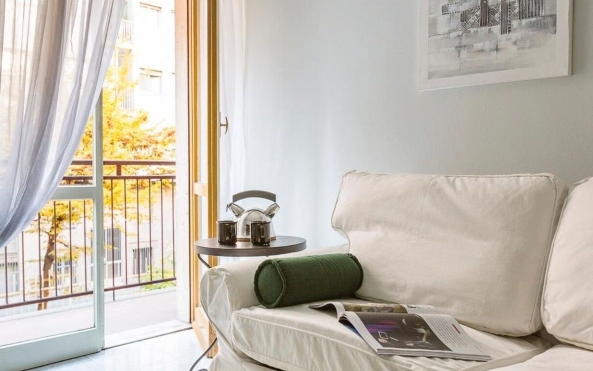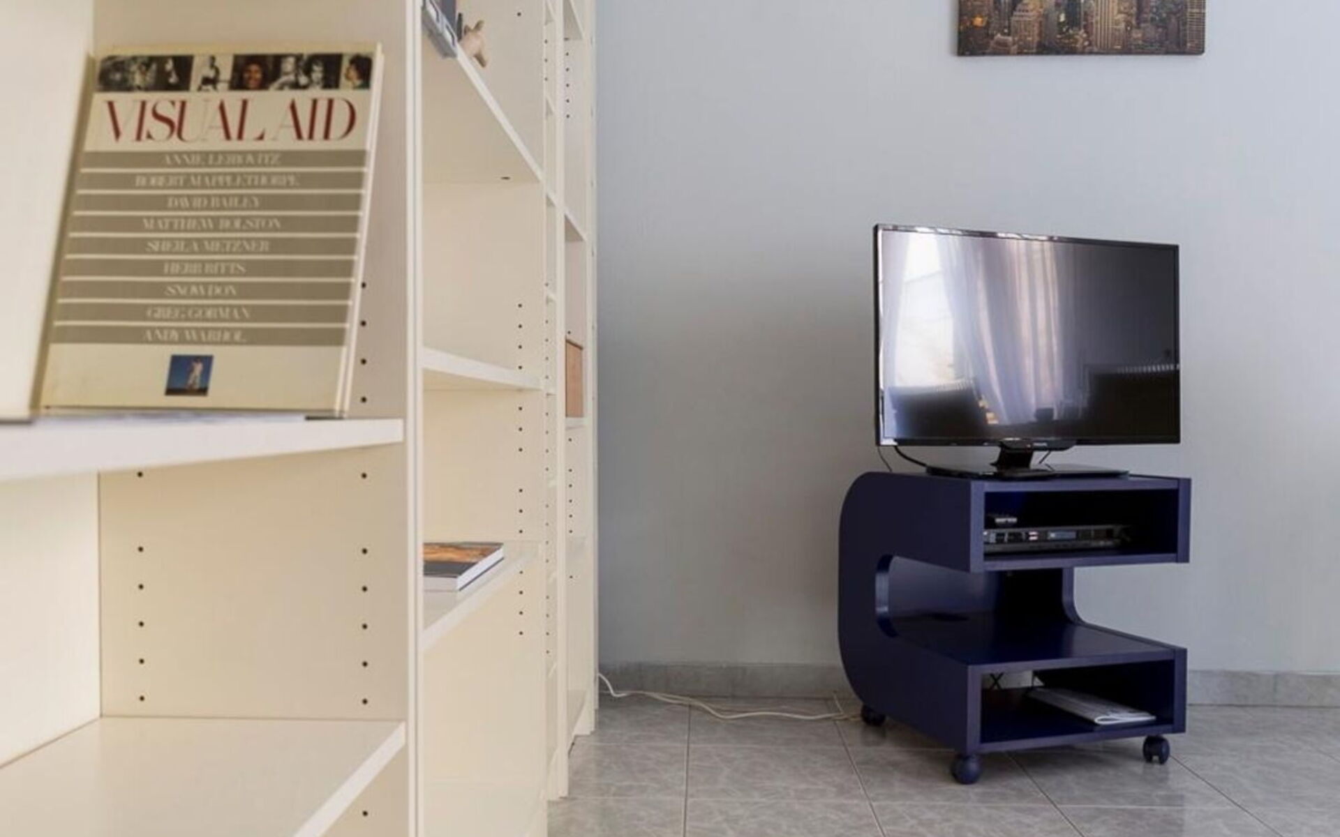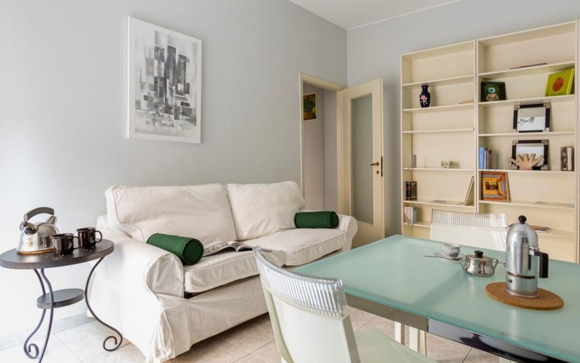 L'appartamento si apre su un ingresso che conduce a tutti gli ambienti; dal soggiorno, che include un tavolo con quattro sedie (Kartell), un divano letto singolo, una libreria e una zona TV, si accede a un lungo balcone che attraversa anche la cucina e la camera da letto.