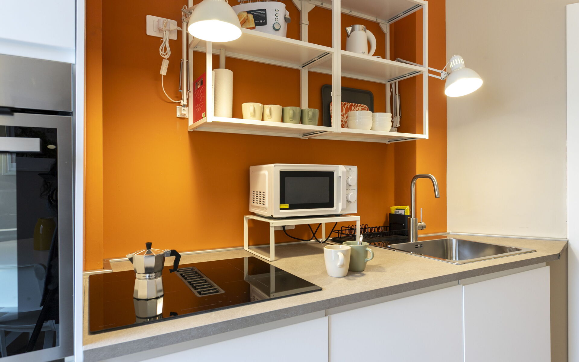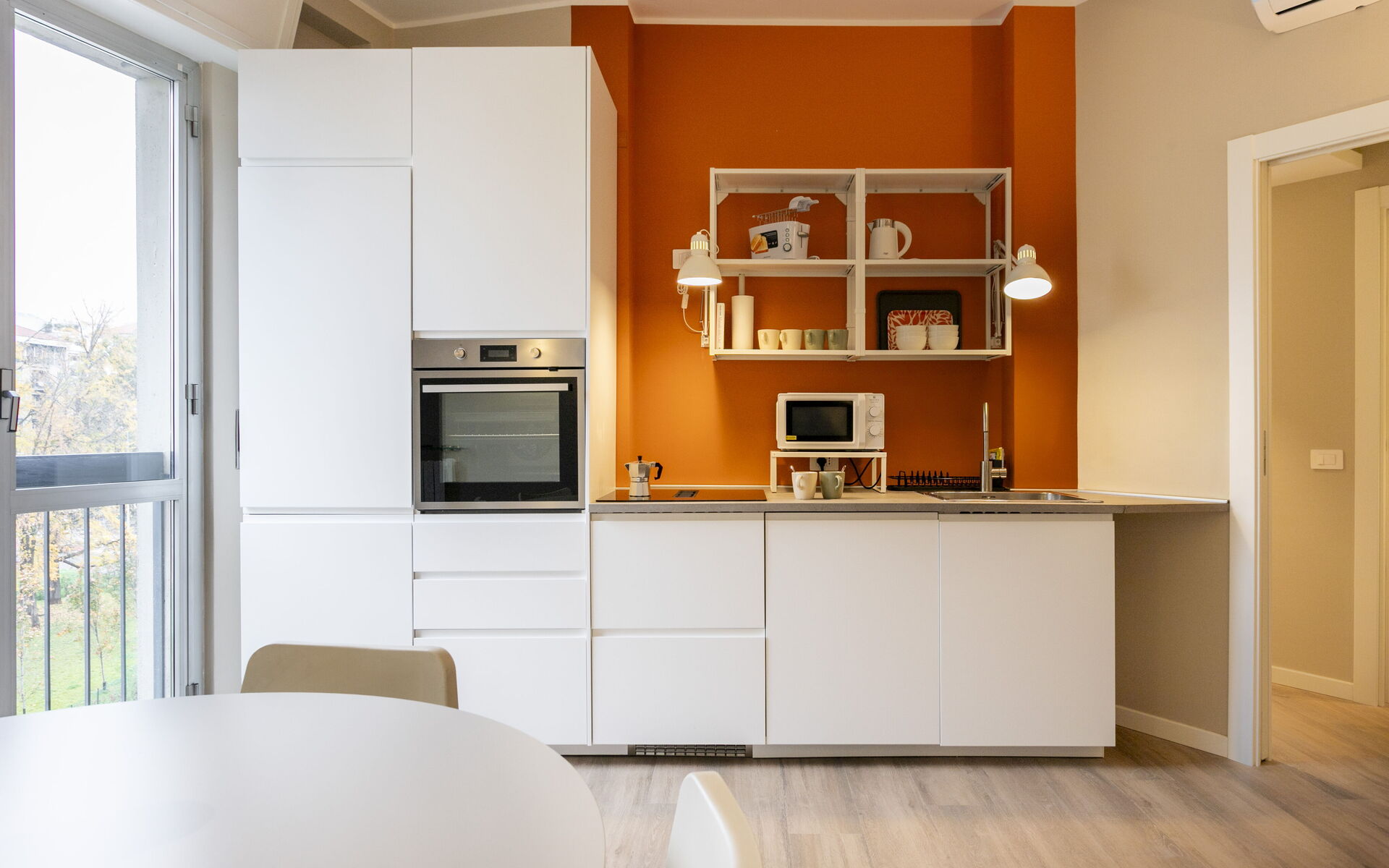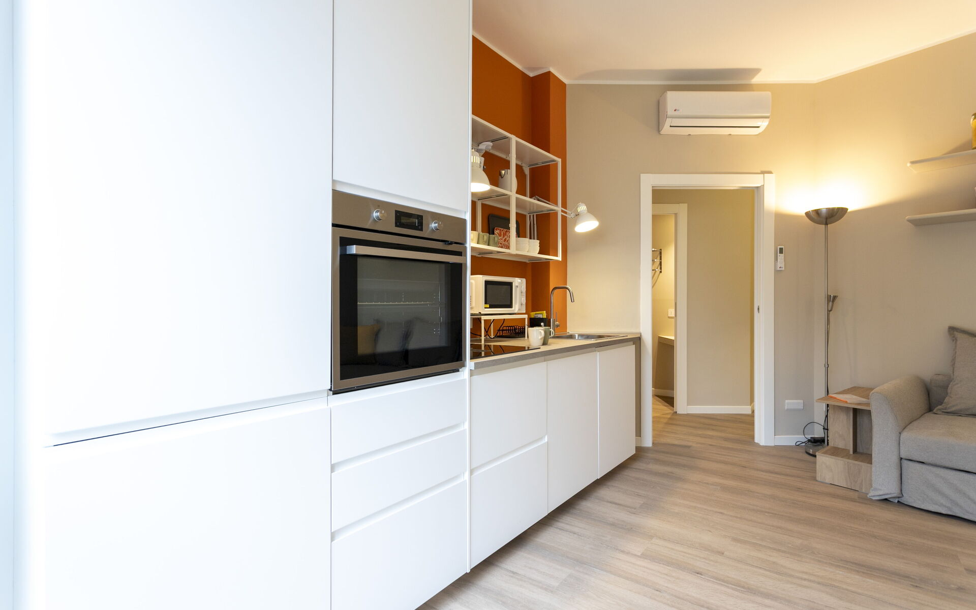 La cucina a vista è completa di piano cottura ad induzione, frigorifero, freezer, forno tradizionale, microonde e lavastoviglie.
