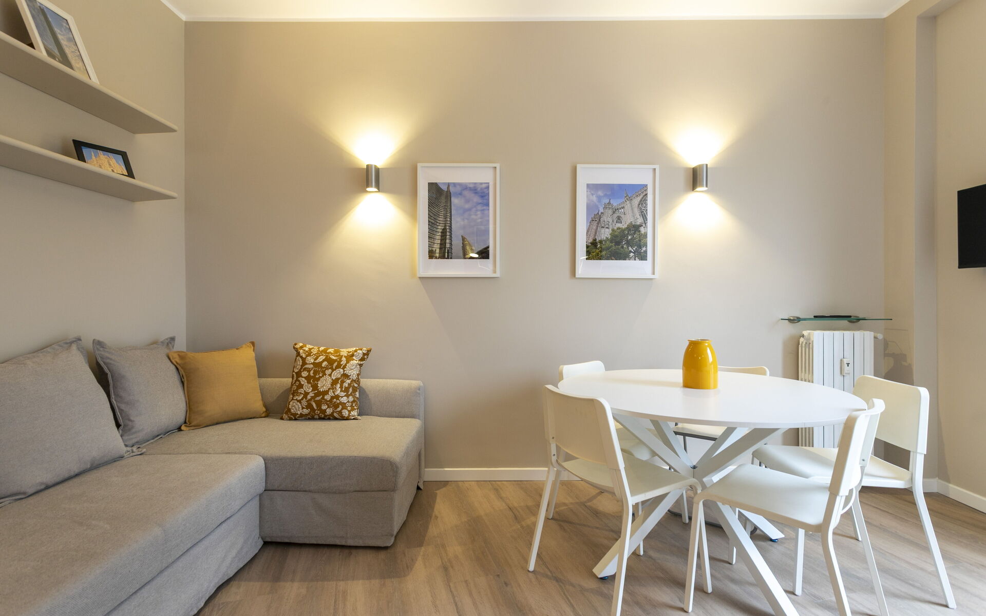 Entrando troviamo la zona giorno con comodo divano letto francese, smart tv e tavolo per 4 persone.