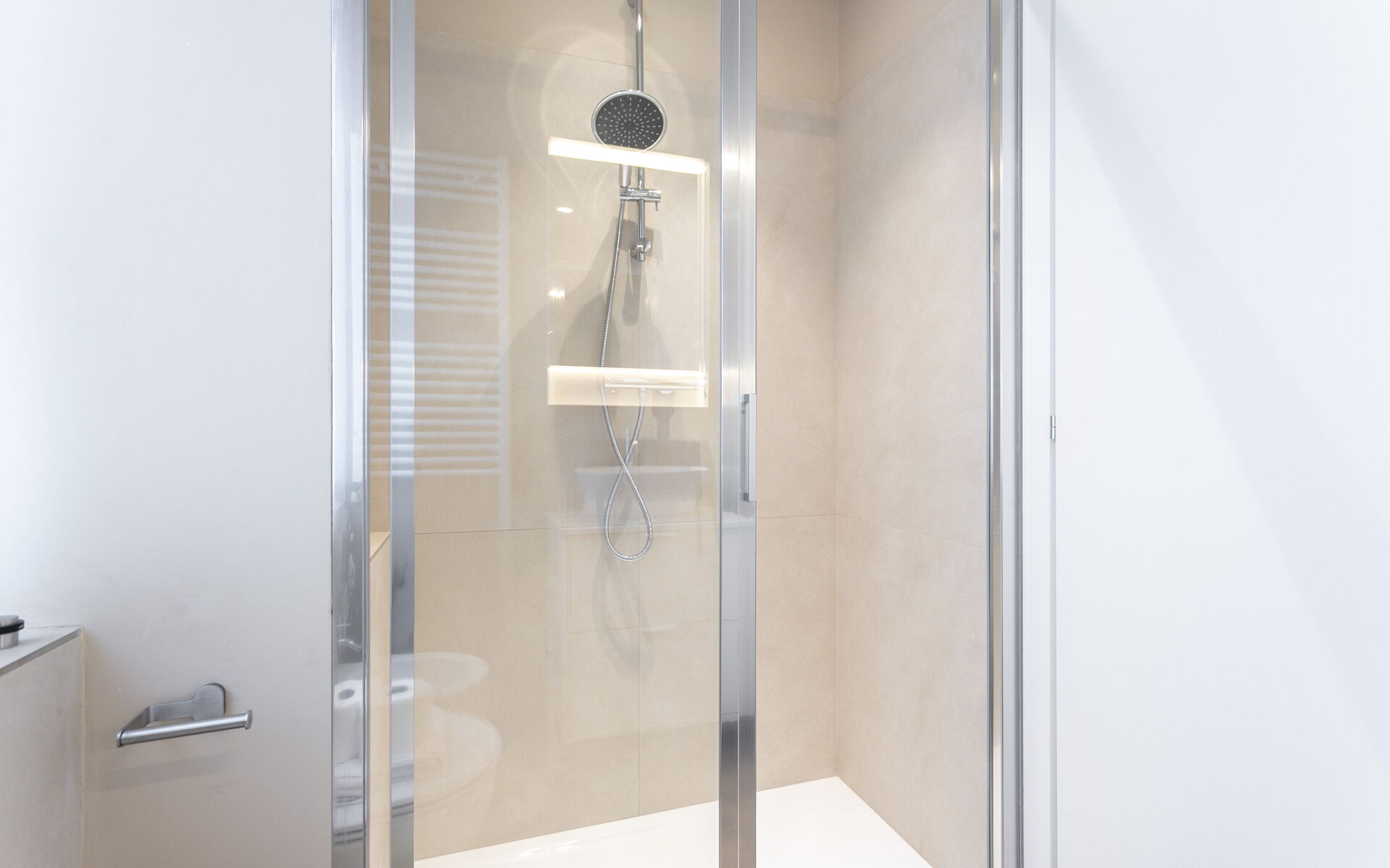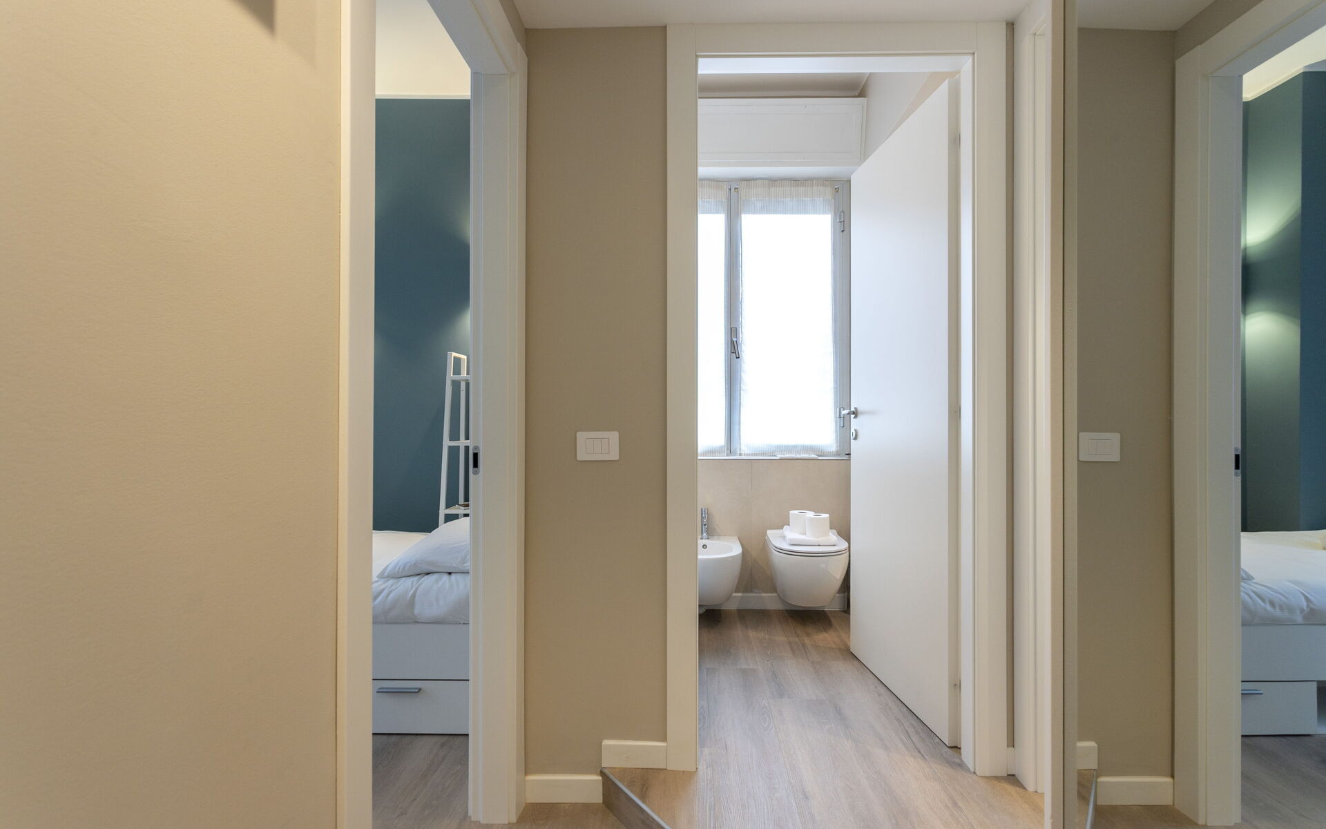 Il bagno principale, finestrato, è dotato di ampio box doccia, lavandino, wc e bidet.