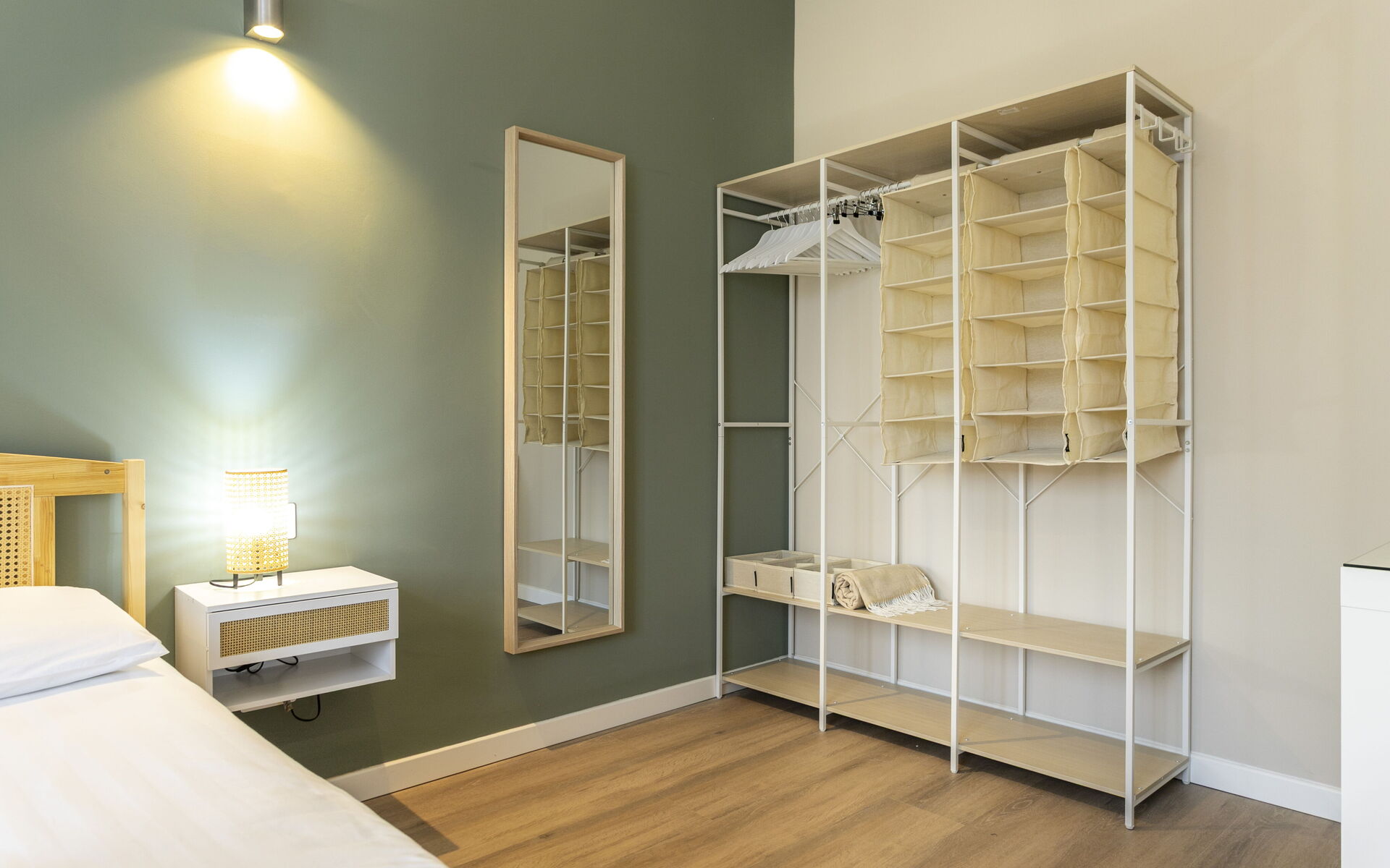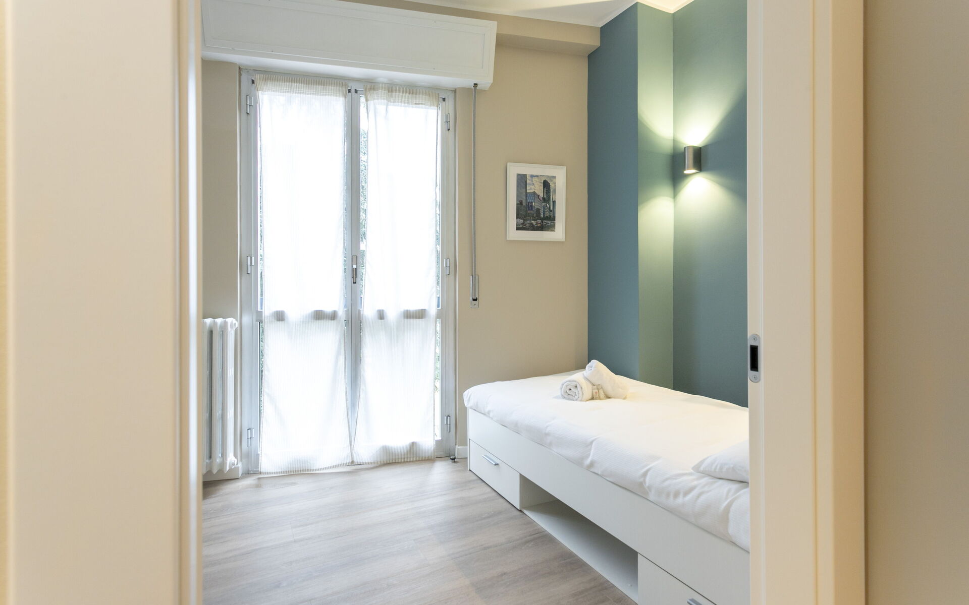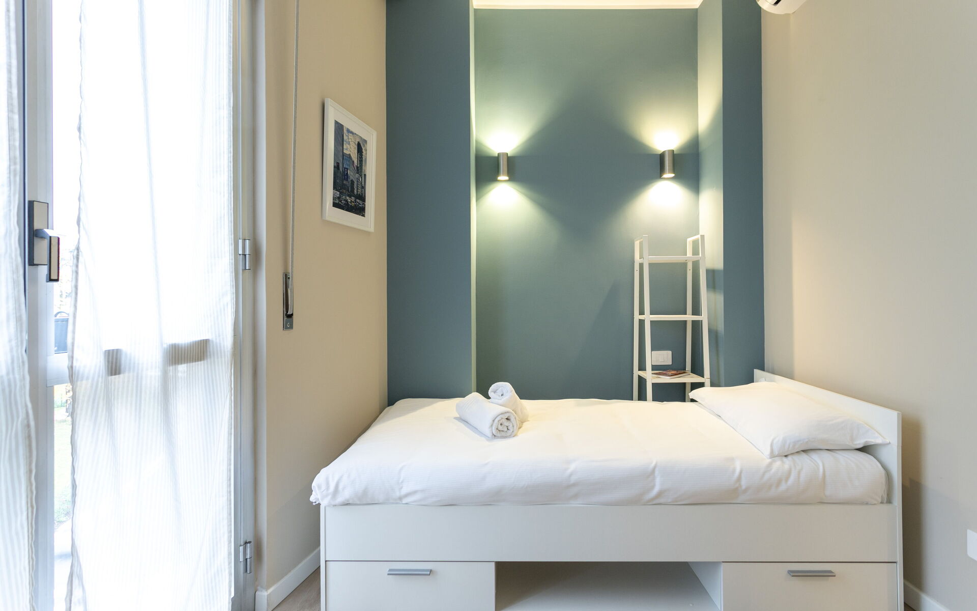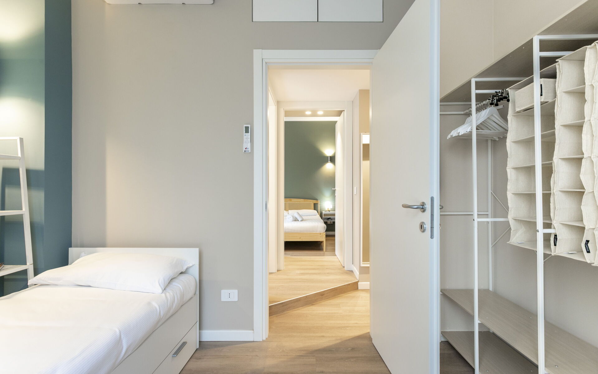 La seconda camera da letto presenta un letto singolo, comodino con abatjour e armadio a vista.