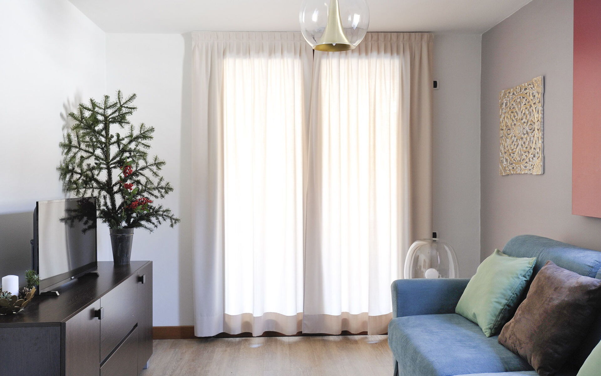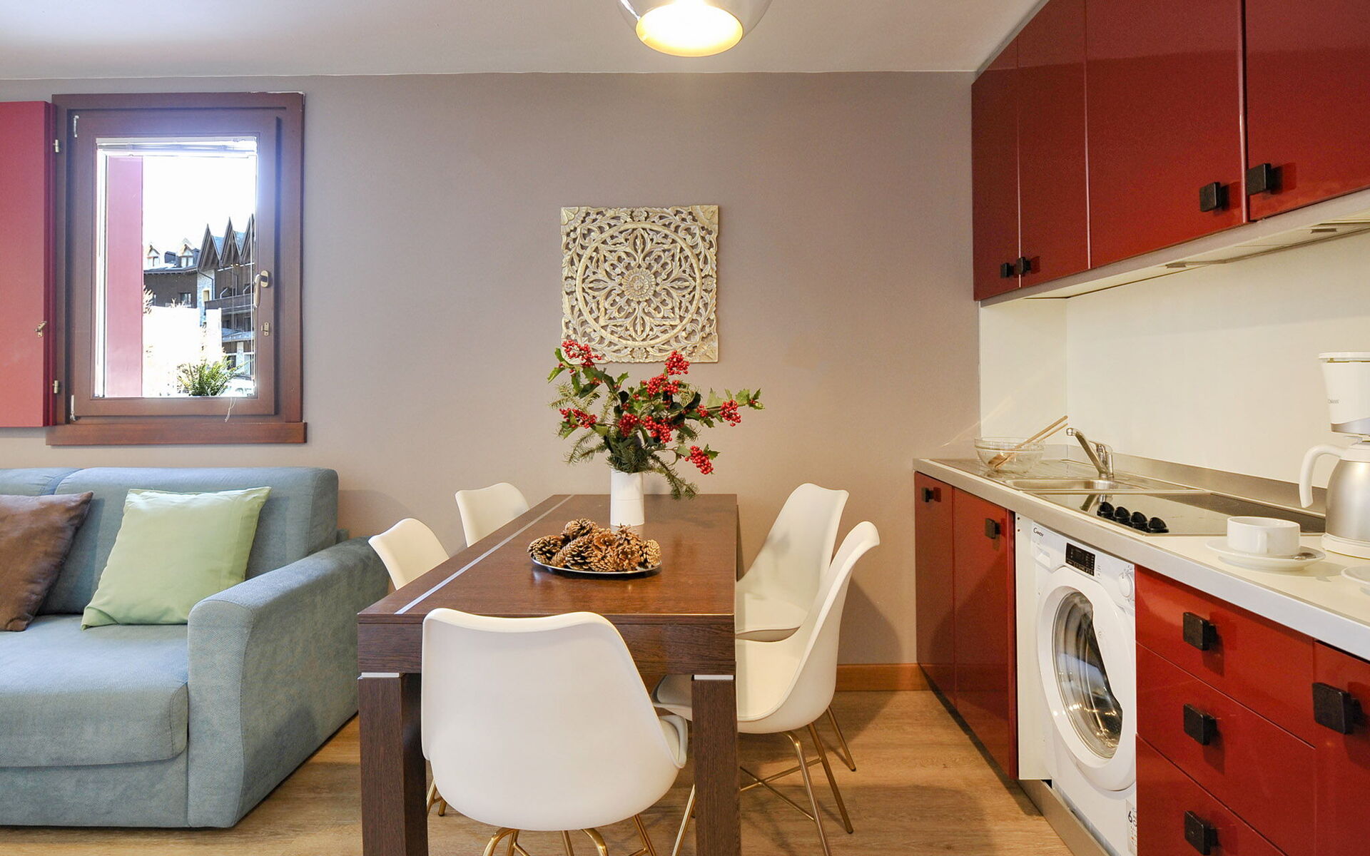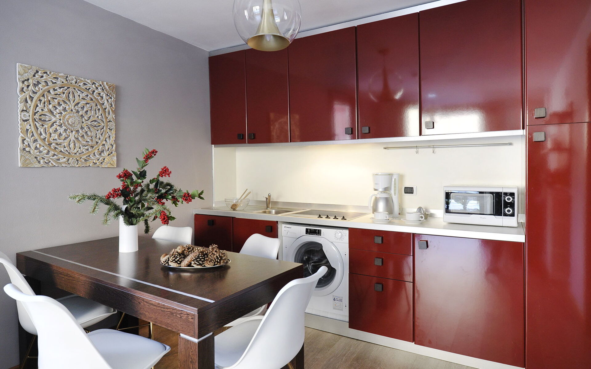 L’appartamento si apre su una zona giorno, con vista sul piccolo giardino della reception e comprende una cucina lineare a vista (con piastre a induzione, microonde, lavatrice, frigorifero e lavastoviglie), una zona pranzo con tavolo in legno con cinque sedie, ed un angolo relax arredato con alcune mensole, un divano letto matrimoniale, tavolino e TV.