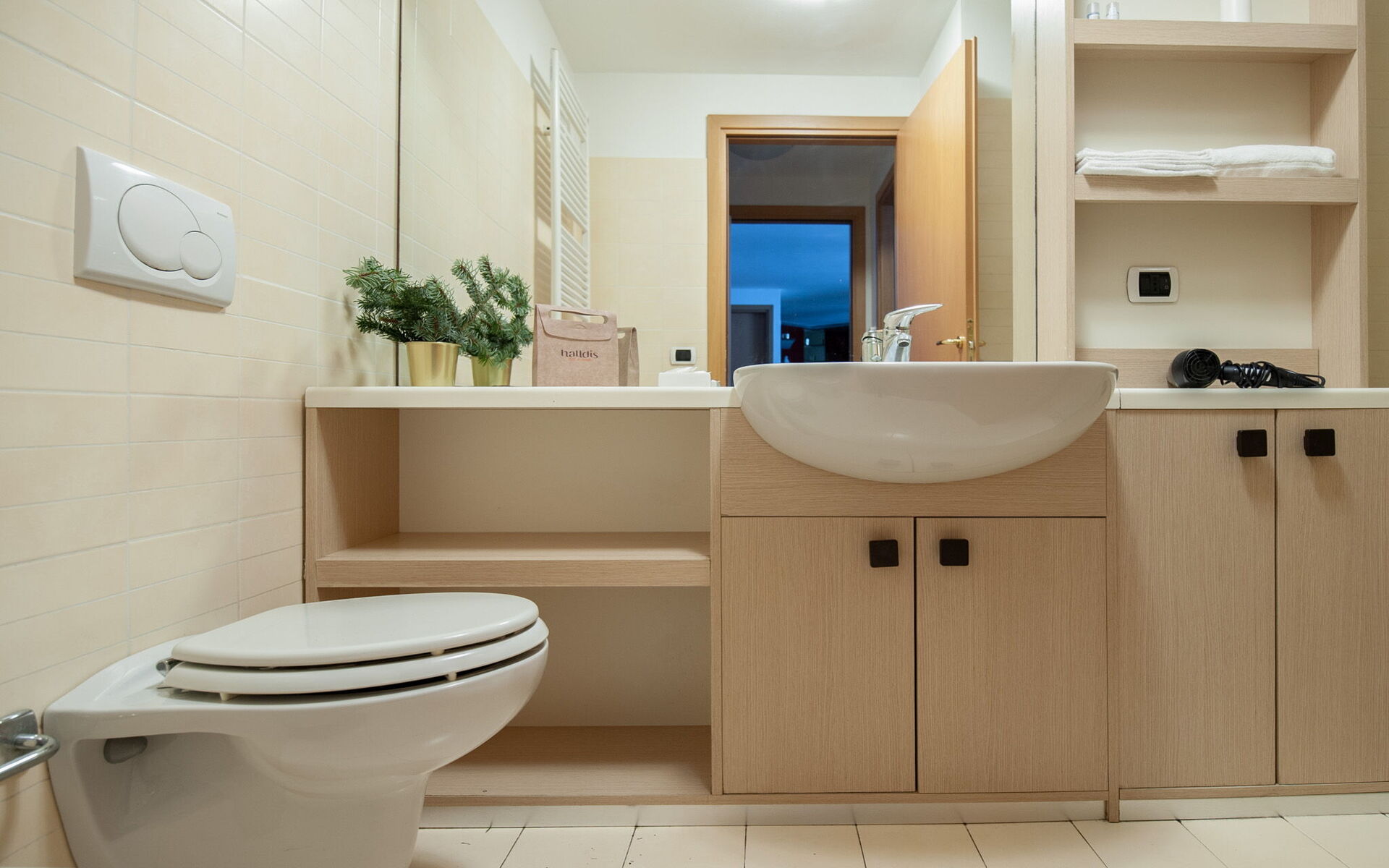 - bagno, dotato di doccia in vetro temperato trasparente e rifiniture in acciaio, WC, bidet e lavabo.