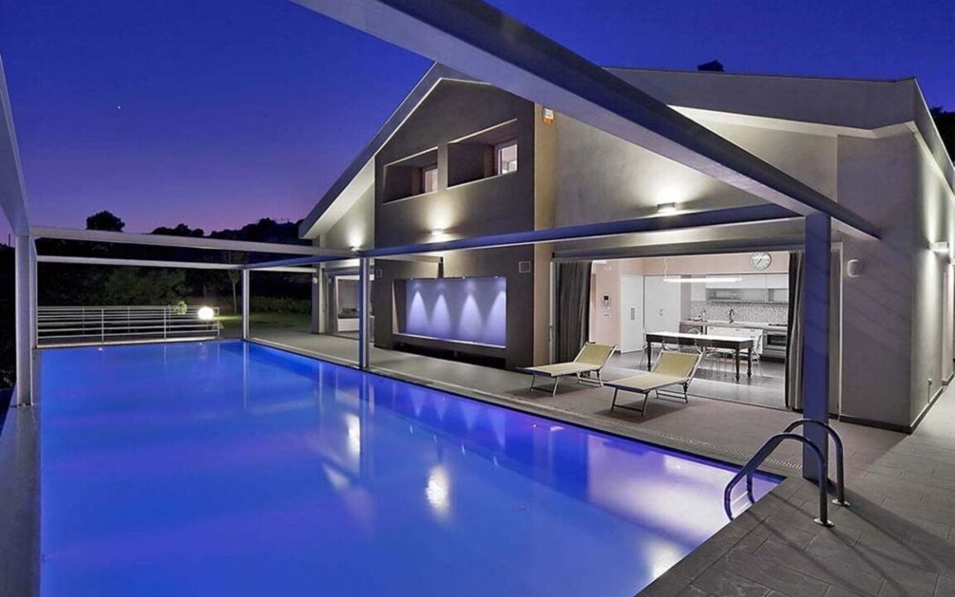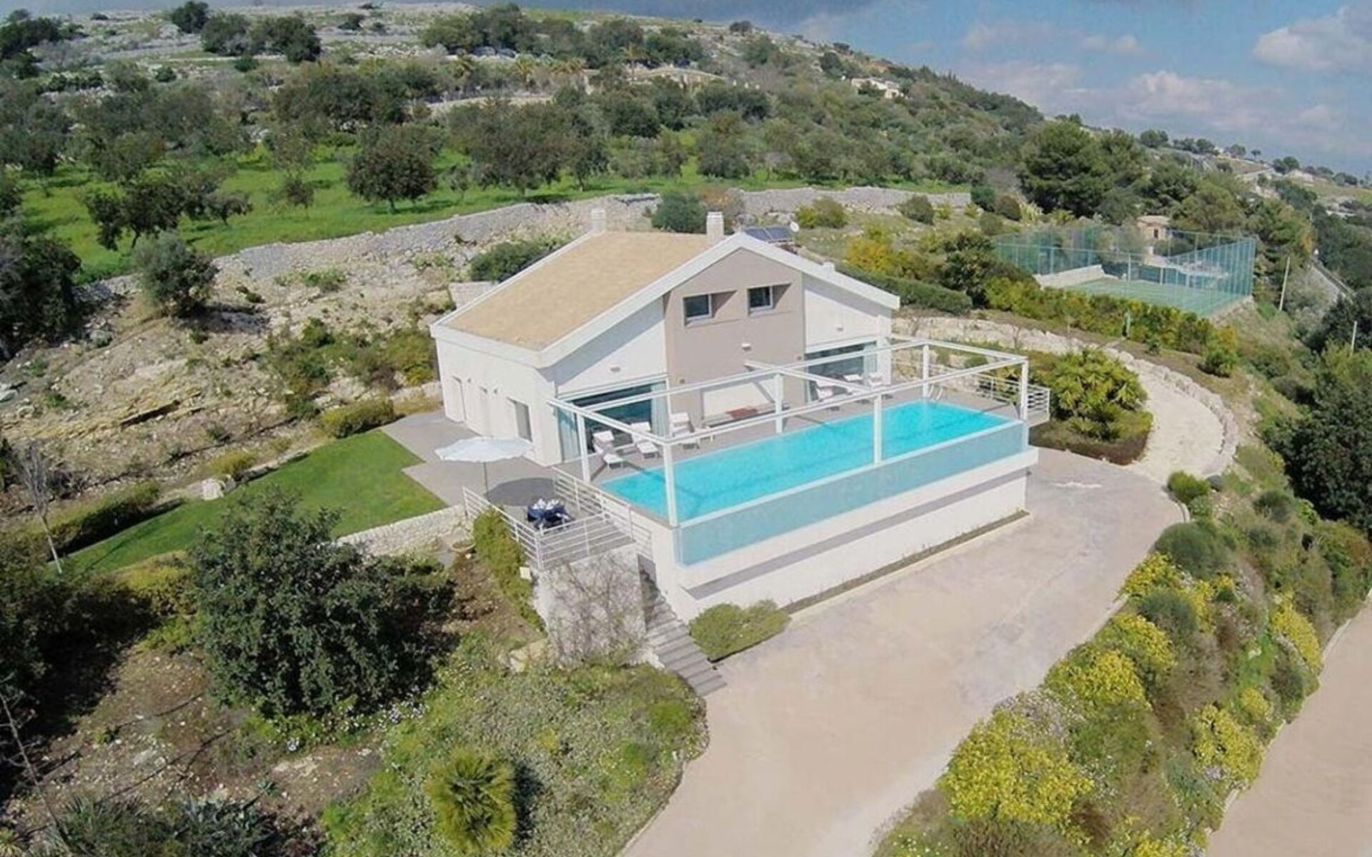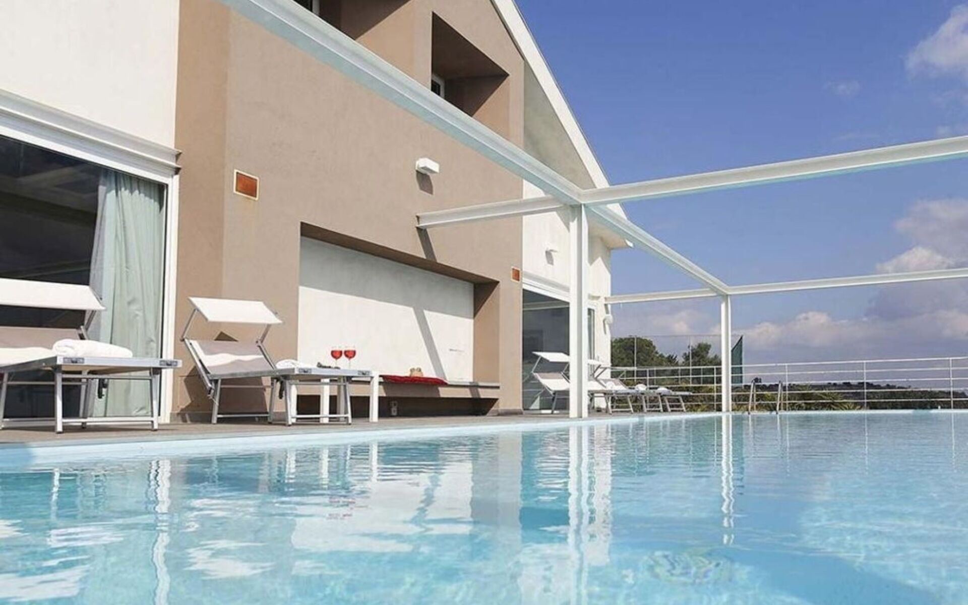 Gli spazi esterni sono impreziositi da una veranda con piscina panoramica a sfioro (7x10 m), illuminata di sera e dotata di lettini prendisole e casse acustiche per la filodiffusione. Da qui si ammirano paesaggi mozzafiato e viste spettacolari sulla vallata e sul tratto di costa che da va da Marina di Ragusa a Cava d'Aliga.