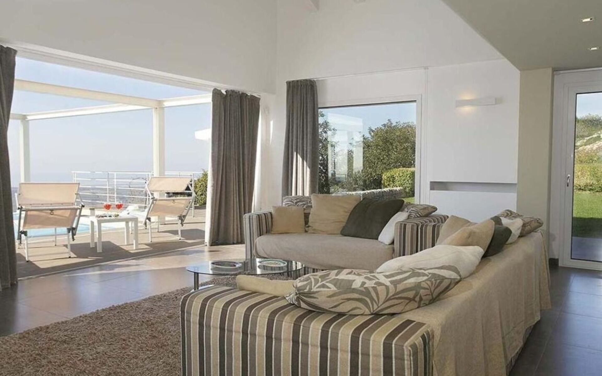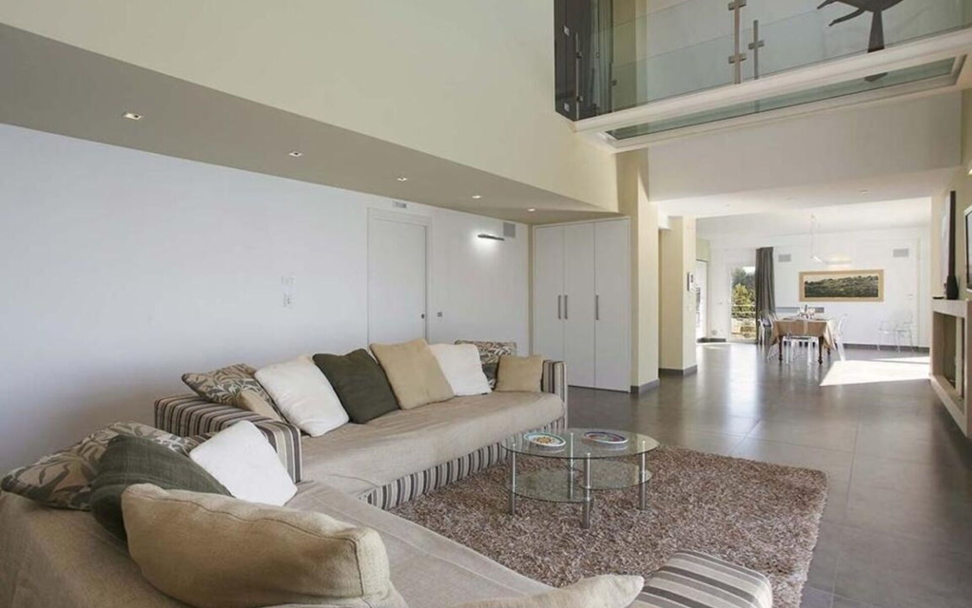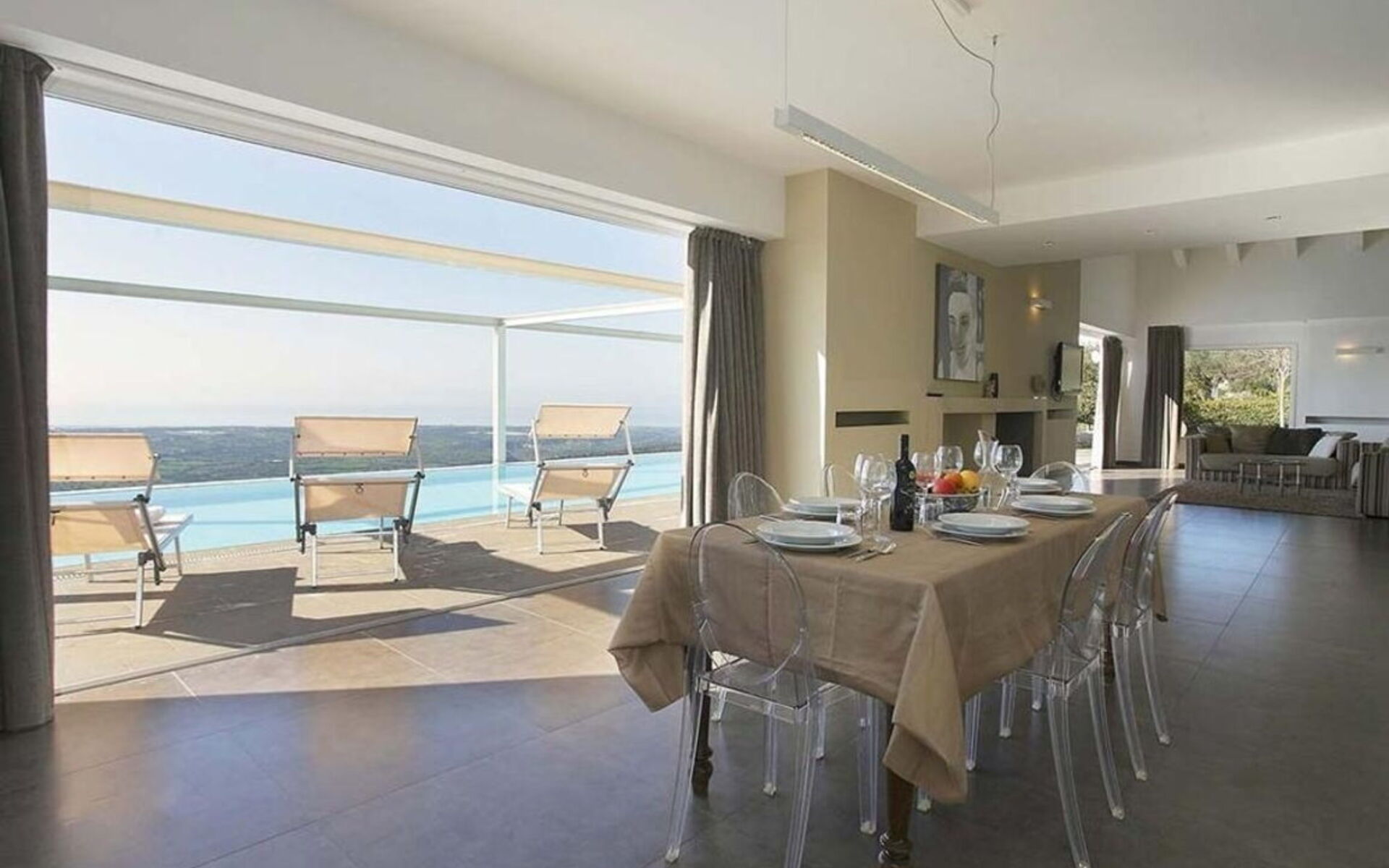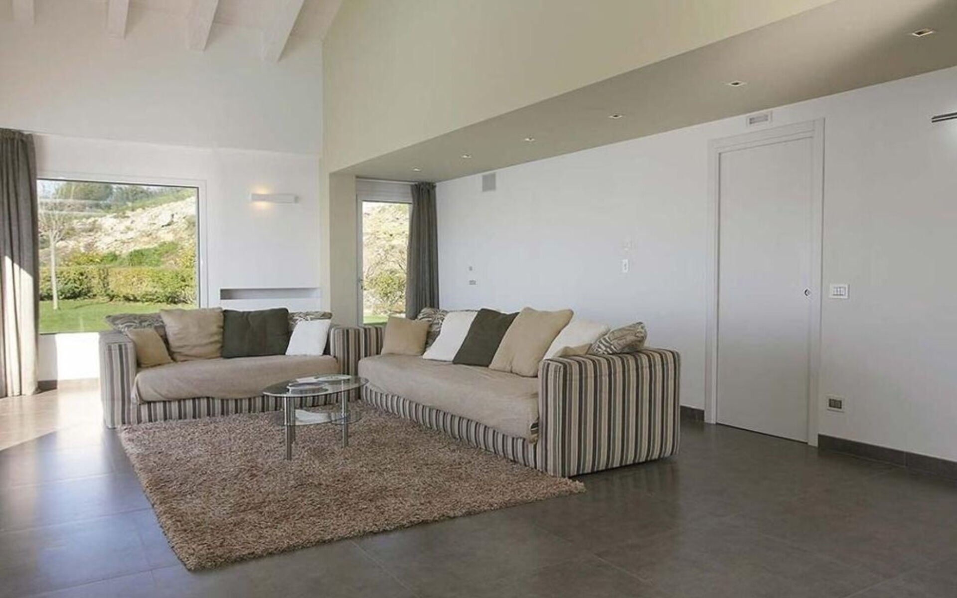 Piano terra: Al piano terra troviamo un'ampia e luminosa area living, con accesso diretto alla veranda e alla piscina, arredata in stile minimal e, al contempo, elegante, con comodi divani (tra cui un divano letto singolo), mobili di design, tv satellitare a parete (Sky), camino e tavolo da pranzo per 8 persone. Il soggiorno gode di una vista meravigliosa sulla piscina e sull'intera vallata, grazie ad un'ampia vetrata panoramica.