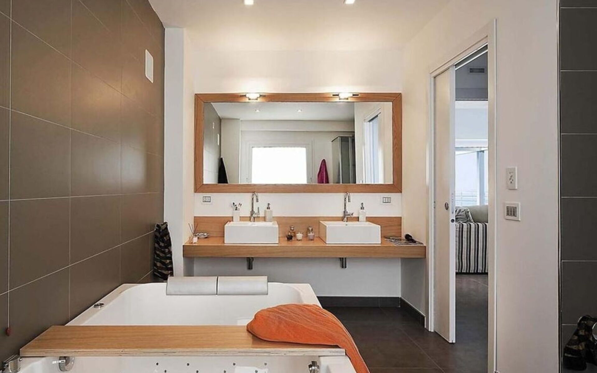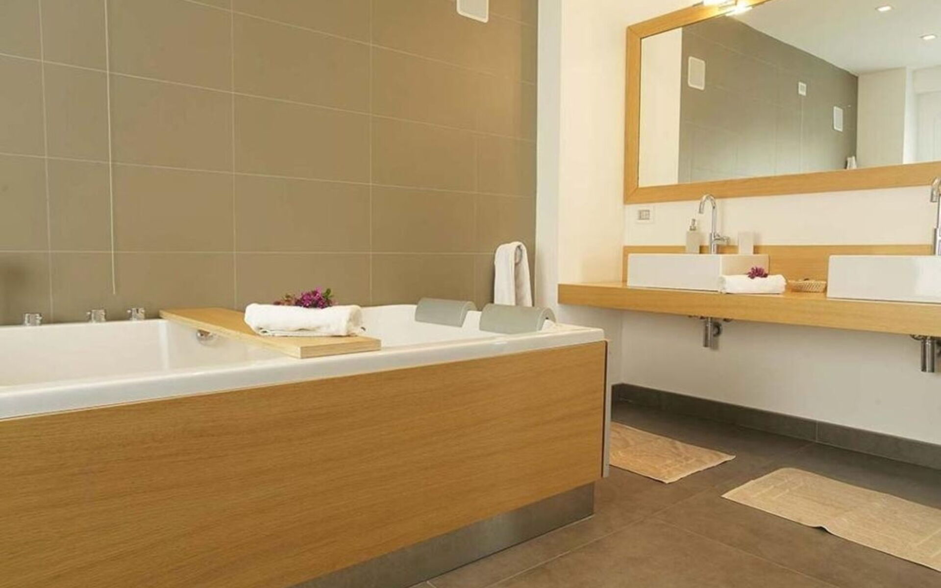 Al primo piano si trova un bagno ensuite wellness composto da un doppio lavandino, un box doccia idromassaggio e una vasca idromassaggio.