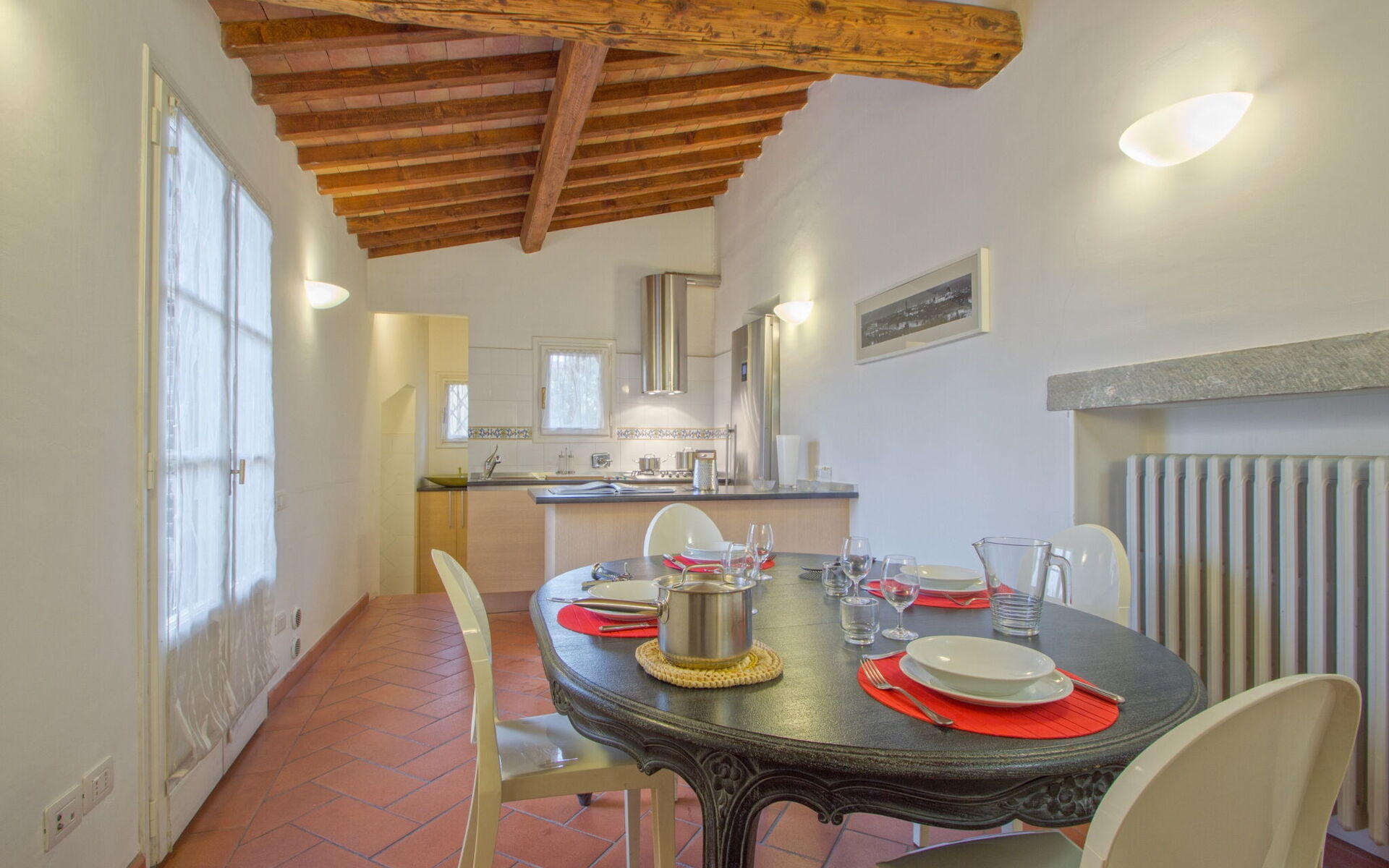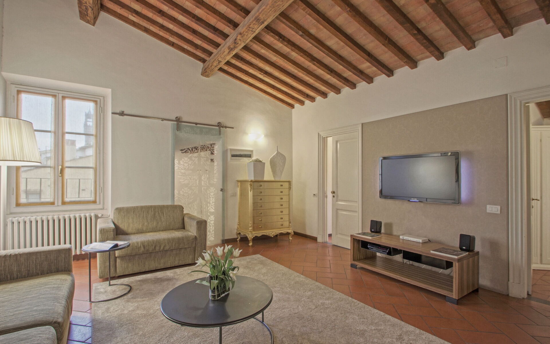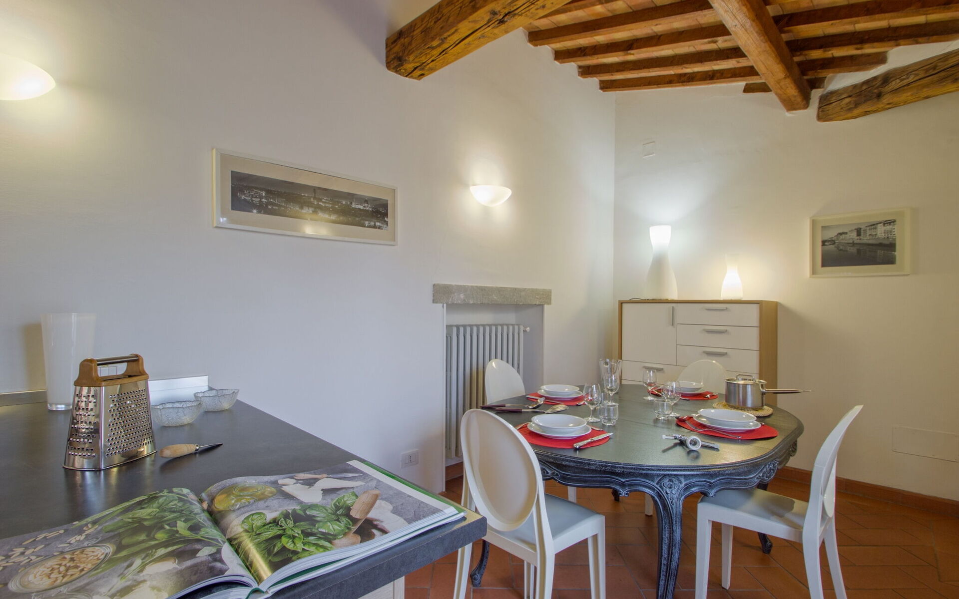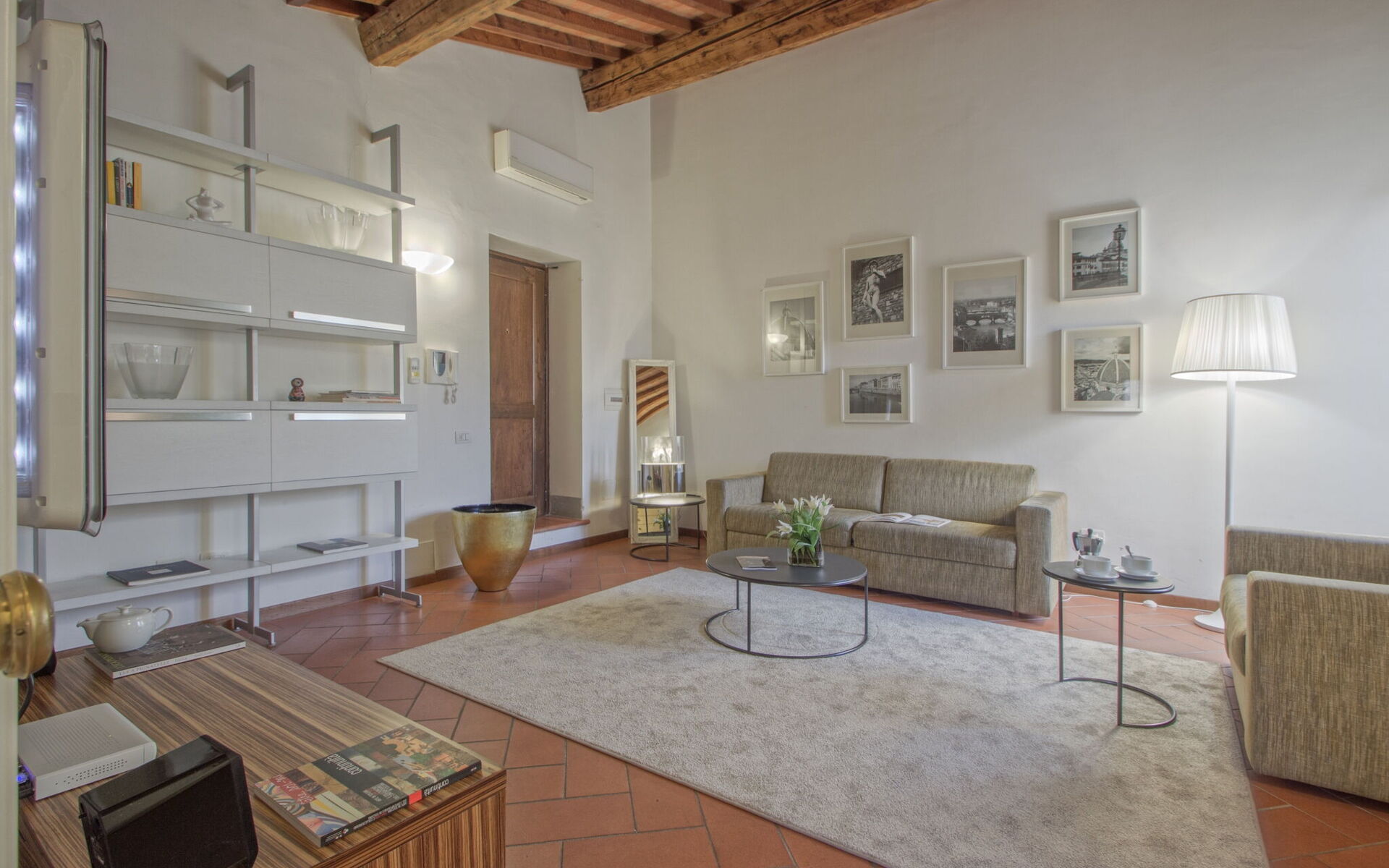 I pavimenti in cotto e il soffitto con travi a vista conferiscono all’appartamento un’atmosfera calda e tipicamente fiorentina.