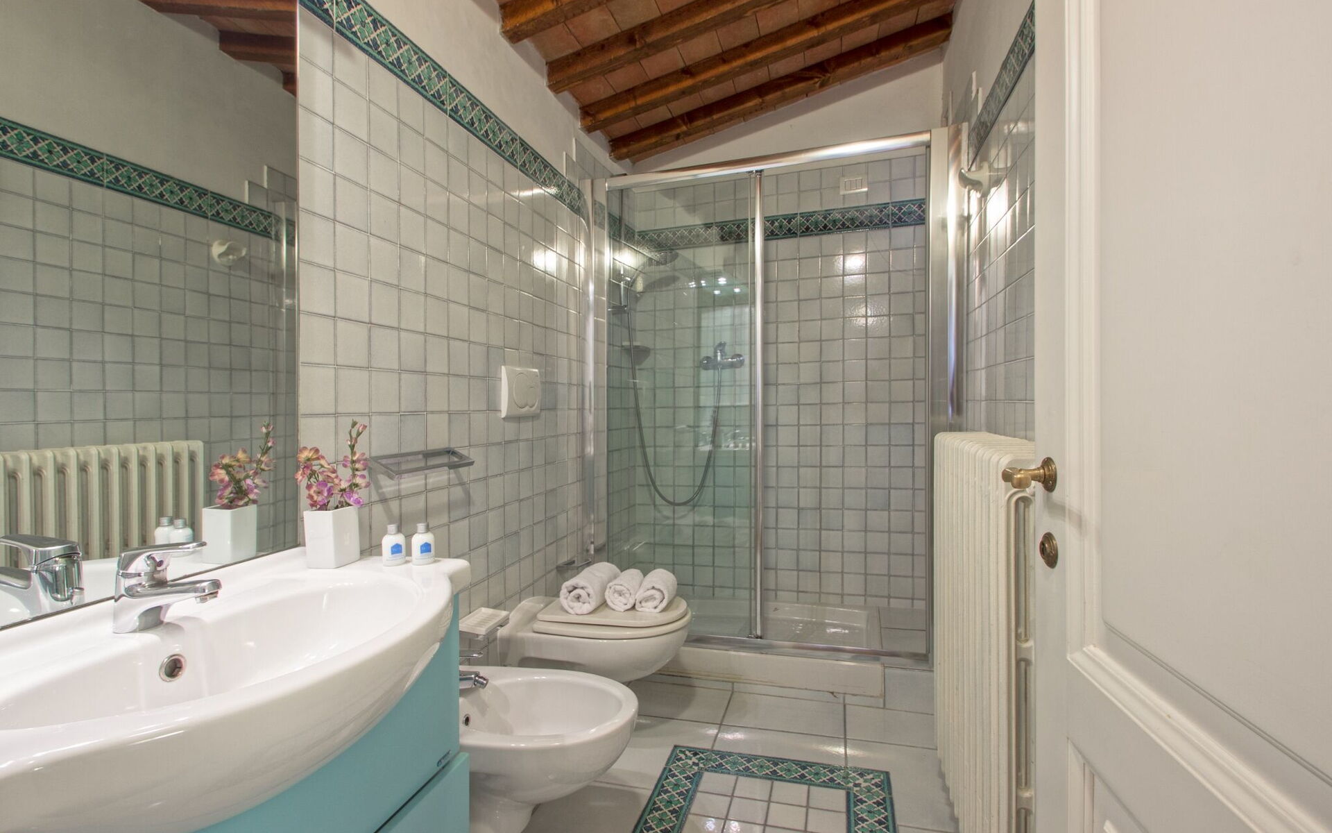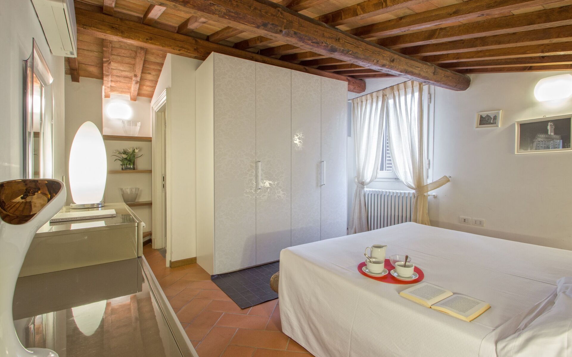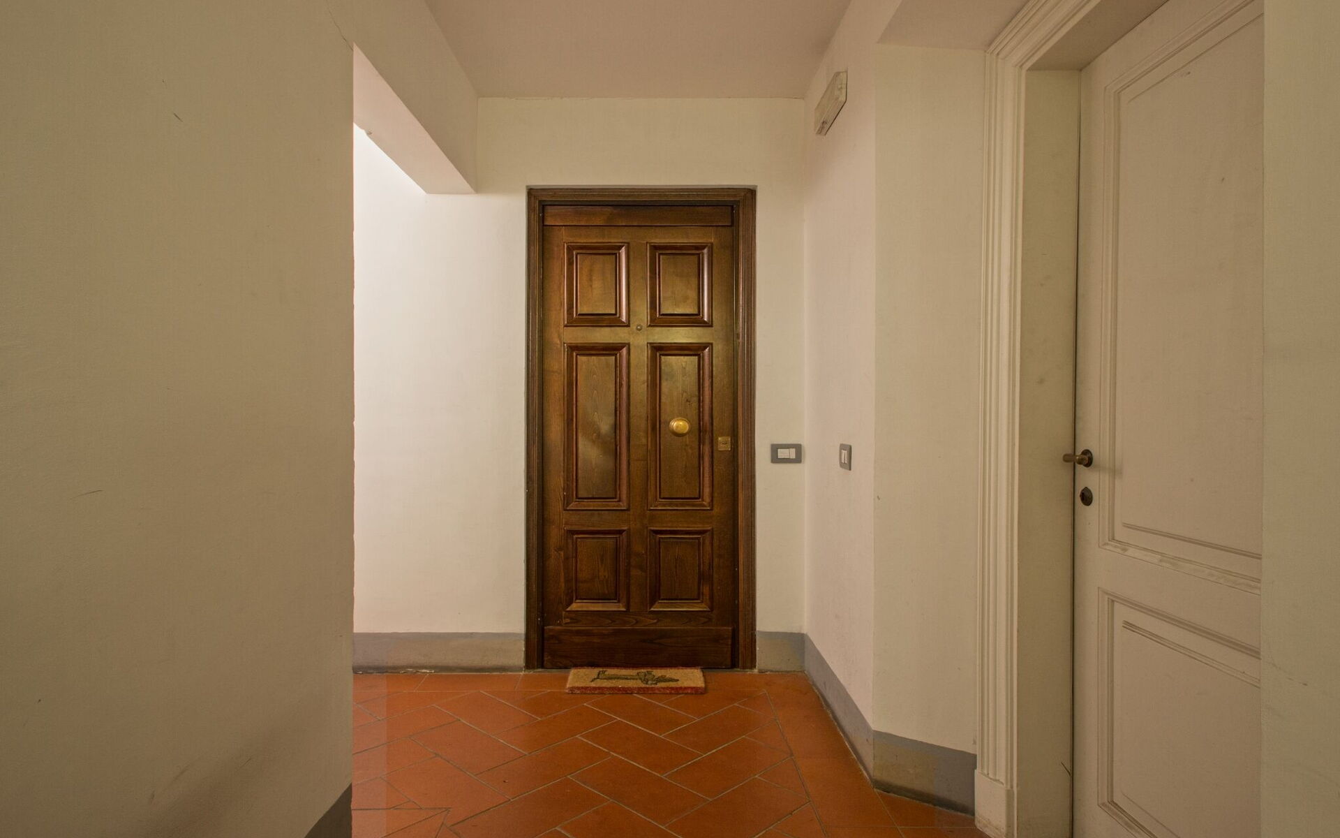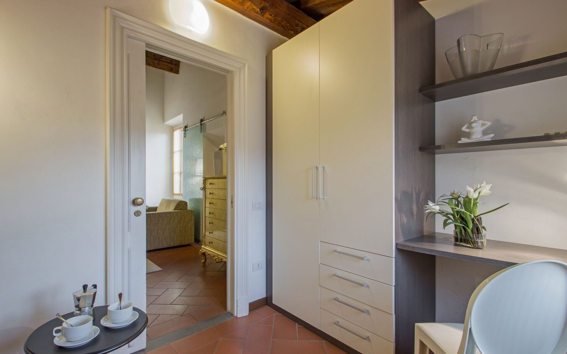 I pavimenti in cotto e il soffitto con travi a vista conferiscono all’appartamento un’atmosfera calda e tipicamente fiorentina.