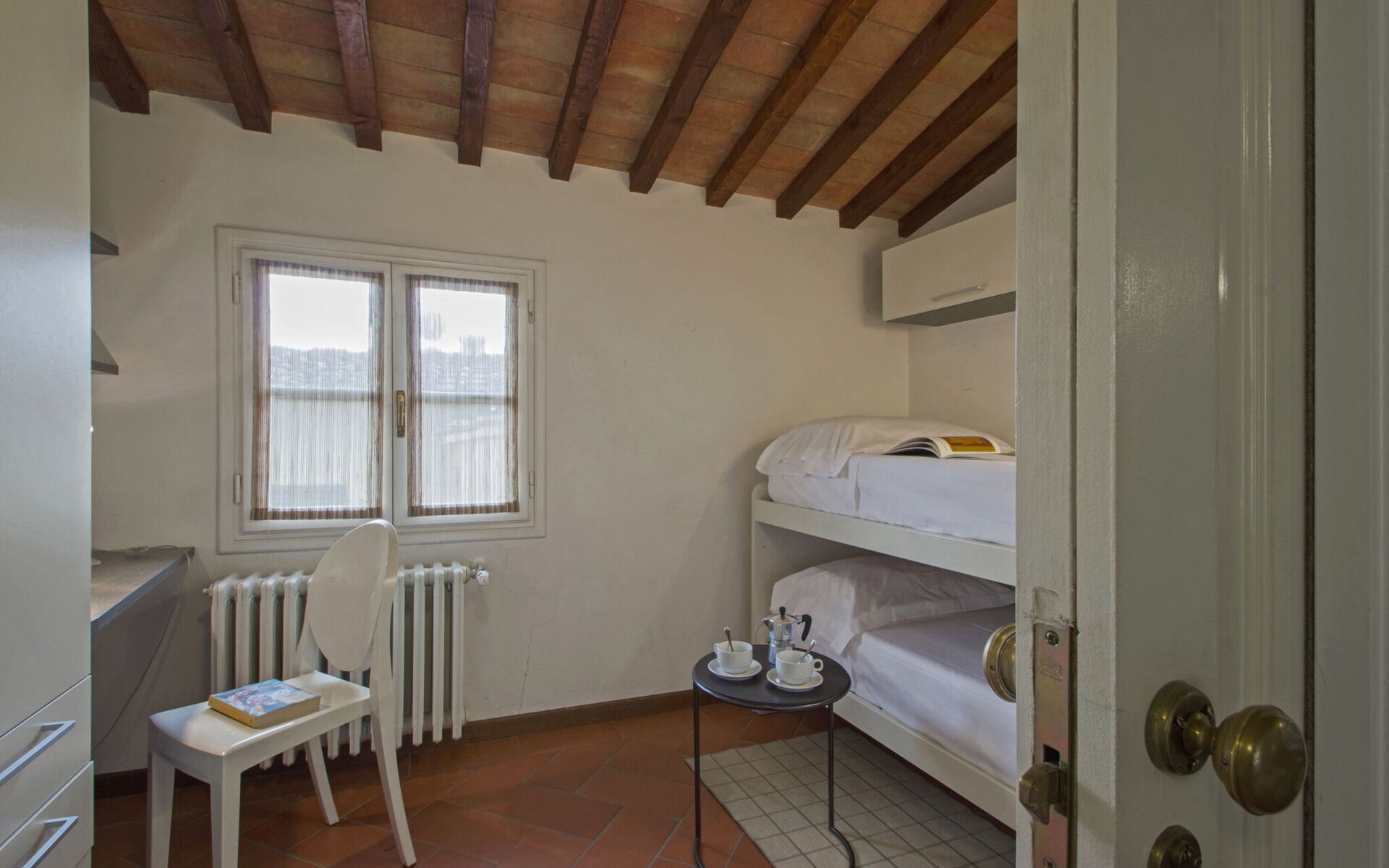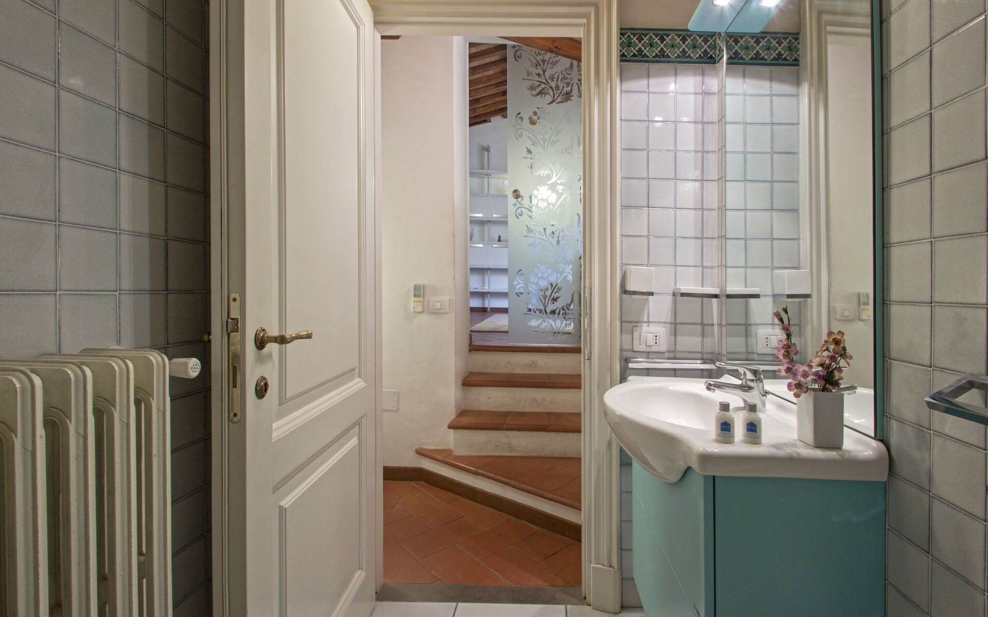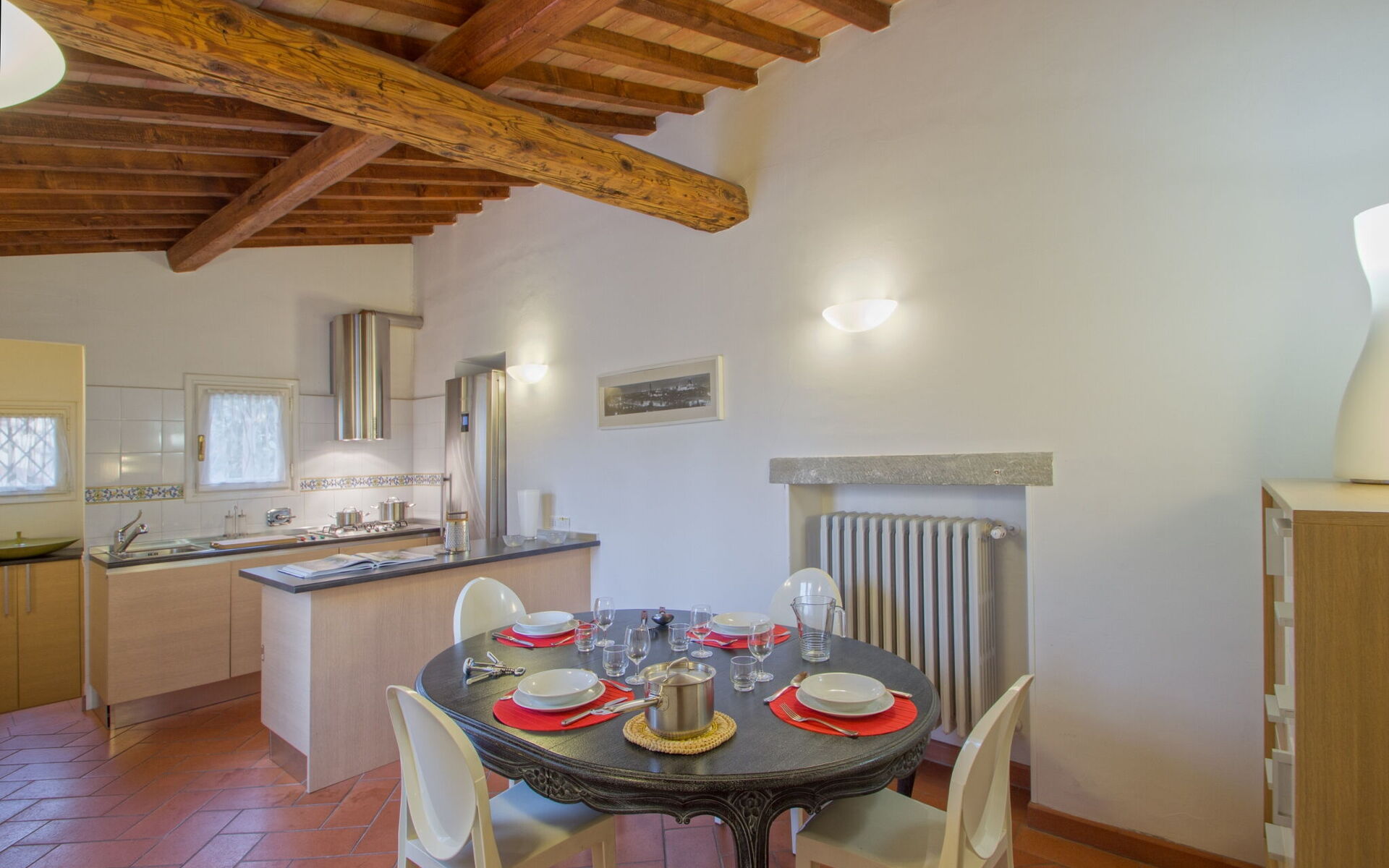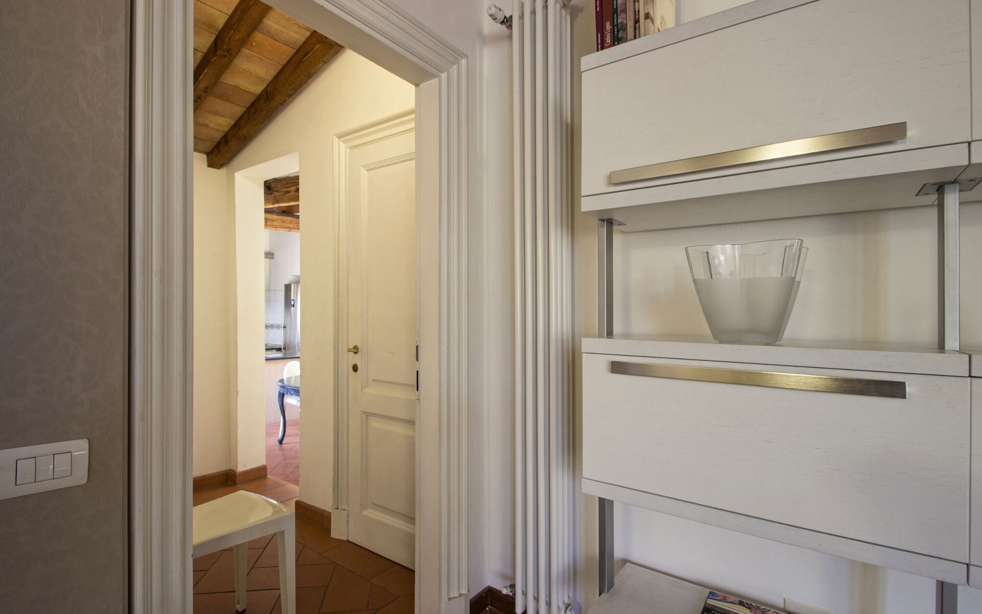 I pavimenti in cotto e il soffitto con travi a vista conferiscono all’appartamento un’atmosfera calda e tipicamente fiorentina.